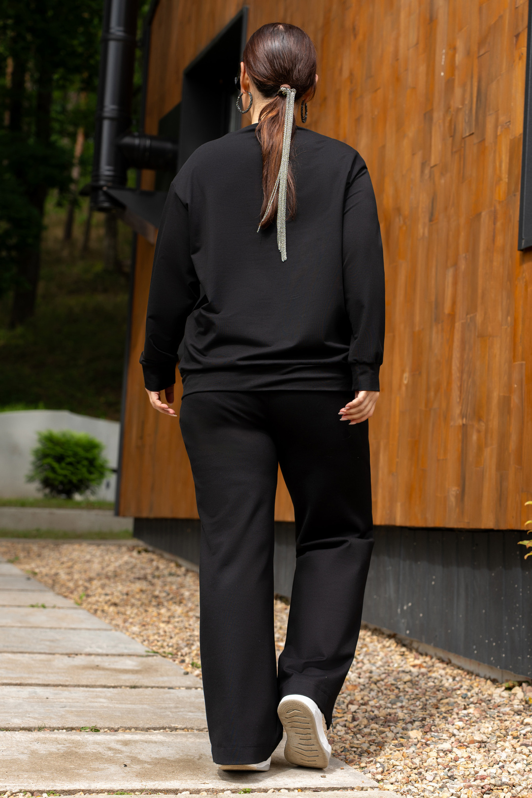 Костюм женский джемпер и брюки из трикотажа. Джемпер прямого кроя с вставками из отделочной ткани и молнией, полочка с прорезными карманами.Джемпер с притачными рукавами и манжетами. Брюки женские прямого силуэта, пояс на резинке.Боковые карманы на молниях.По низу брюк обработаны разрезы на молниях.