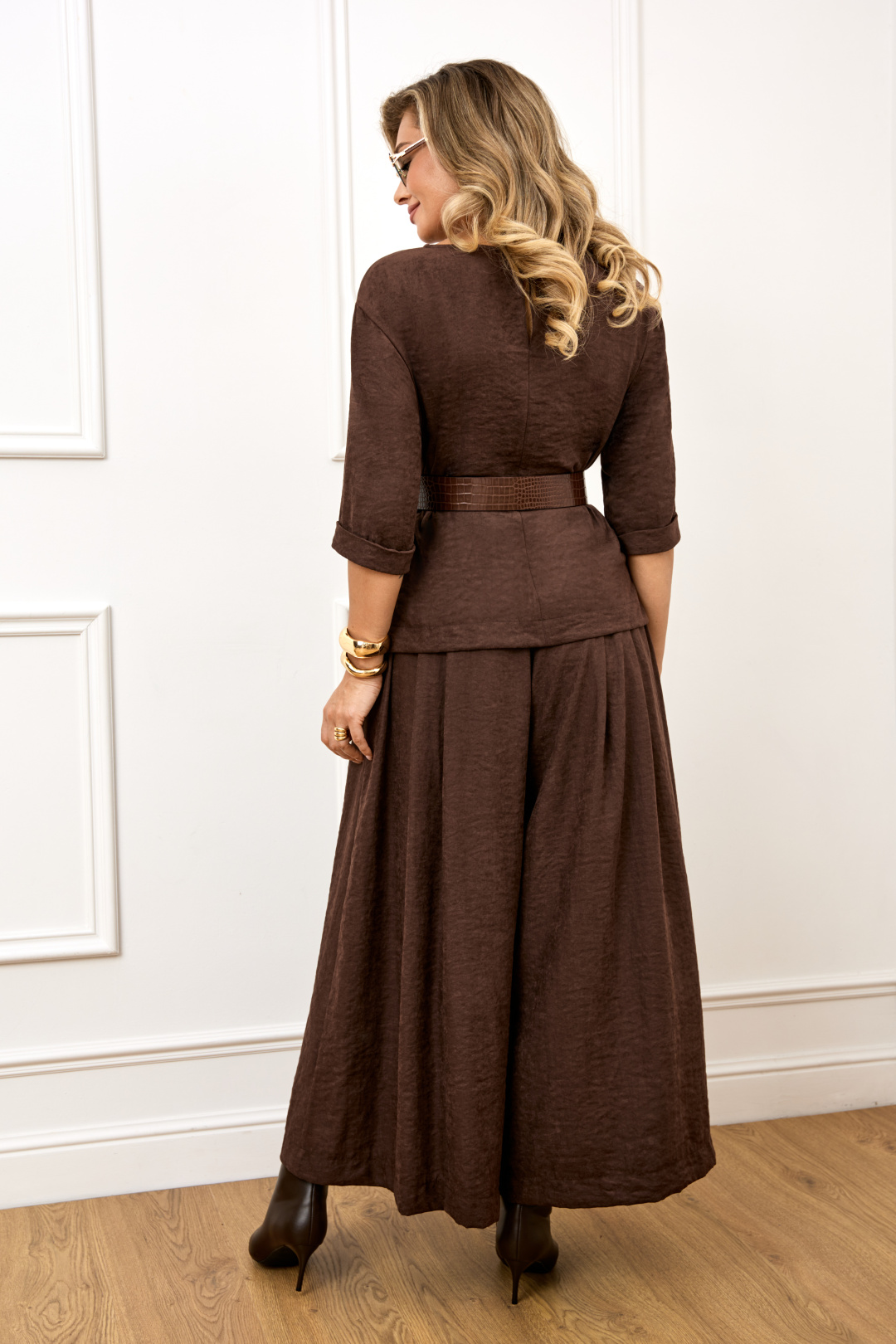 Стильный женский комплект, состоит из блузы и брюк-юбки. Блуза прямого силуэта с эффектом жатки, что придаёт изделию особый стиль. Блуза с нагрудными выточками, рукав длиной ¾, с манжетой, по бокам с небольшими разрезами (разрез 9 см). Перед блузки декорирован пришивной дизайнерской нашивкой. Брюки-юбка прямые, со складками по переду и спинке с эффектом жатки. Брюки-юбка на поясе, по бокам с резинкой, по спинке с застежкой на потайную молнию и пуговицу. В комплекте идет съемный кожаный пояс.