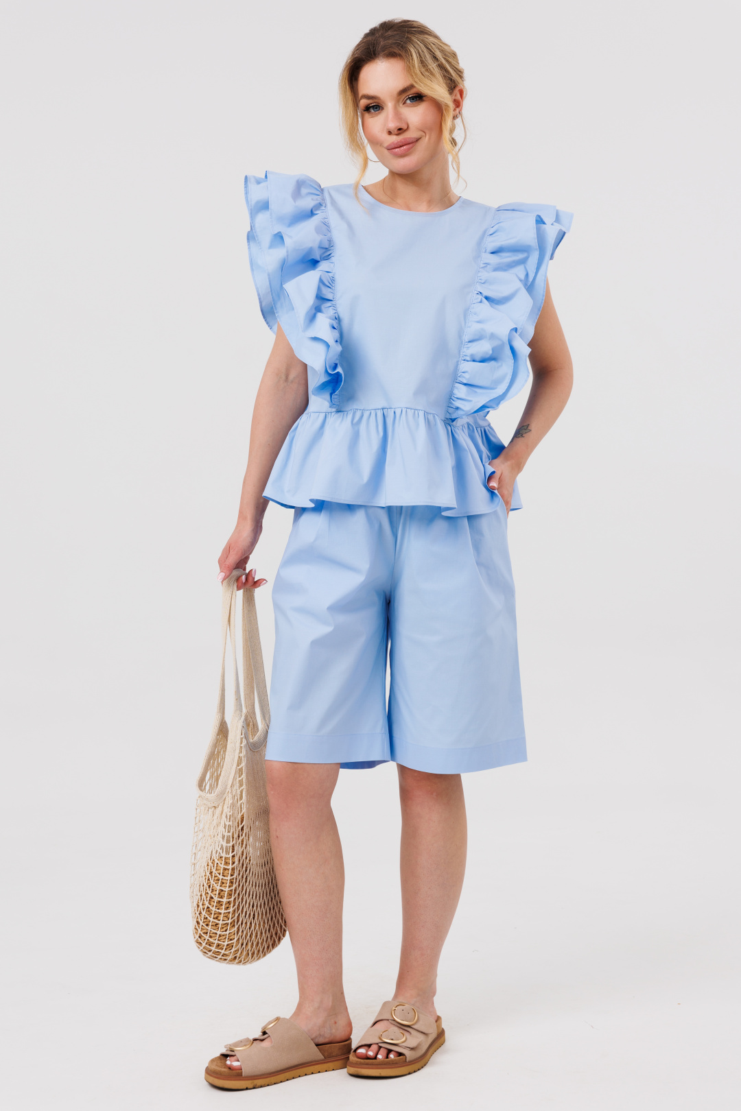 Элегантная женская блузка нежно-голубого цвета представляет собой идеальное сочетание модного дизайна и комфорта. Основным элементом этой блузки является её свободный силуэт с рюшей по линии талии, который добавляет изысканности. Дополнительный объём придают две притачные рюши на рельефах лифа спереди и сзади, усиливающие воздушность образа. Вырез "Капелька" на спинке с застежкой на кнопку не только красиво смотрится, но и обеспечивает удобство при надевании. Такая блузка станет прекрасным выбором для создания как повседневного, так и более торжественного образа, благодаря своему стильному крою и привлекательной цветовой палитре.