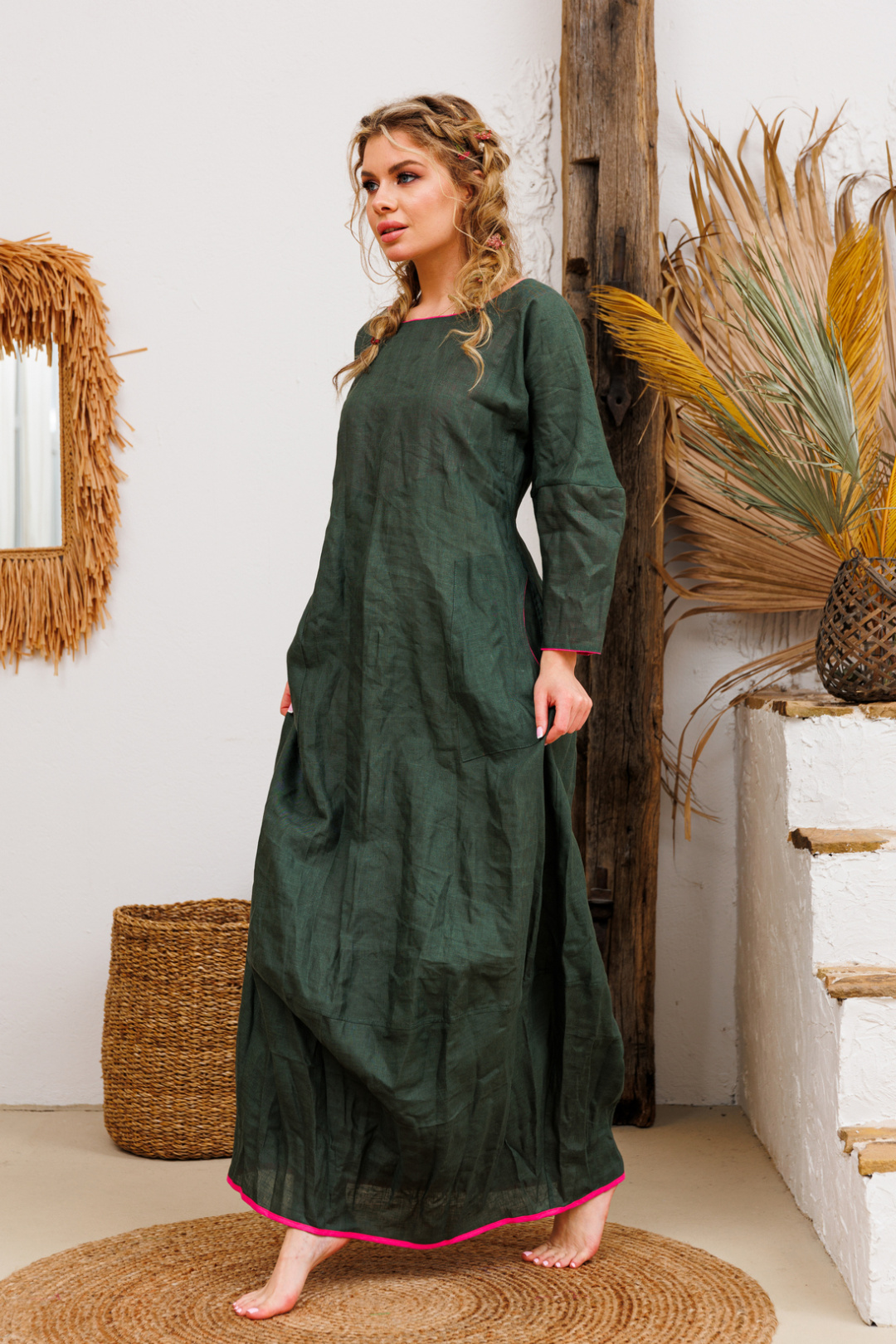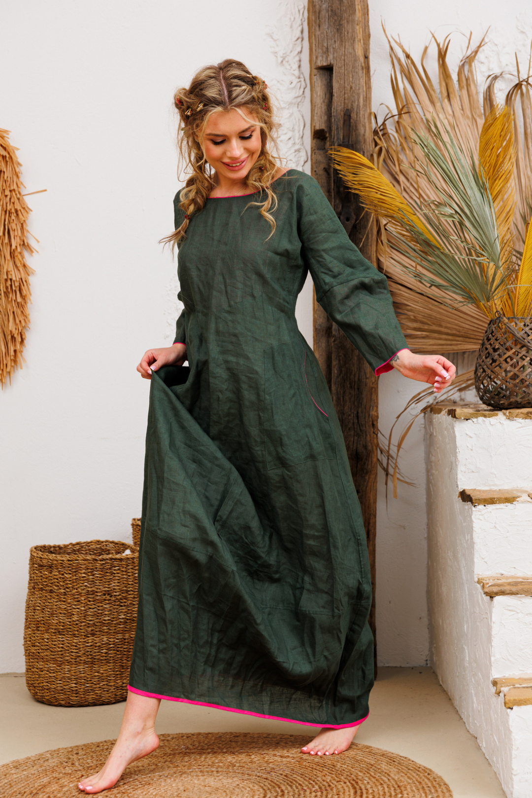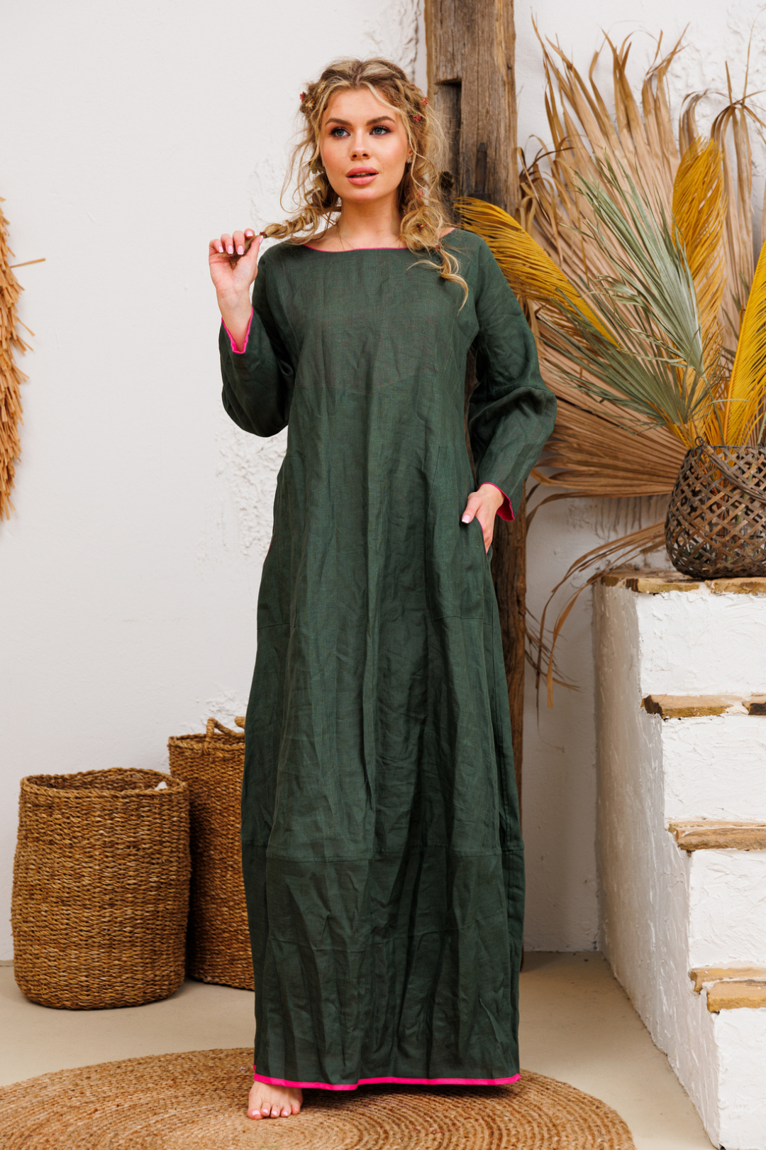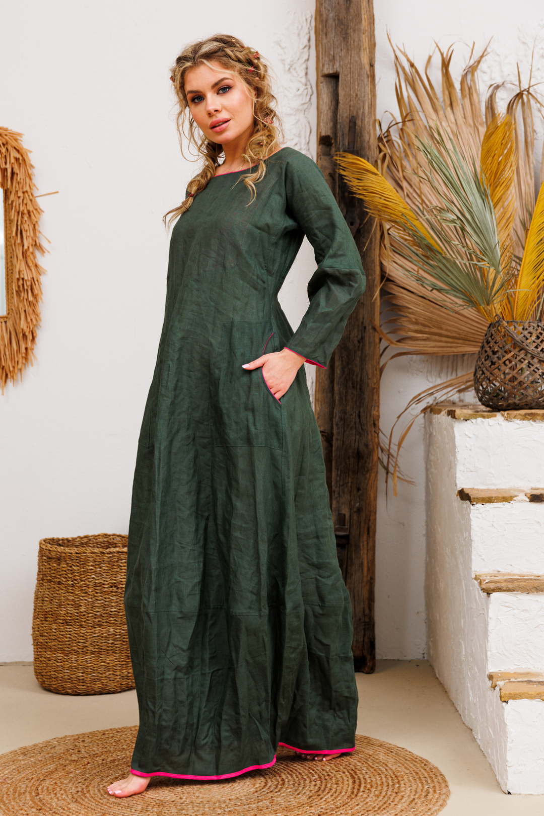 Натуральное льняное шикарное платье со смыслом. Это платье уникально и восхищает своим сочетанием цветов. Тёмно-зелёный с фуксией, это правда удивительно красиво. А силуэт который создается таким изысканным кроем получается очень стройным, причём в любом размере. "Тюльпанчики" по низу платья и по рукавам не оставят равнодушными никого. А карманы какие! Каждый элемент этого палтья, это шедевр от талантливого дизайнера который сумел сочетать современное восприятие и исконные славянские знания об одежде. . На груди идёт очень глубокая обтачка уголком к талии, что создает эффект стройности и дополнительно защищает грудь и позволяет ходить без нижнего белья. Каждое платье бренда АМУЛЕТ создано с применением древних славянских принципов по изготовлению обережной одежды. Обращаю Ваше внимание на то, что к заказу надо подходить осознанно, с пониманием ценности, а возвраты или неоплата, не в вашу копилку Благочестия, как говорится ). Мы Вас Любим и в подарок в комплекте к платью прилагаем сумку-шопер с логотипом бренда. Это ПЛАТЬЕ для Радости и Благости!!! Наслаждайтесь!!!