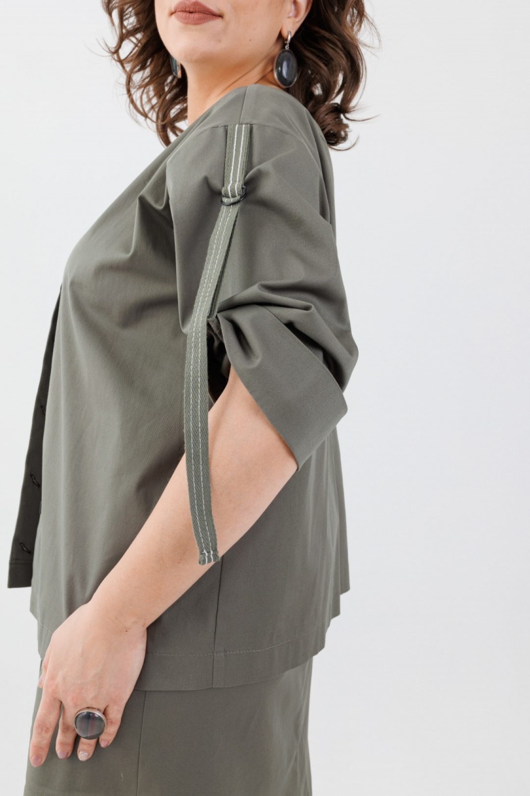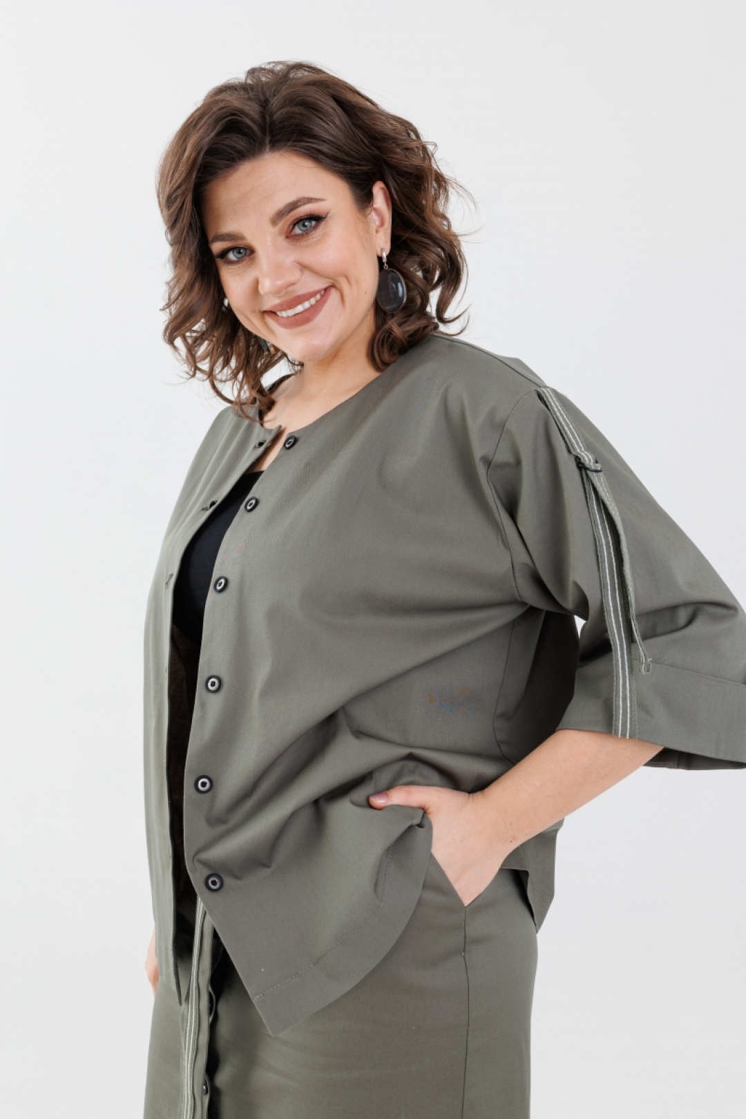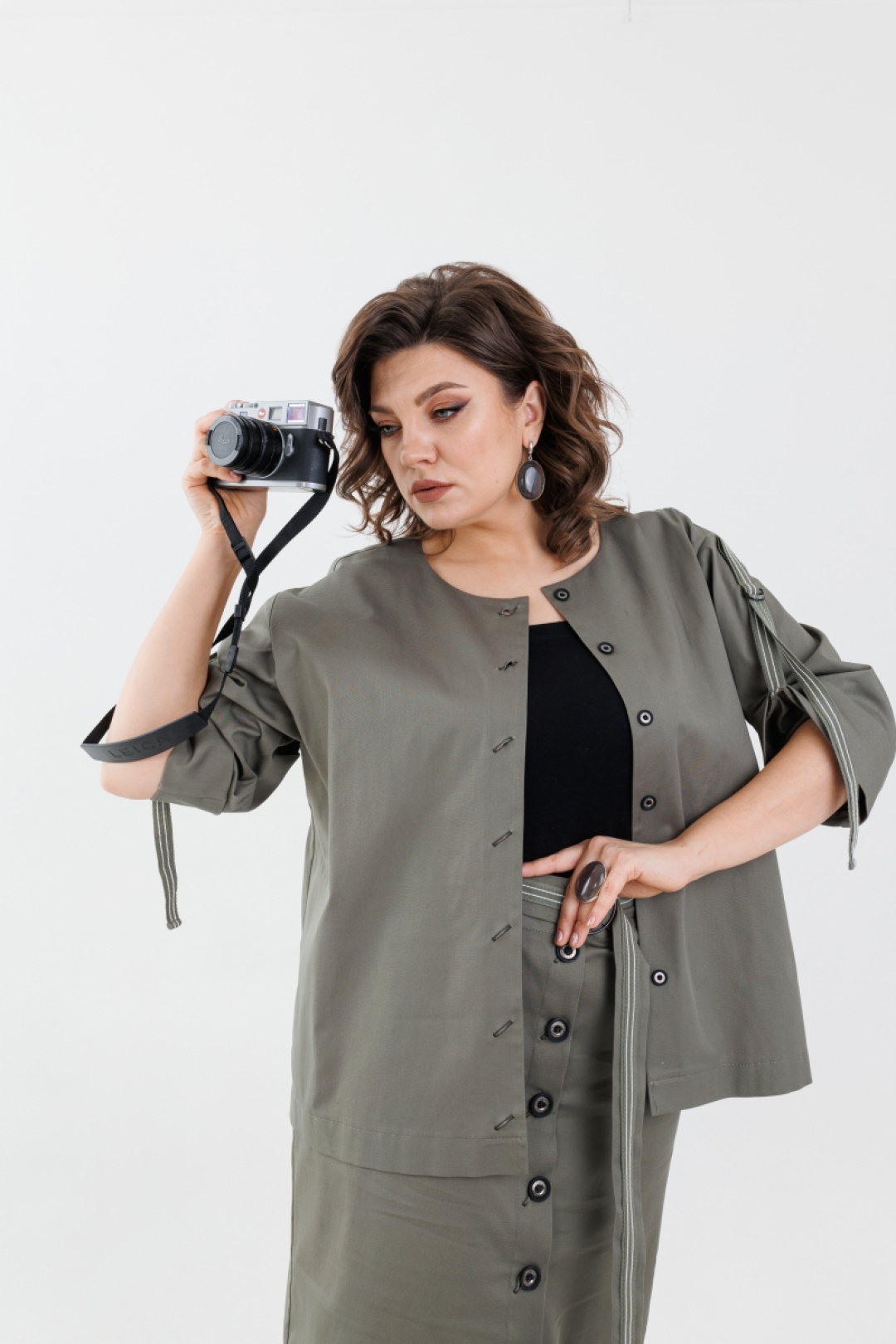 Жакет прямого свободного силуэта с заниженной линией плеча. Рукава с отворотами и регулируемыми отделочными деталями. Вырез горловины округлый, застёжка на пуговицы по всей длине. Спинка с кокеткой и декоративной патой.