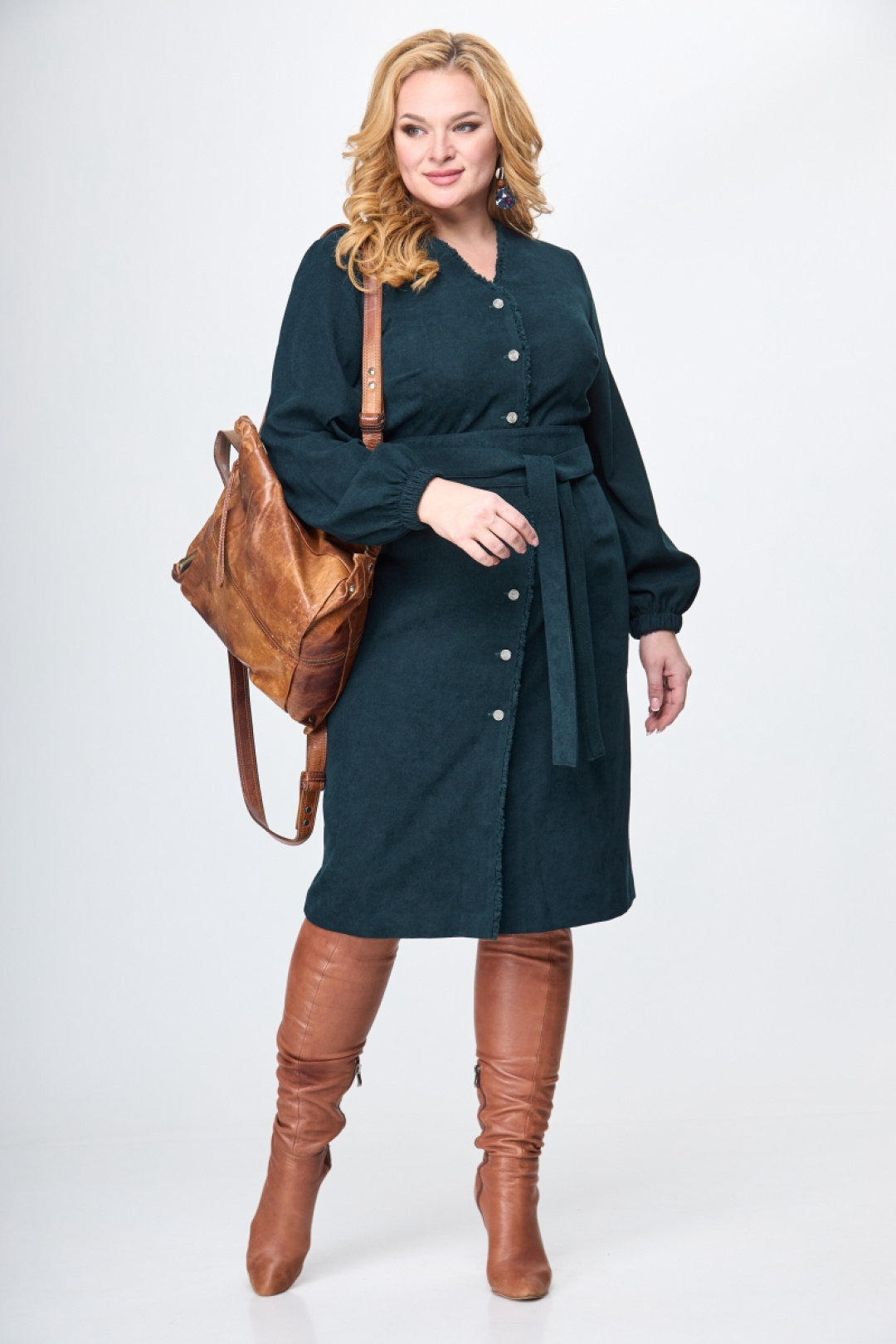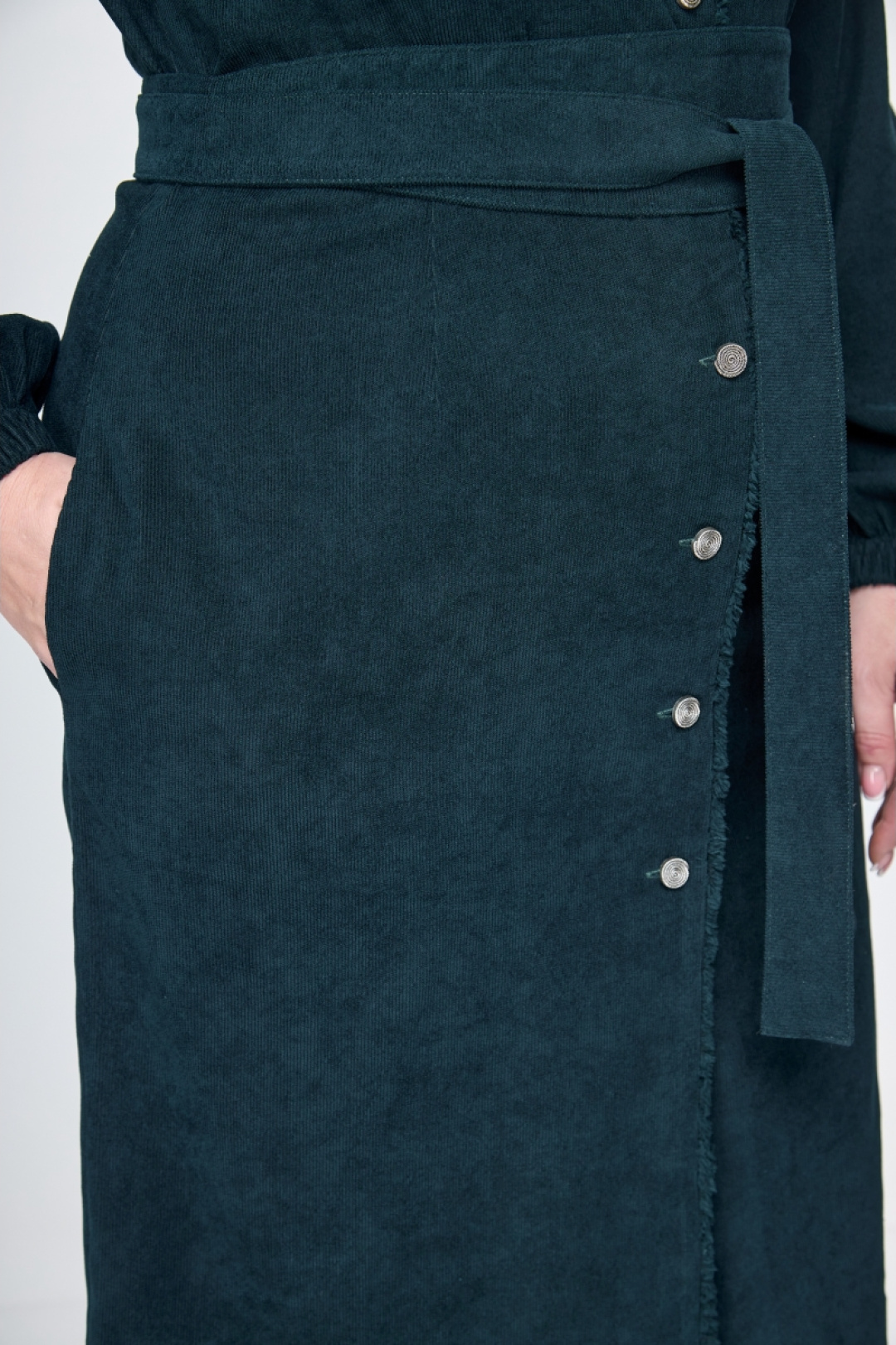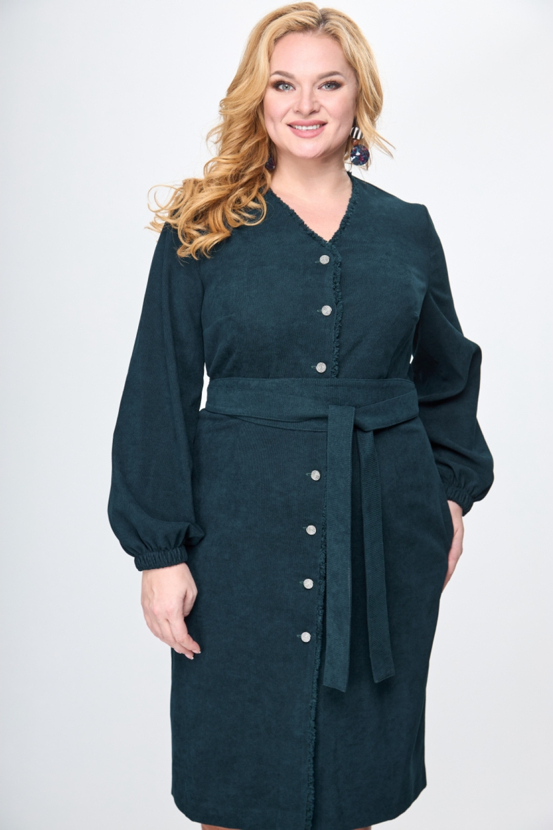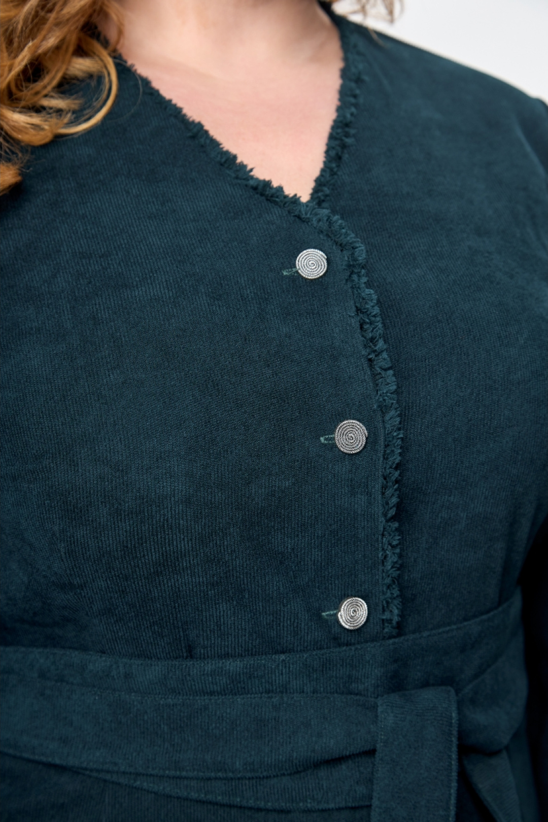 Платье полуприлегающего силуэта из ткани вельвет. Элегантный v-образный вырез горловины,функциональная застёжка на пуговицы по всей длине. Втачной рукав на резинке по низу,талевые вытачки по переду и спинке.Особенностью модели платья является отделка бахромчатой лентой по горловине и борту.Дополнено съёмным завязывающимся поясом.