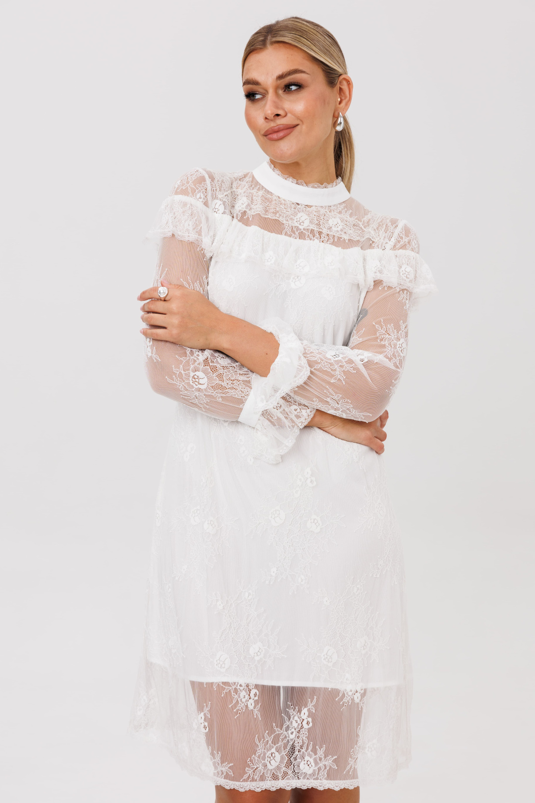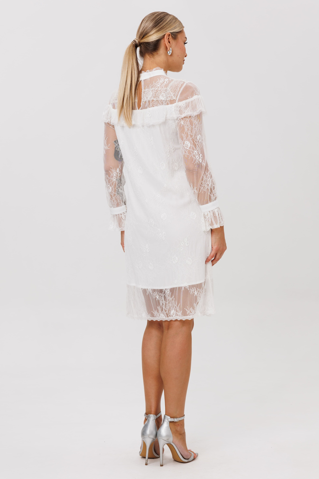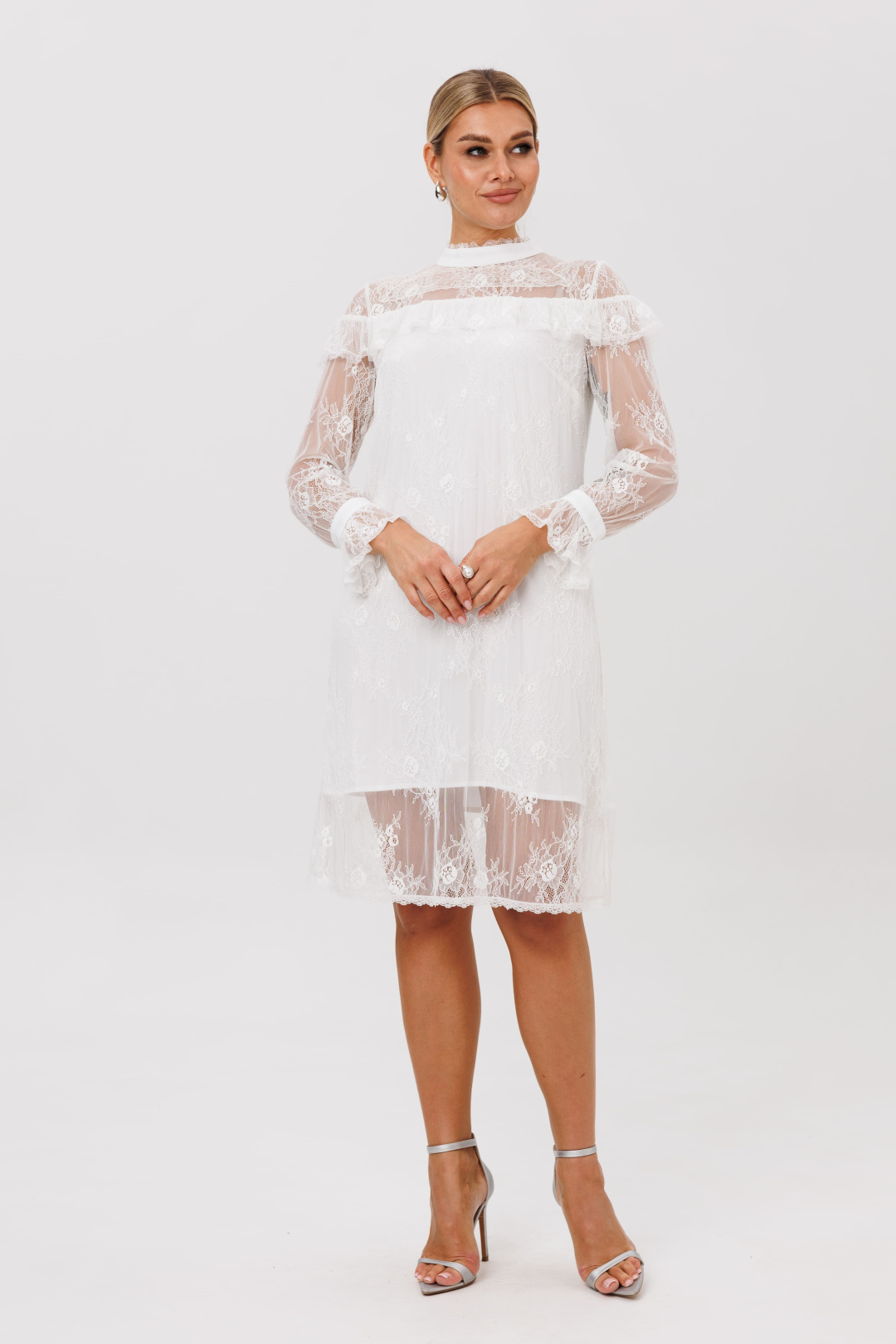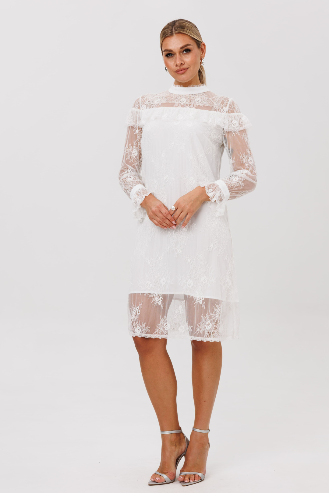 Это платье, сотканное из воздуха и тончайших нитей. Нежное кружевное полотно, подобно легкой дымке, обволакивает силуэт, заключая его в элегантные и строгие линии прямого кроя. Изысканность кроется в деталях: кокетки, украшающие лиф спереди и сзади, мягко ниспадают изящными волнами, подчеркивая линию плеч и даря образу трогательную, почти что хрупкую грацию.