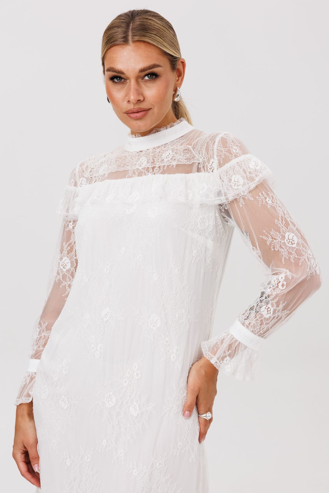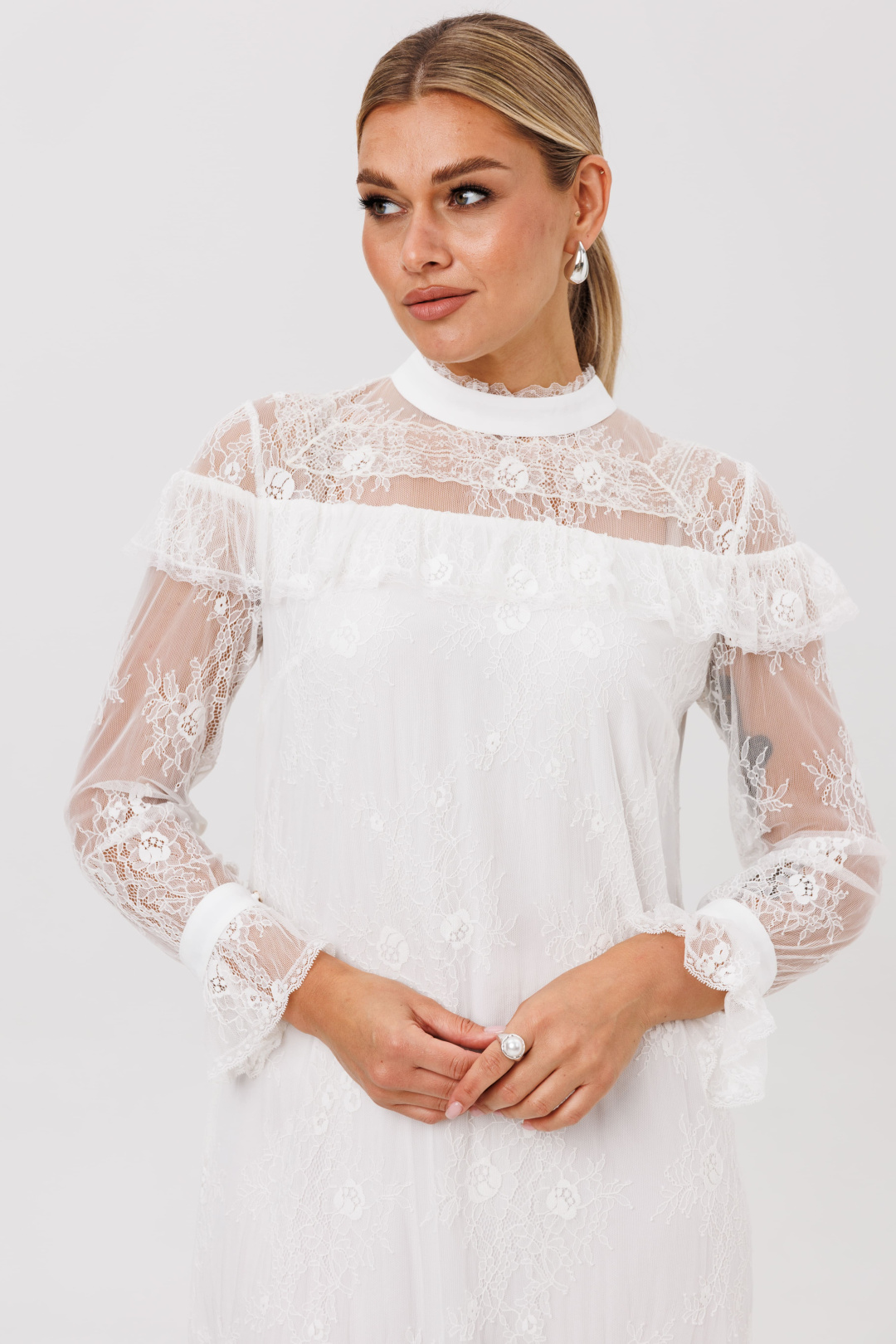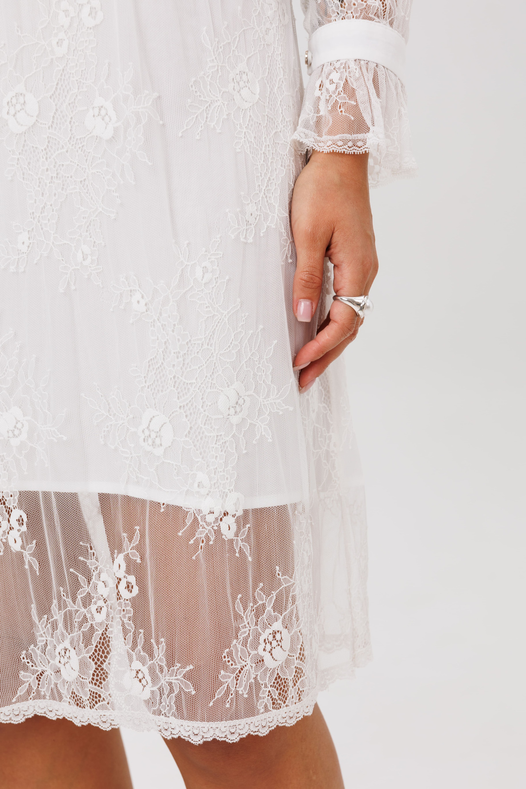 Каждый элемент продолжает повествование о романтике: втачные рукава, строгие и утонченные у манжет с изящной пуговицей, неожиданно раскрываются нежным кружевным веером-валоном у запястья. Высокая стойка воротника, обрамленная ажурной тесьмой, придает благородную четкость линиям шеи, а тайна скрыта за спиной — где ряд пуговиц, словно жемчужины, хранит ключ к этому прекрасному наряду.