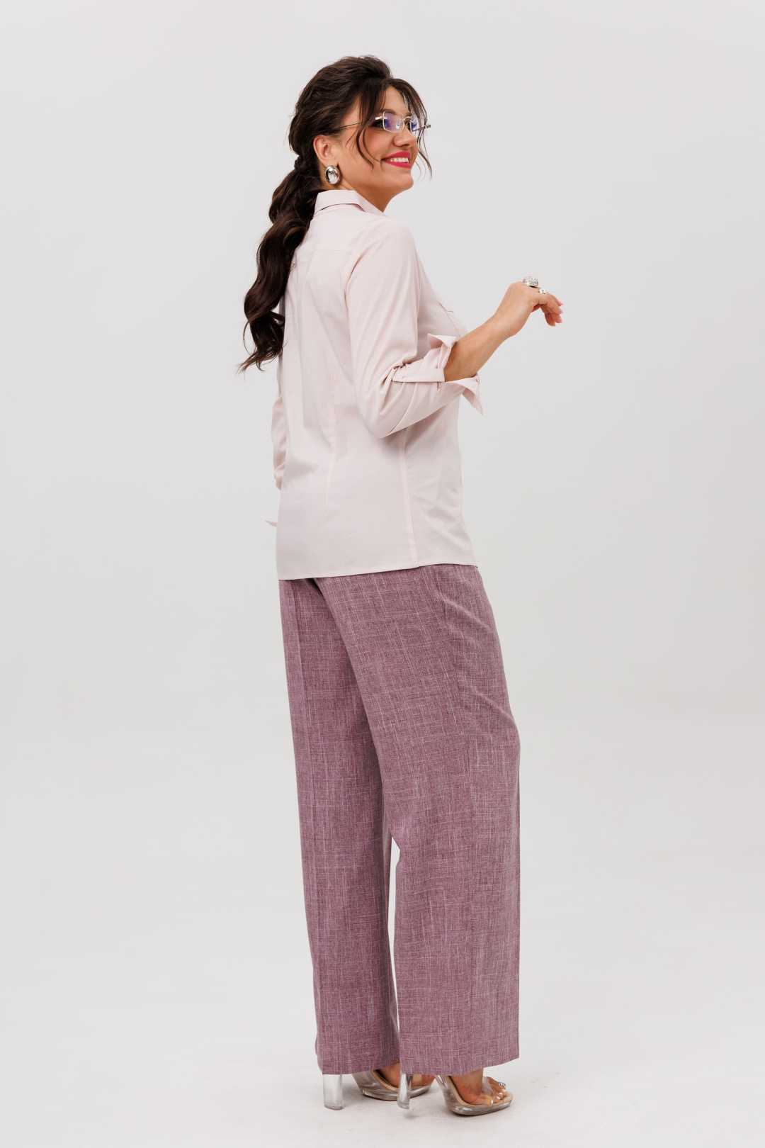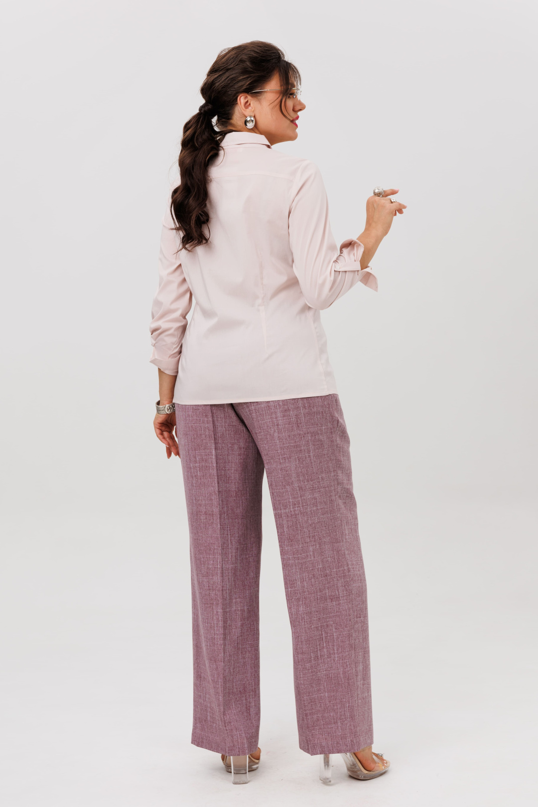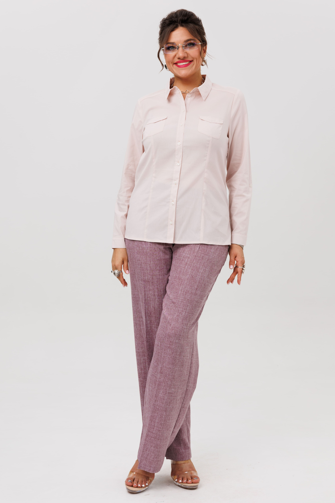 Блузка застегивается на пуговицы по цельнокроеной планке и завершается воротником на стойке. Рукава являются втачными и заканчиваются манжетами с застежкой на пуговицу, что позволяет регулировать их ширину с помощью специальной паты. Эта модель станет универсальным элементом гардероба, подходящим для повседневной носки, учебы или соблюдения дресс-кода. Образ на модели составлен с брюками 1540.1 от Anelli.