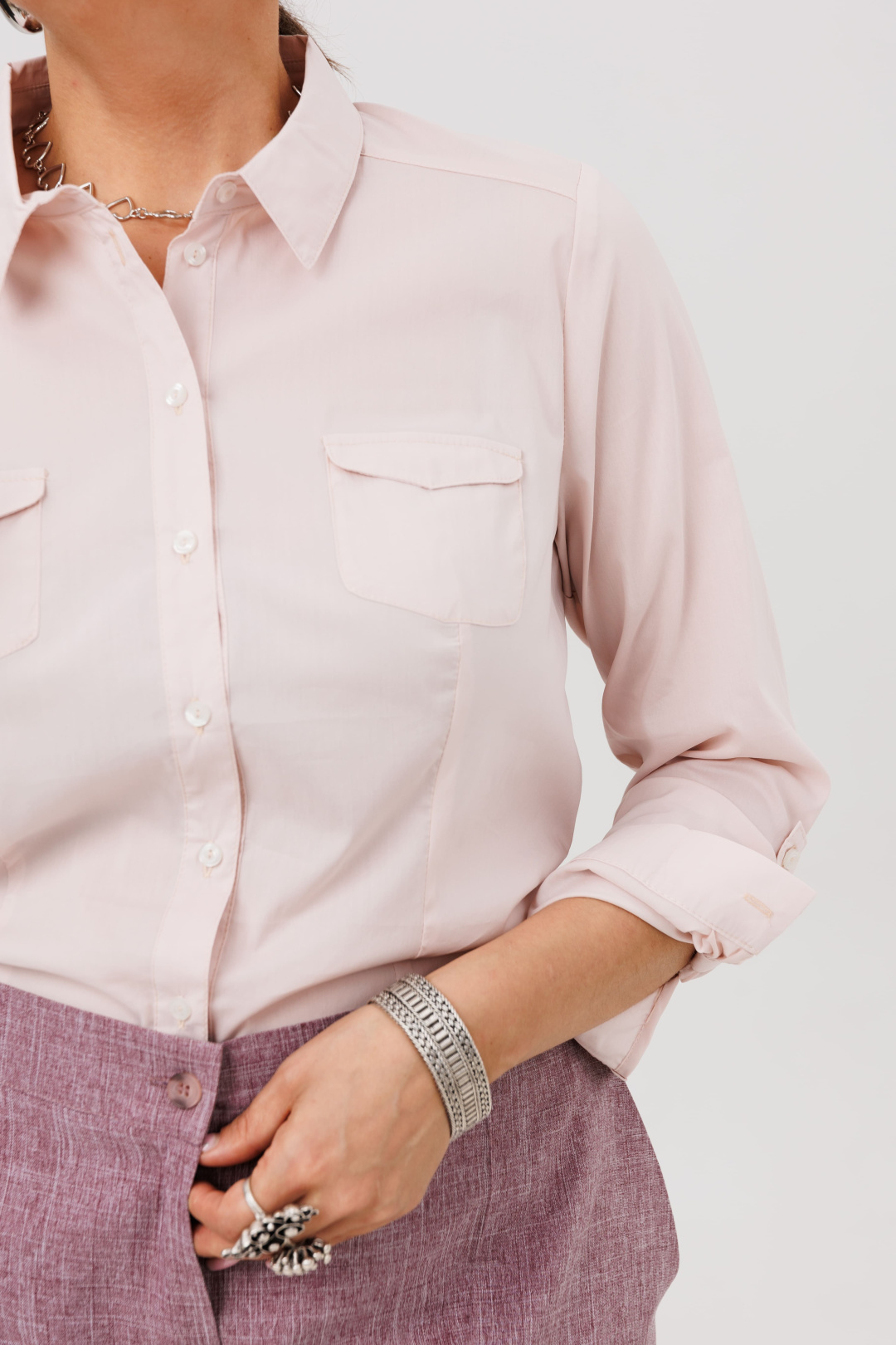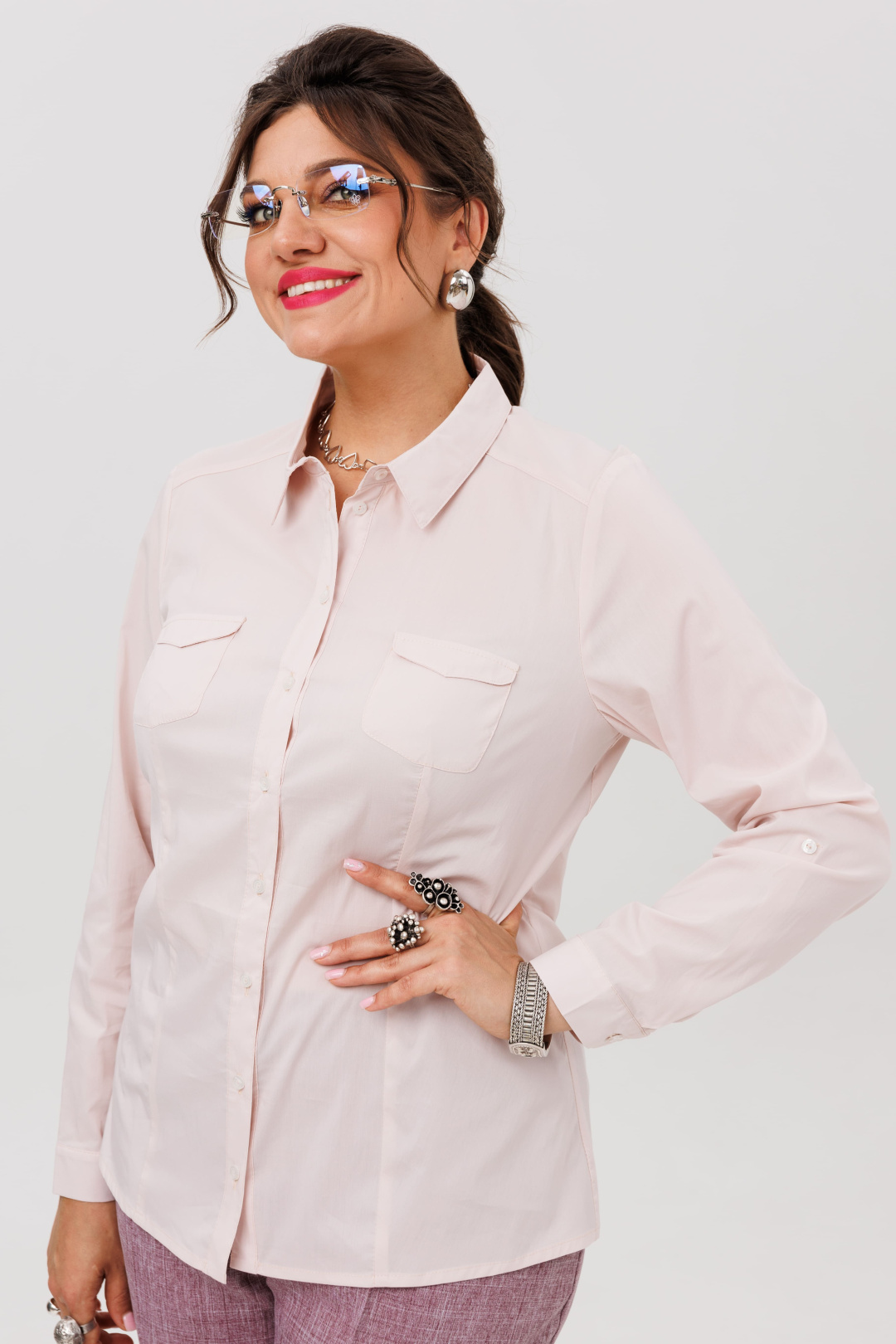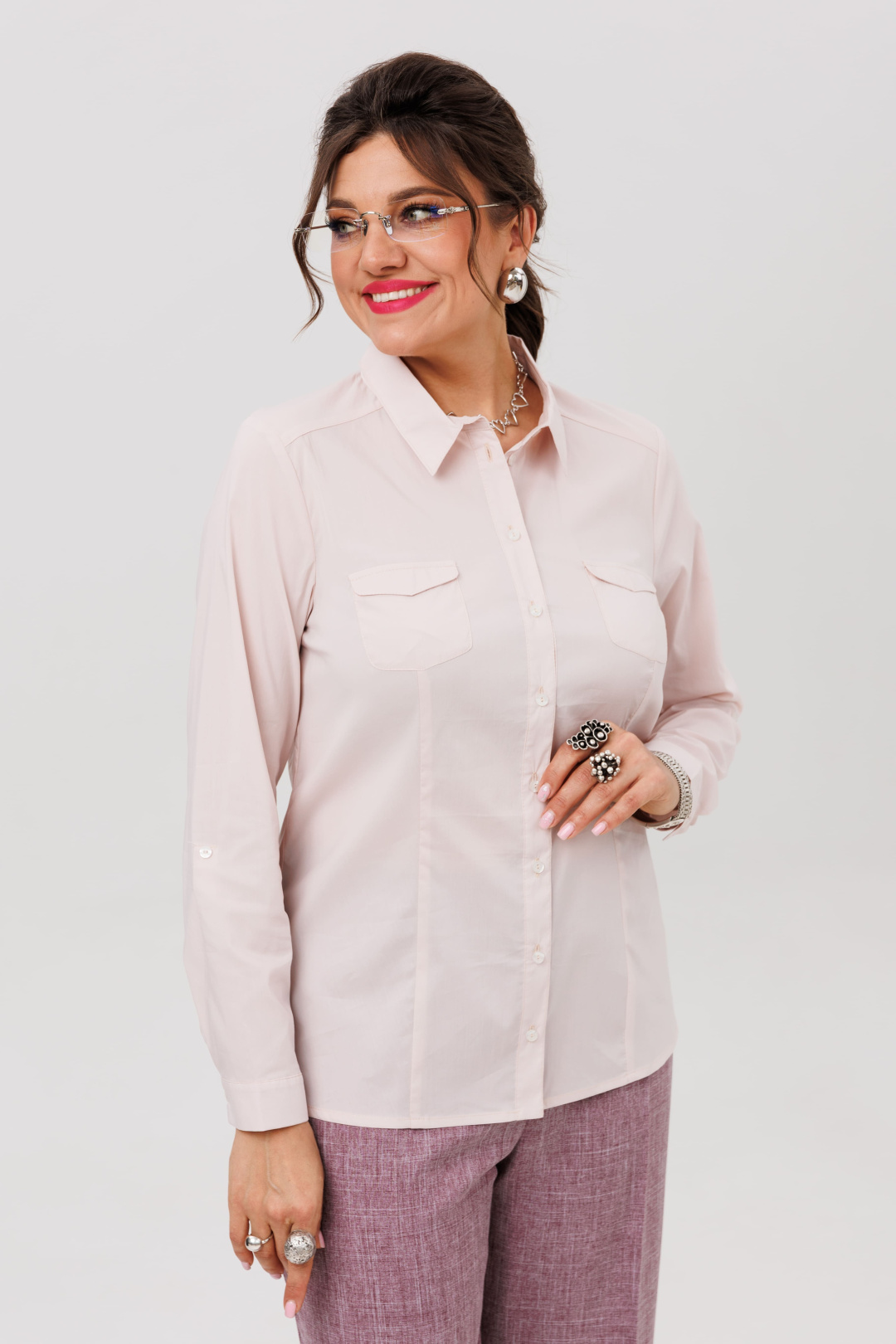 Классическая блуза отличается строгим и лаконичным дизайном. Ее передняя часть оформлена нагрудными вытачками, идущими от низа, и дополнена накладными карманами с закругленными краями. Спинка модели имеет талевые вытачки и цельнокроеную кокетку, которая плавно переходит на полочку, обеспечивая идеальную посадку по фигуре.