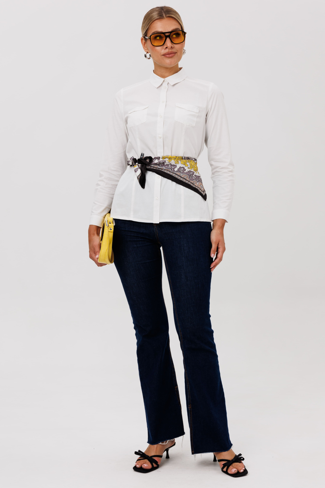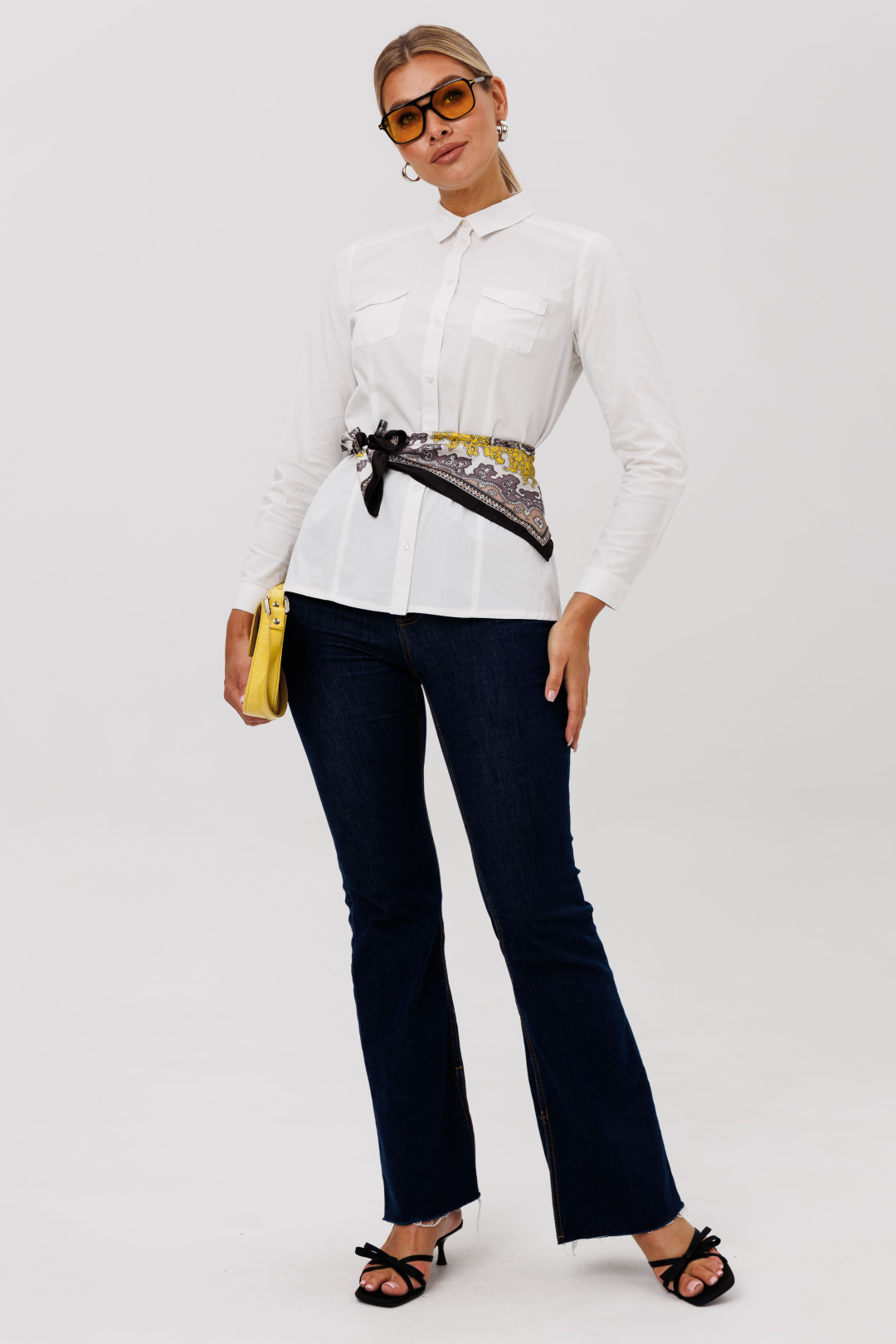 Классическая блуза отличается строгим и лаконичным дизайном. Ее передняя часть оформлена нагрудными вытачками, идущими от низа, и дополнена накладными карманами с закругленными краями. Спинка модели имеет талевые вытачки и цельнокроеную кокетку, которая плавно переходит на полочку, обеспечивая идеальную посадку по фигуре.