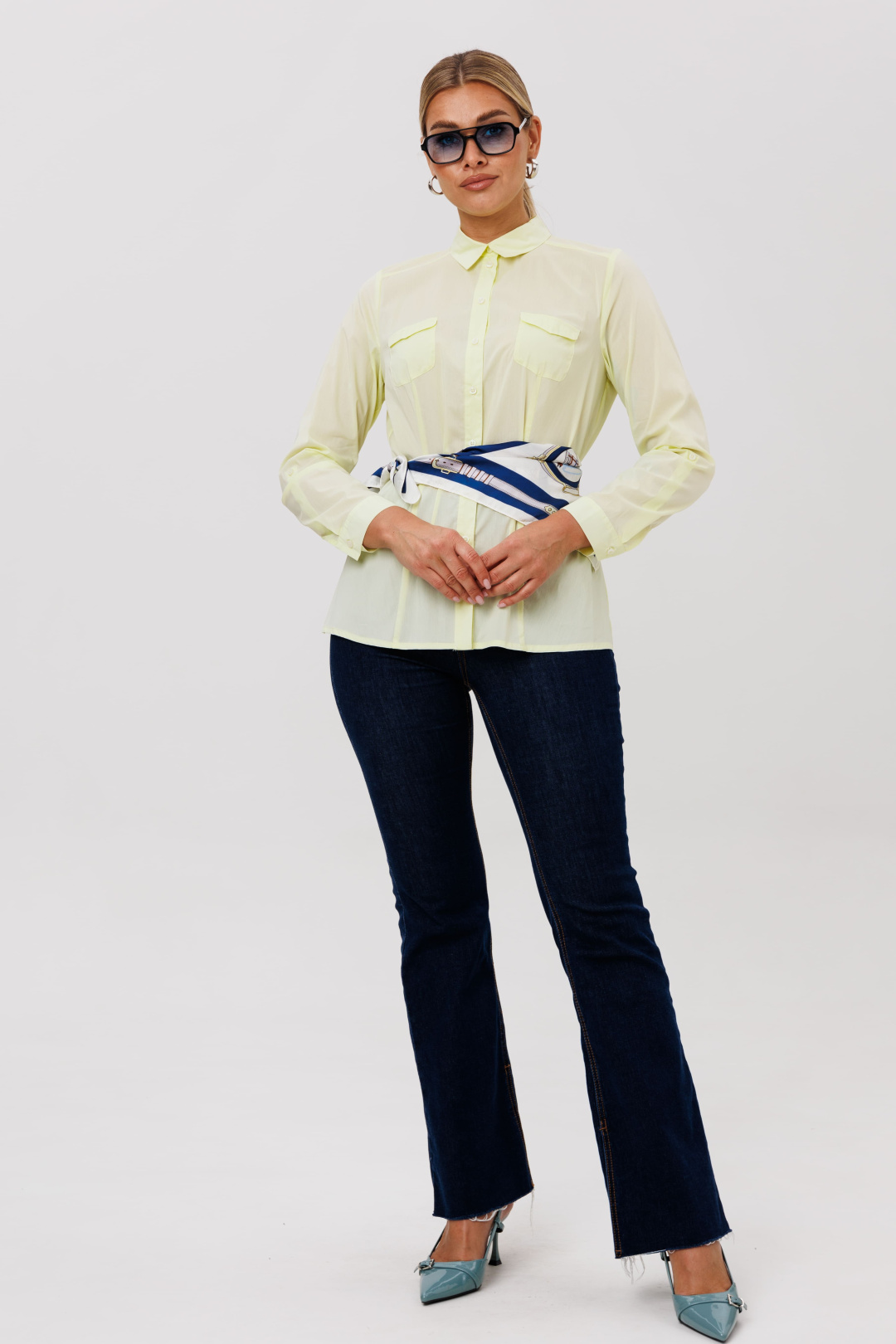 Классическая блуза отличается строгим и лаконичным дизайном. Ее передняя часть оформлена нагрудными вытачками, идущими от низа, и дополнена накладными карманами с закругленными краями. Спинка модели имеет талевые вытачки и цельнокроеную кокетку, которая плавно переходит на полочку, обеспечивая идеальную посадку по фигуре.