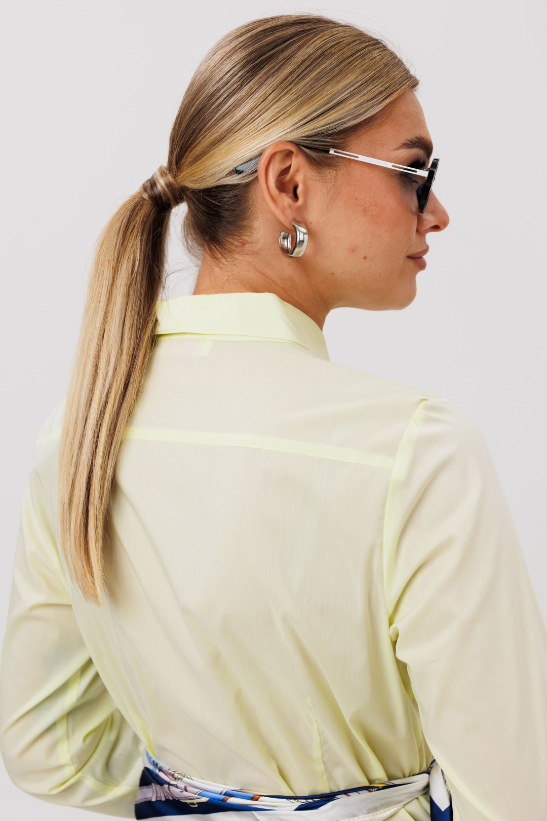 Блузка застегивается на пуговицы по цельнокроеной планке и завершается воротником на стойке. Рукава являются втачными и заканчиваются манжетами с застежкой на пуговицу, что позволяет регулировать их ширину с помощью специальной паты. Эта модель станет универсальным элементом гардероба, подходящим для повседневной носки, учебы или соблюдения дресс-кода.