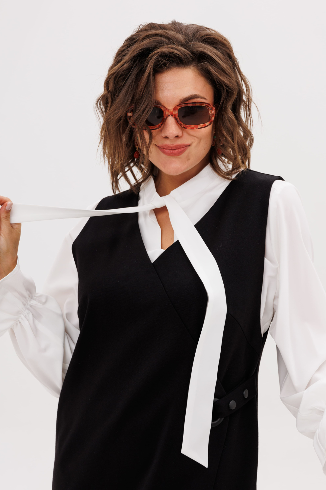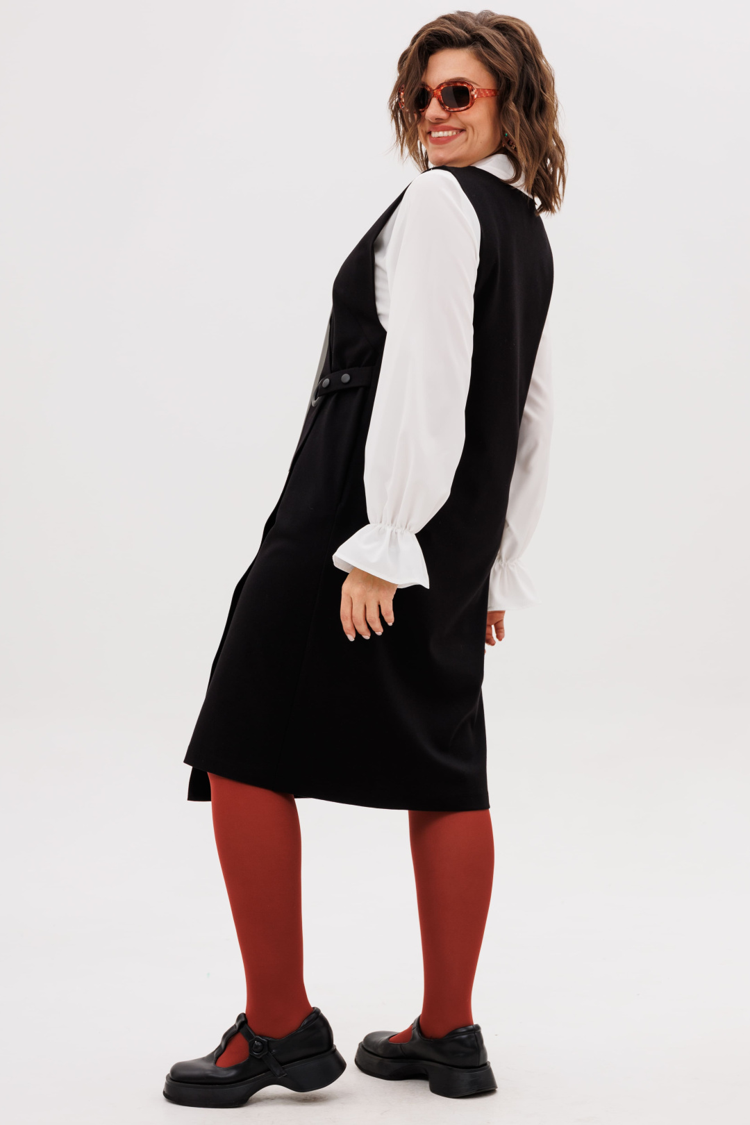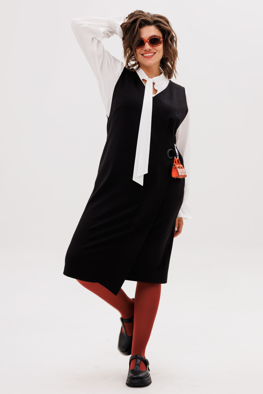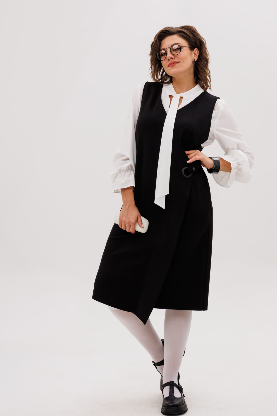 Этот сарафан, выдержанный в строгом прямом силуэте, становится идеальной основой для современного гардероба. Его лаконичную геометрию мягко нарушает игра асимметрии — динамичный, неровный край низа плавно скользит по фигуре, создавая ощущение движения и художественной небрежности. Глубокий V-образный вырез горловины не только зрительно вытягивает шею, но и привносит ноту женственности и открытости, служа идеальным фоном для любимой блузки или тонкого джемпера.