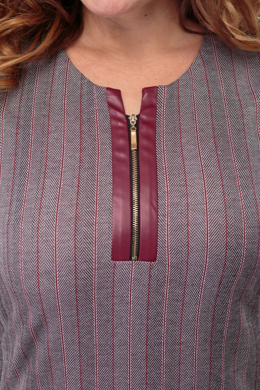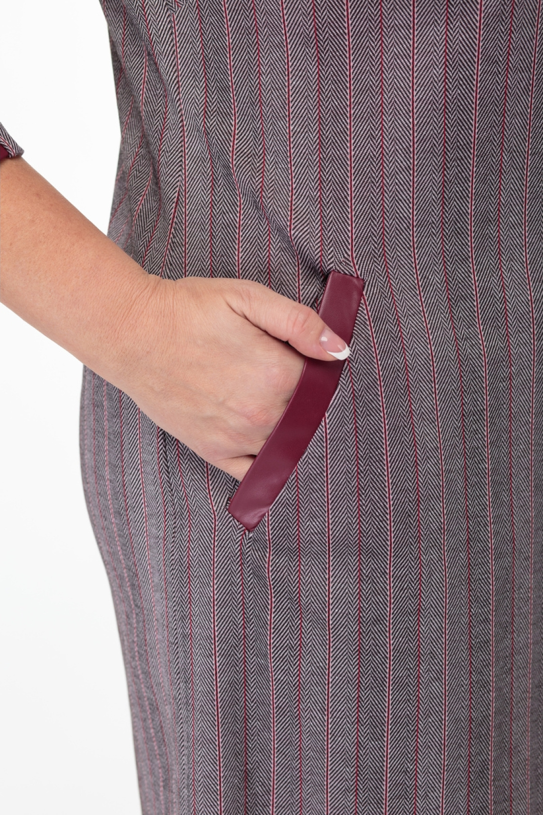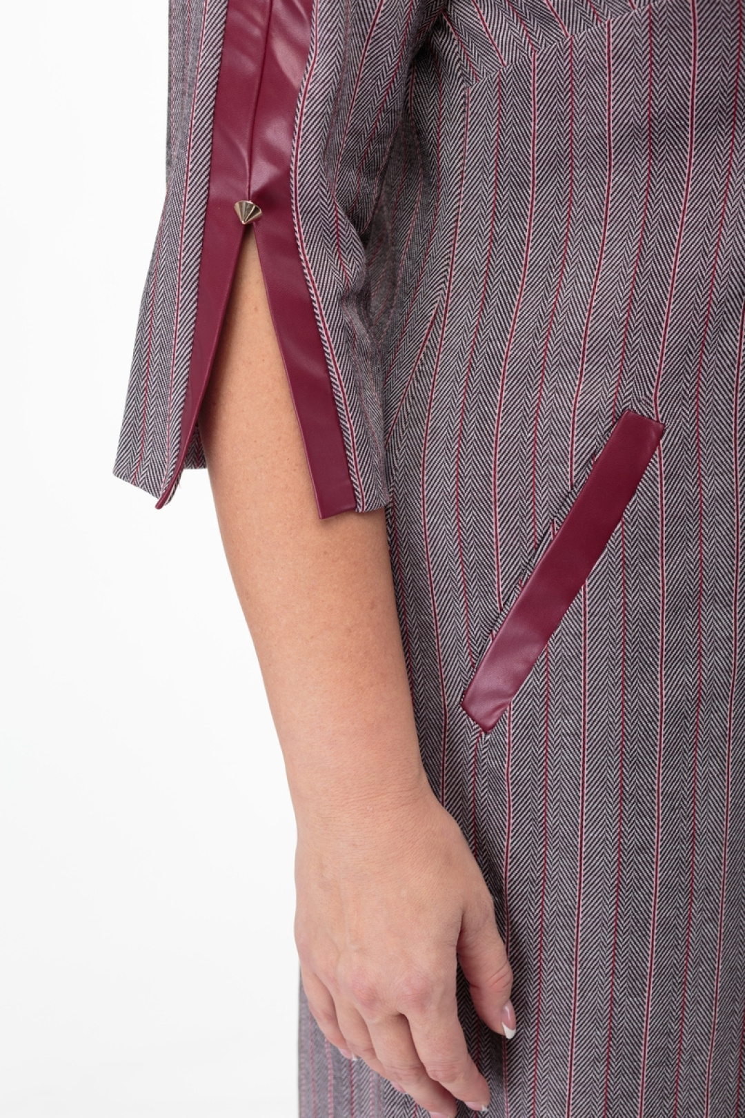 Женское платье лаконичного полуприлегающего силуэта из комфортного трикотажного полотна.Платье средней длины до колена.На передней части обработаны нагрудные вытачки, прорезные карманы с листочкой. Горловина платья округлой формы, с застежкой на декоративную тесьму-молнию, которая обрамлена втачными планками .Рукава втачные длиной 3/4, имеют декоративное членение с отделочными планками с разрезом. Планки, листочки выполнены из ткани с напылением под кожу с благородным мерцанием.Платье универсально, послужит отличной базой в офис, стильный принт уместен вне времени.