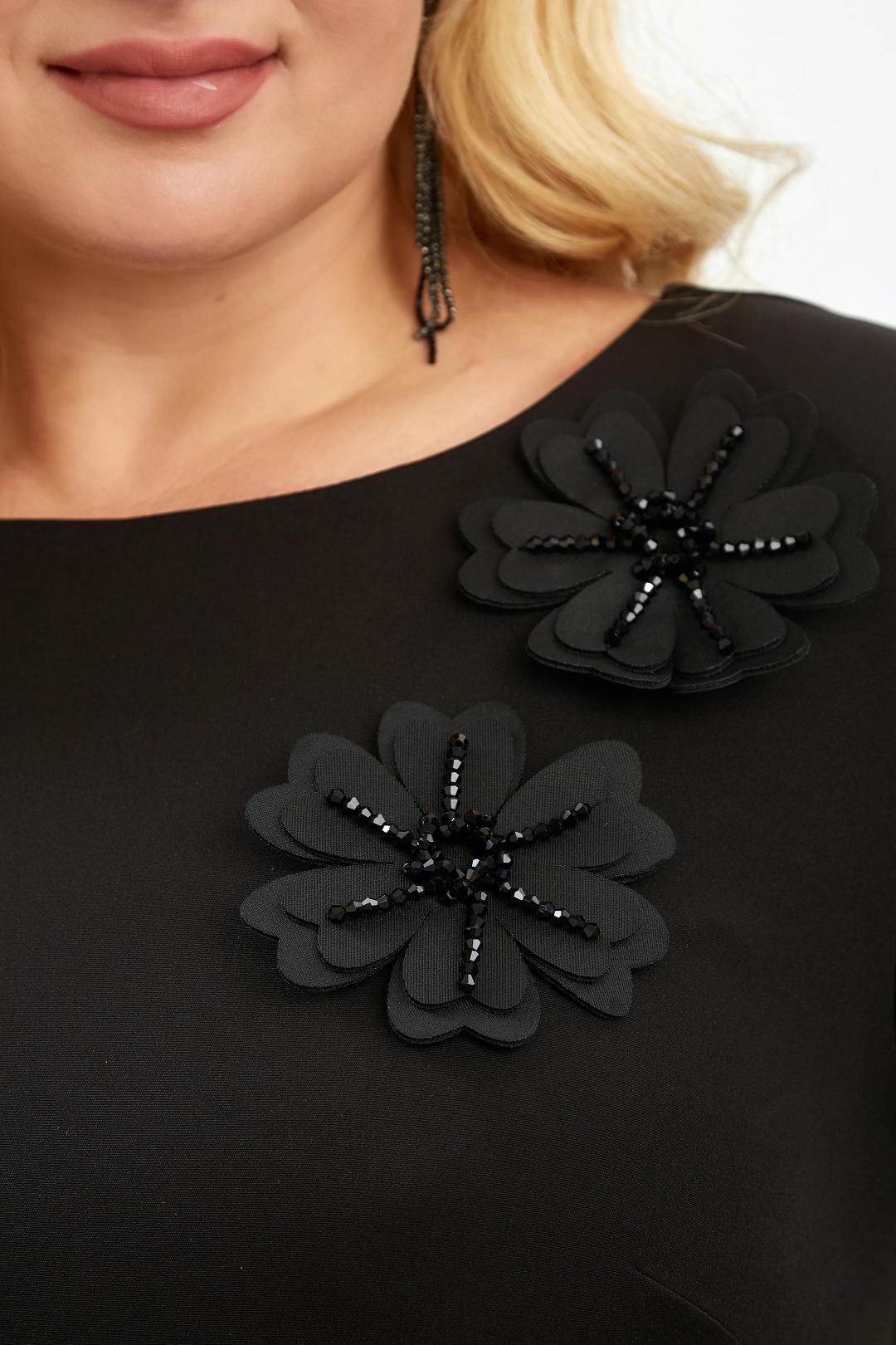 Стильное базовое черное платье от бренда «AXXA» О-образного силуэта, выполнено из качественной плательной ткани, что придает изделию определенную элегантность. В области низа спинки и полочки изделия расположены вытачки, благодаря которым силуэт платья принимает слегка зауженную форму. Спинка со средним швом. Сзади платье на потайной молнии. Горловина округлая типа лодочка. Рукав втачной одношовный, длина 3/4. В области груди платье декорировано съёмными цветами, что придает нежность и изящество данному изделию.