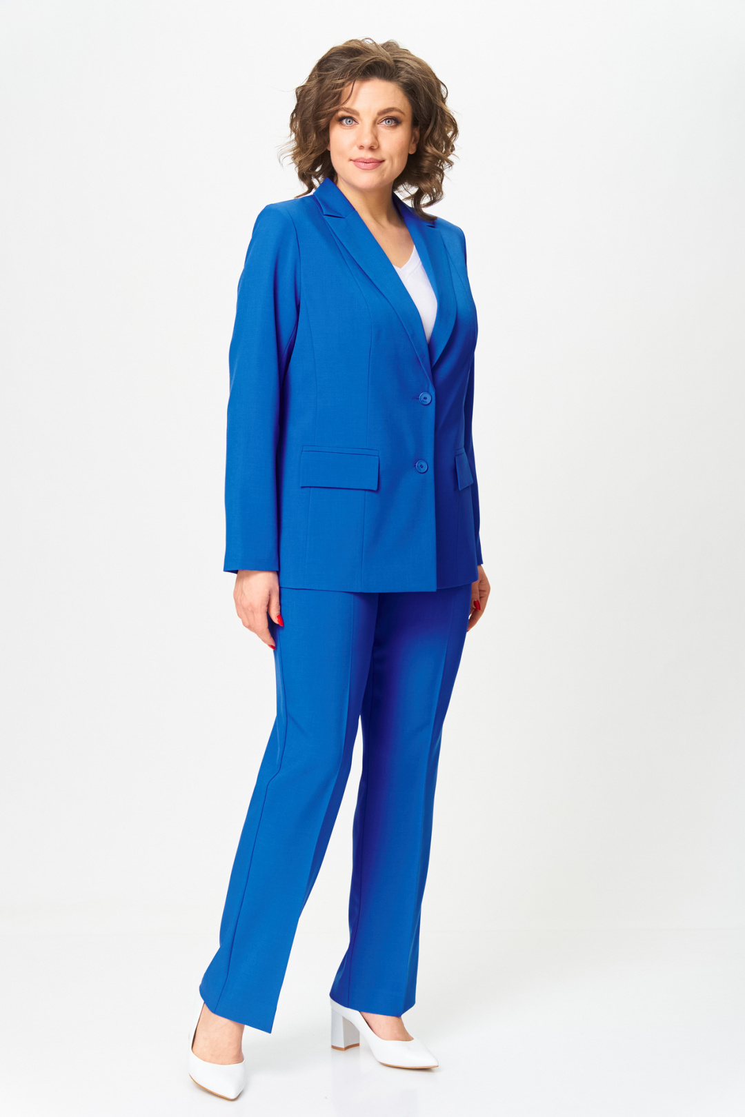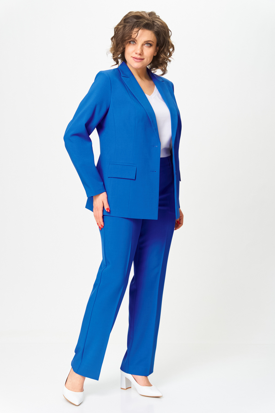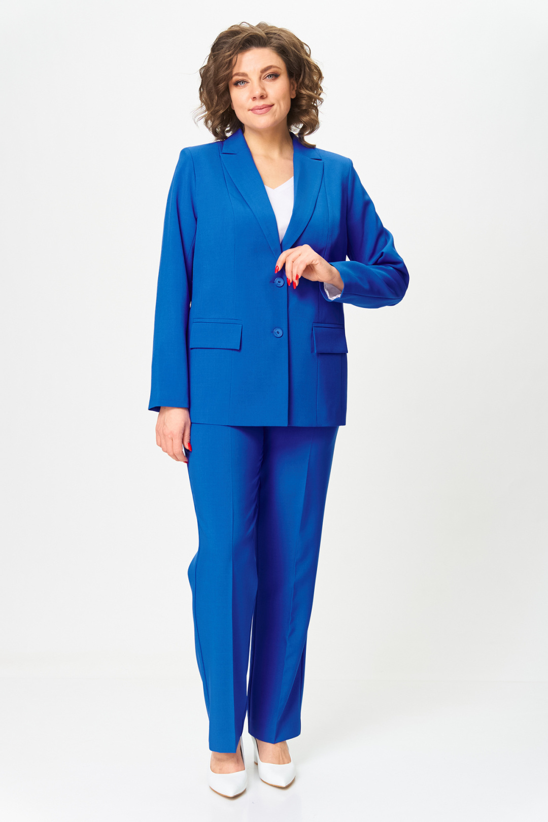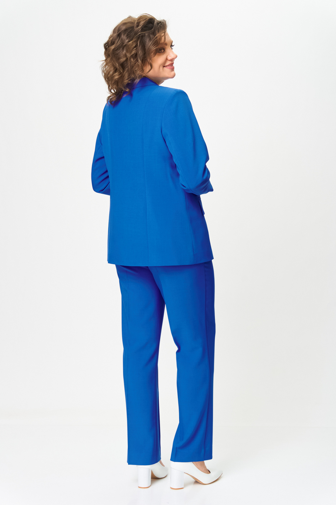 Комплект женский-двойка, из текстильной ткани, жакет удлиненный, полуприлегающего силуэта с центральной бортовой застежкой на пуговицы до линии перегиба лацкана. Спереди рельефные швы от плечевого шва, отрезной бочок и карман с клапаном. Спинка с рельефами от плечевого шва. Рукав втачной, двухшовный. Воротник пиджачного типа. Жакет на подкладке, длина по спинке 67 см, длина рукава 62 см. Брюки прямые, классические, с заутюженными стрелками, по переду обработаны карманы с отрезным бочком, застежка на тесьму-молнию и 1 пуговицу. На задних половинках обработаны вытачки и имитация карманов с листочкой, пояс в брюках притачной. Длина брюк от талии по боковому шву 103 см.