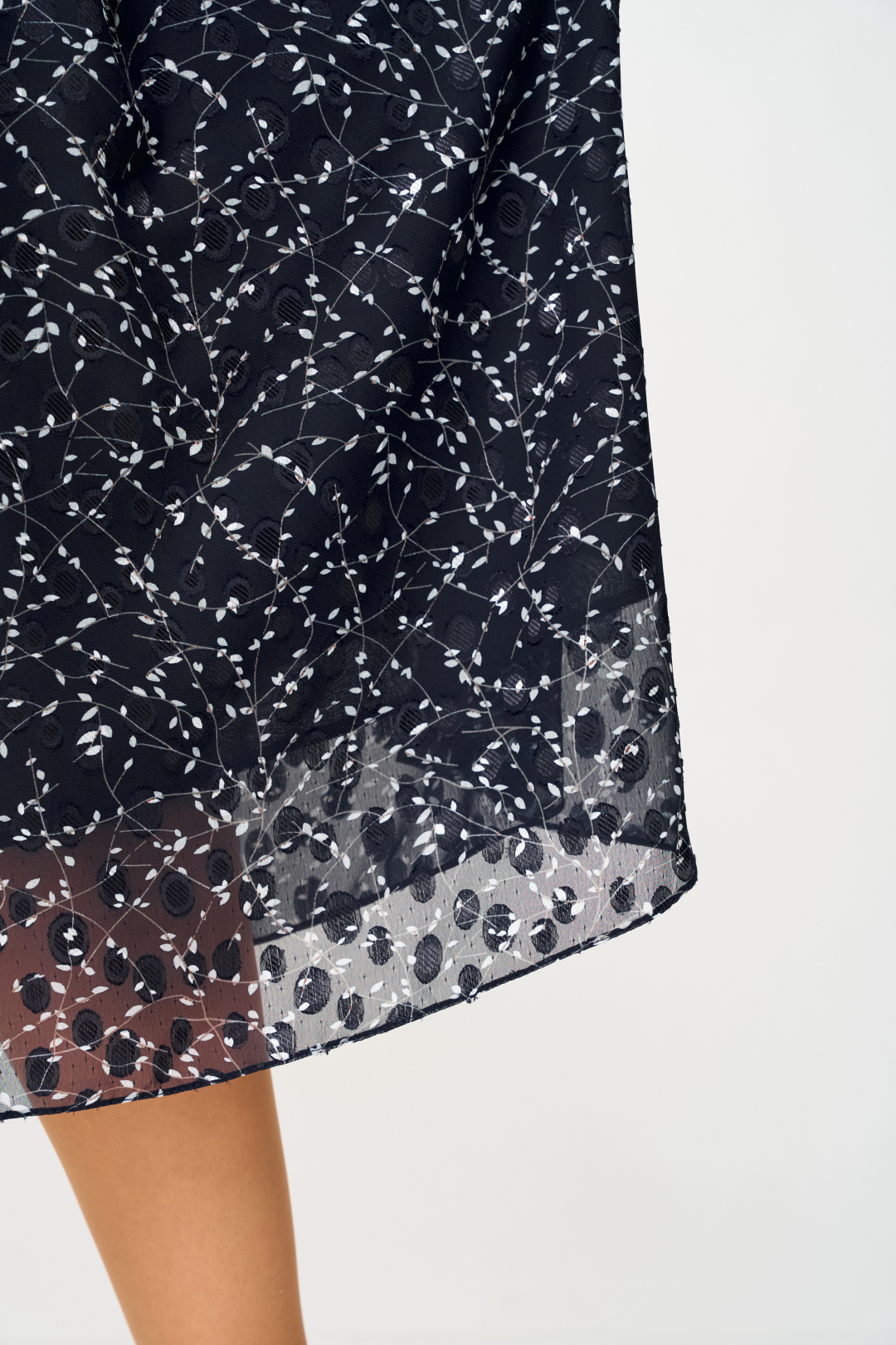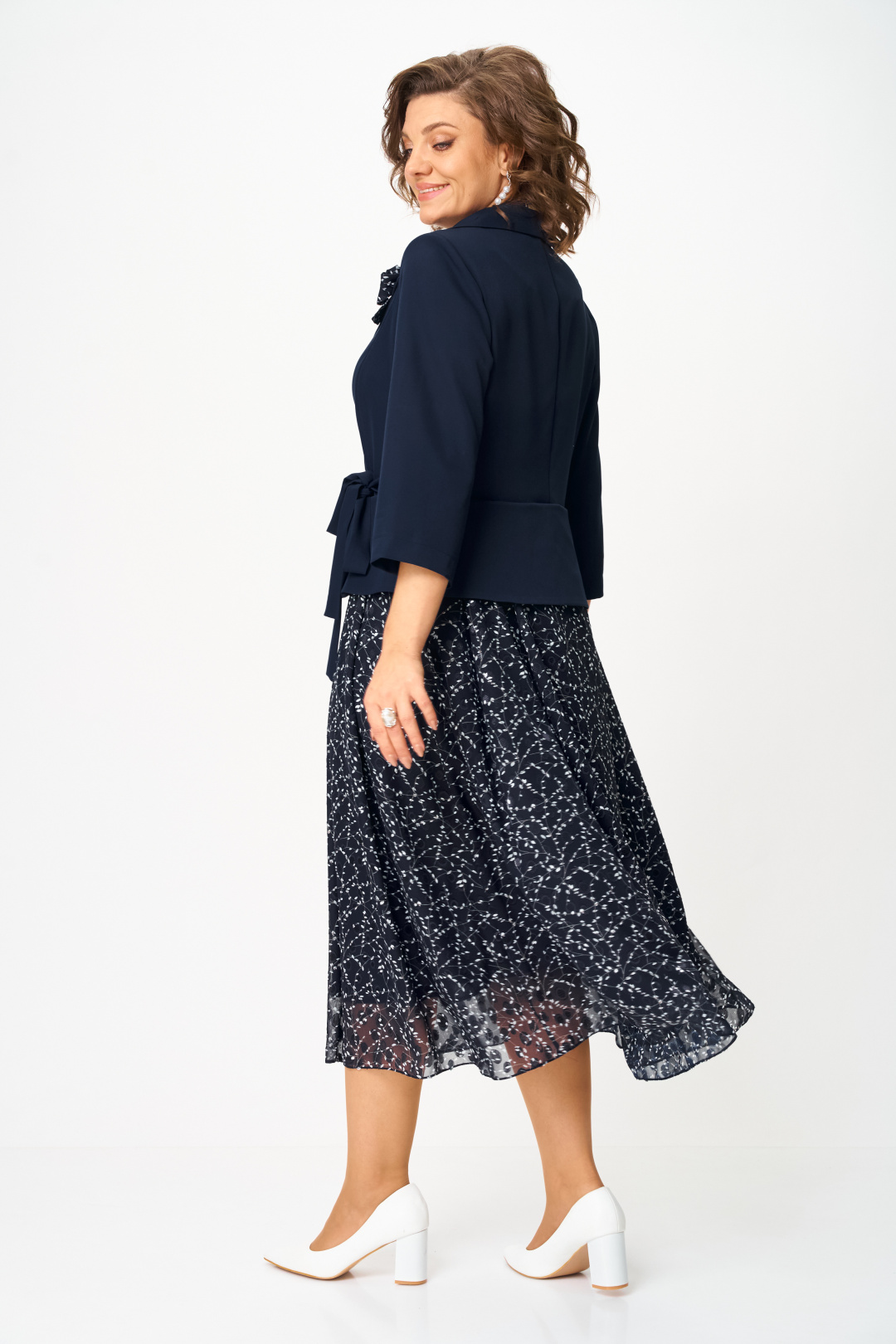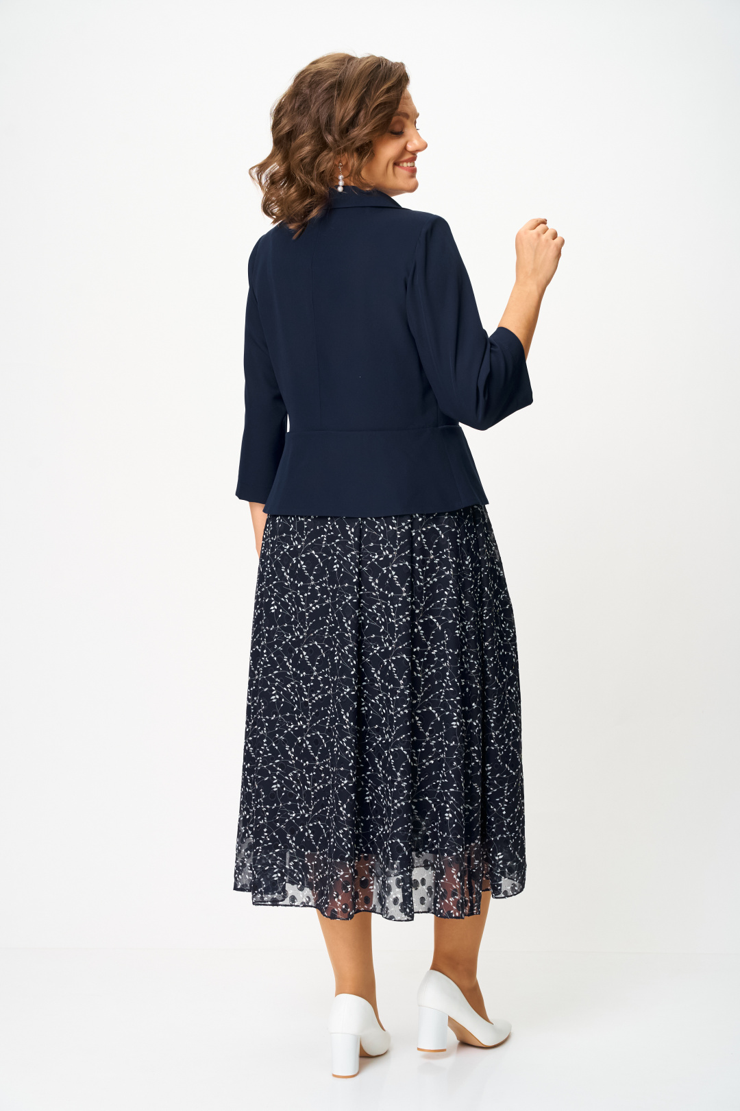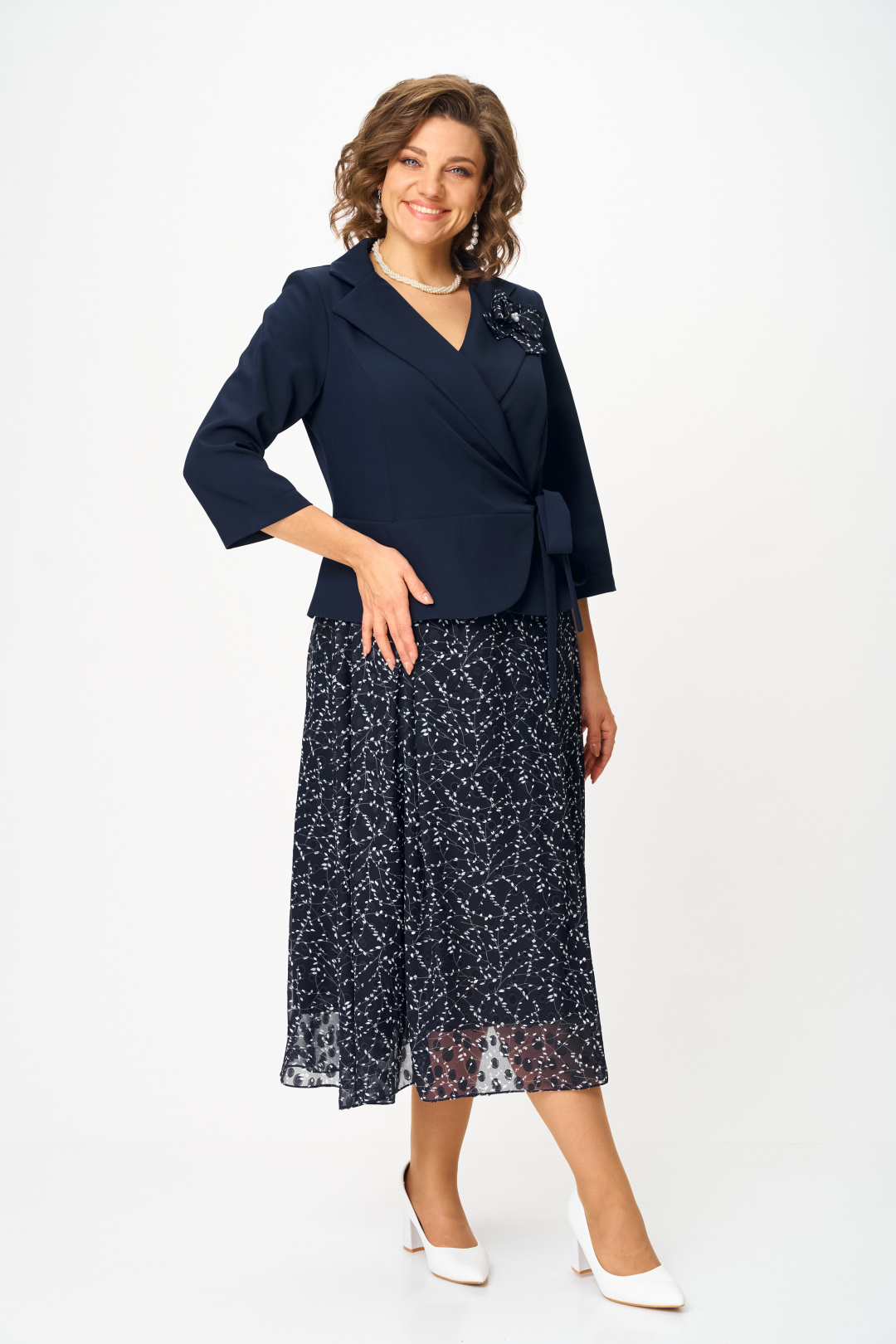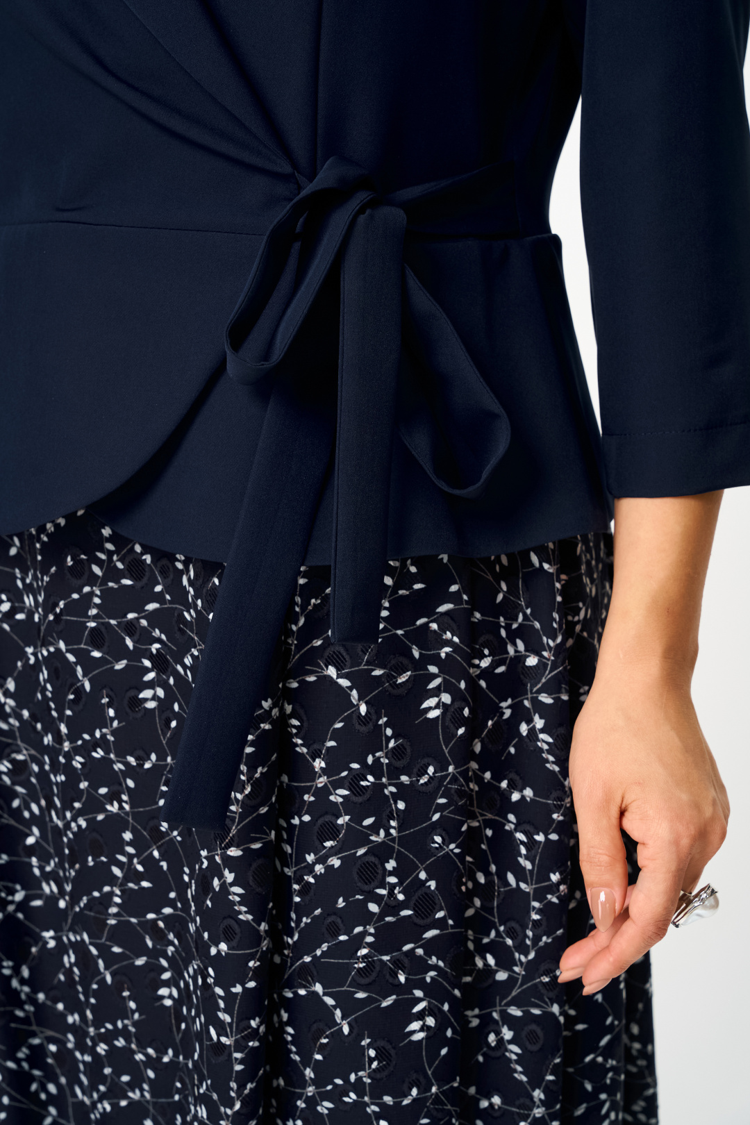Лиф из плательной ткани, юбка из шифона. Платье с запахом, горловина с воротником пиджачного типа с отложными лацканами. Рукава втачные, длина 3/4.