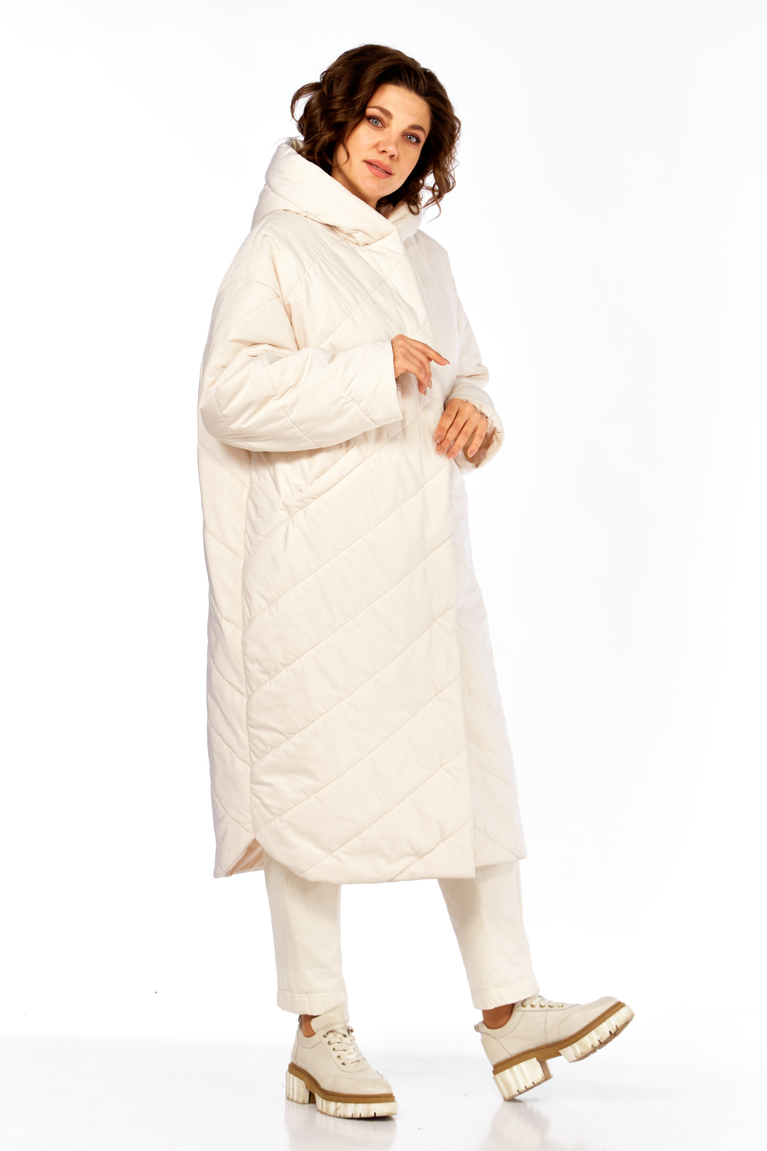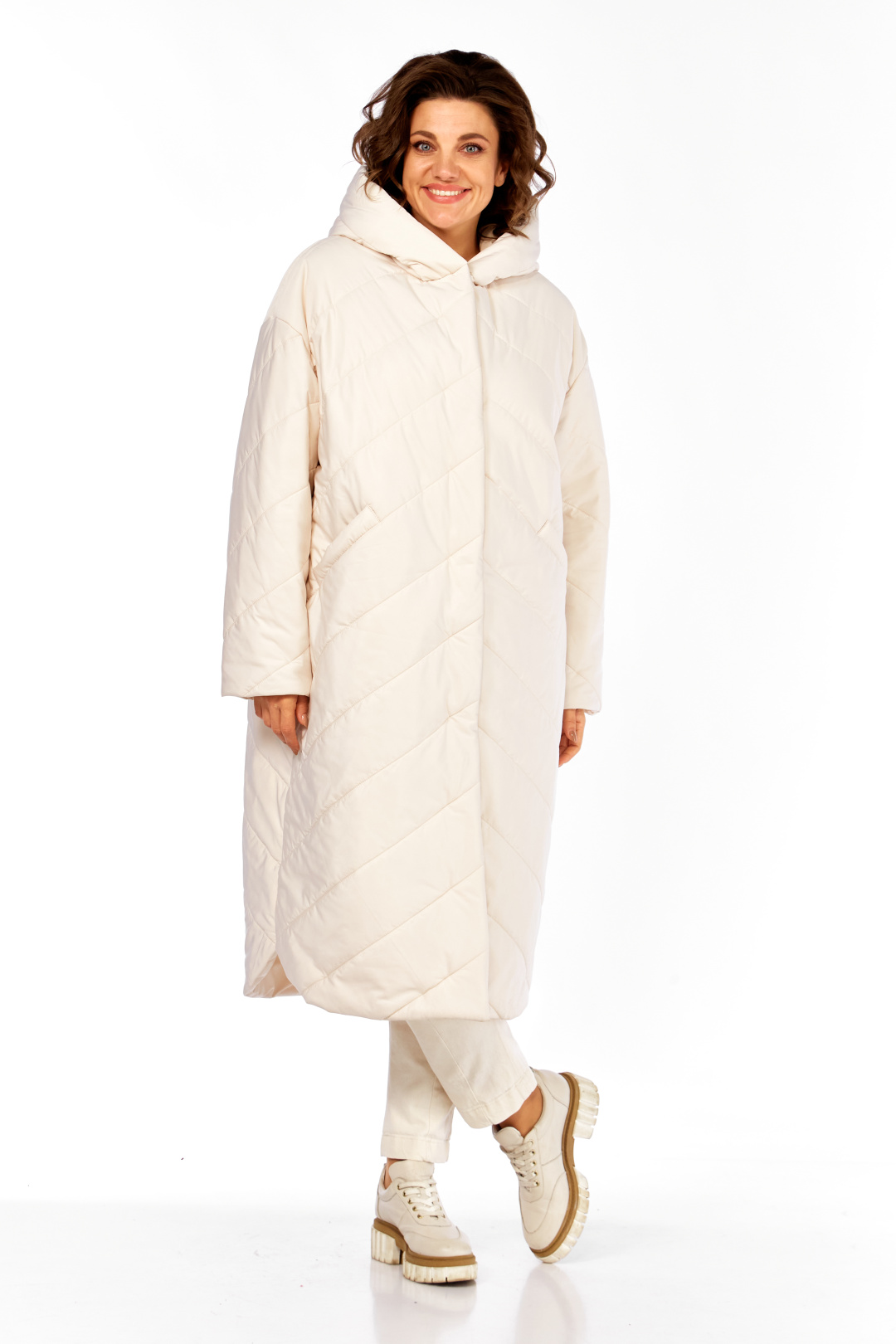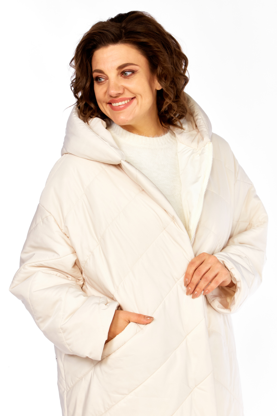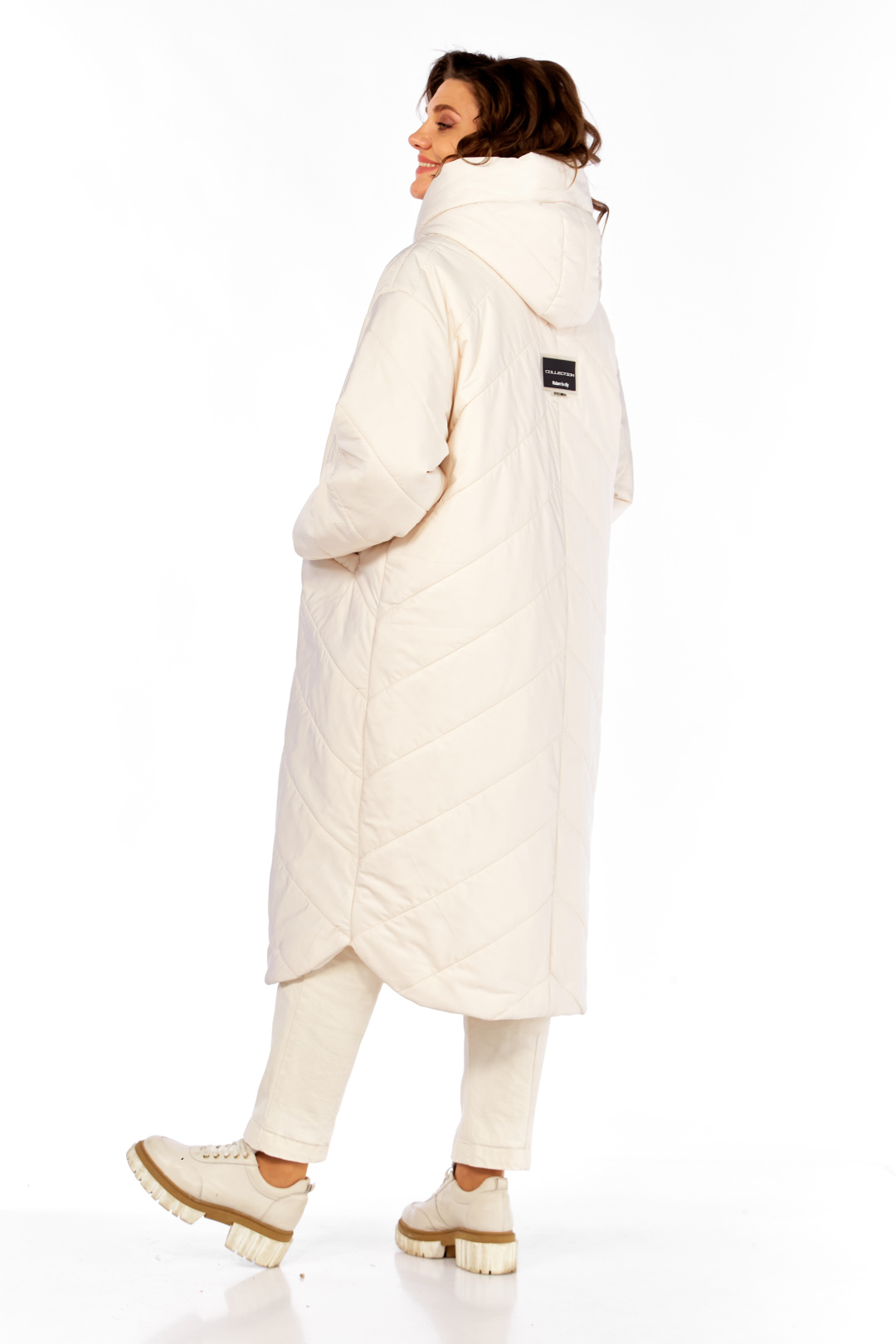 Пальто женское, прямого силуэта со смещенной застежкой на молнию (внутренняя) и кнопки. Линия плеча спущенная, рукав втачной одношовный. По переду карманы с личточкой. По спинке средний шов. Капюшон с центральной частью и отделочной деталью по отлету. В качестве отделки используется фурнитура и детали. Утеплитель- синтепон 150 гр. Длина по спинке 113см. Длина рукава 54 см.