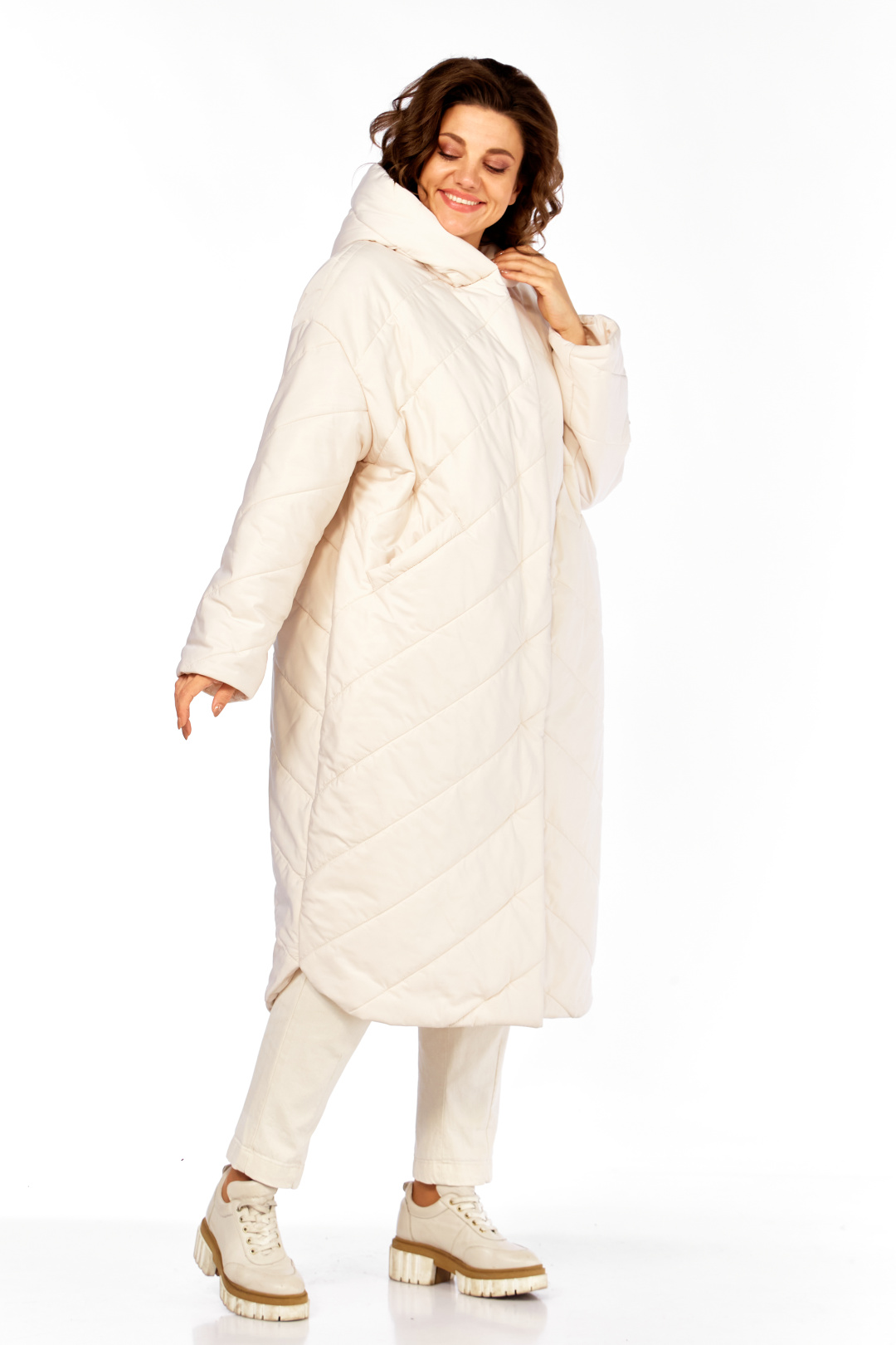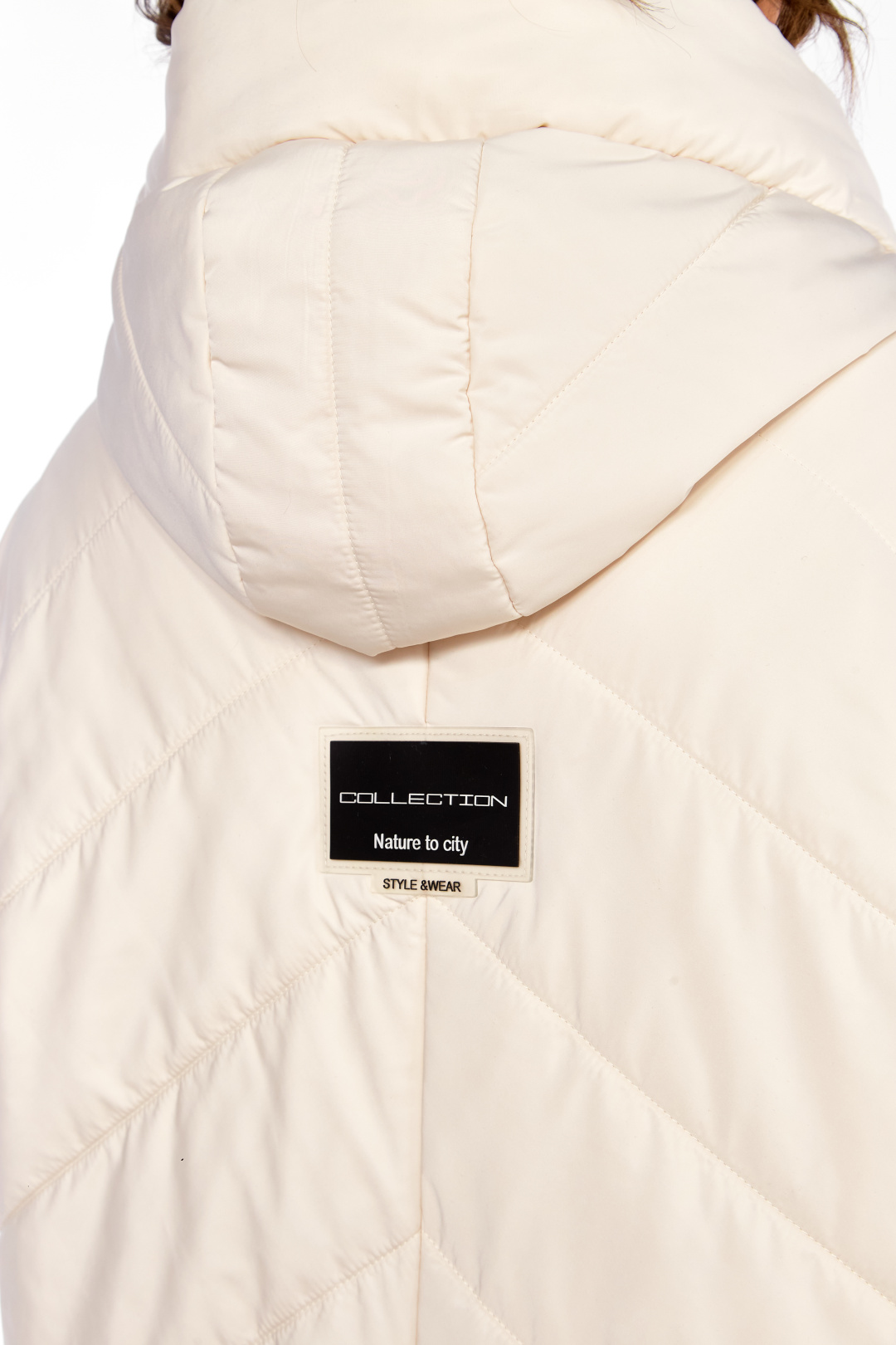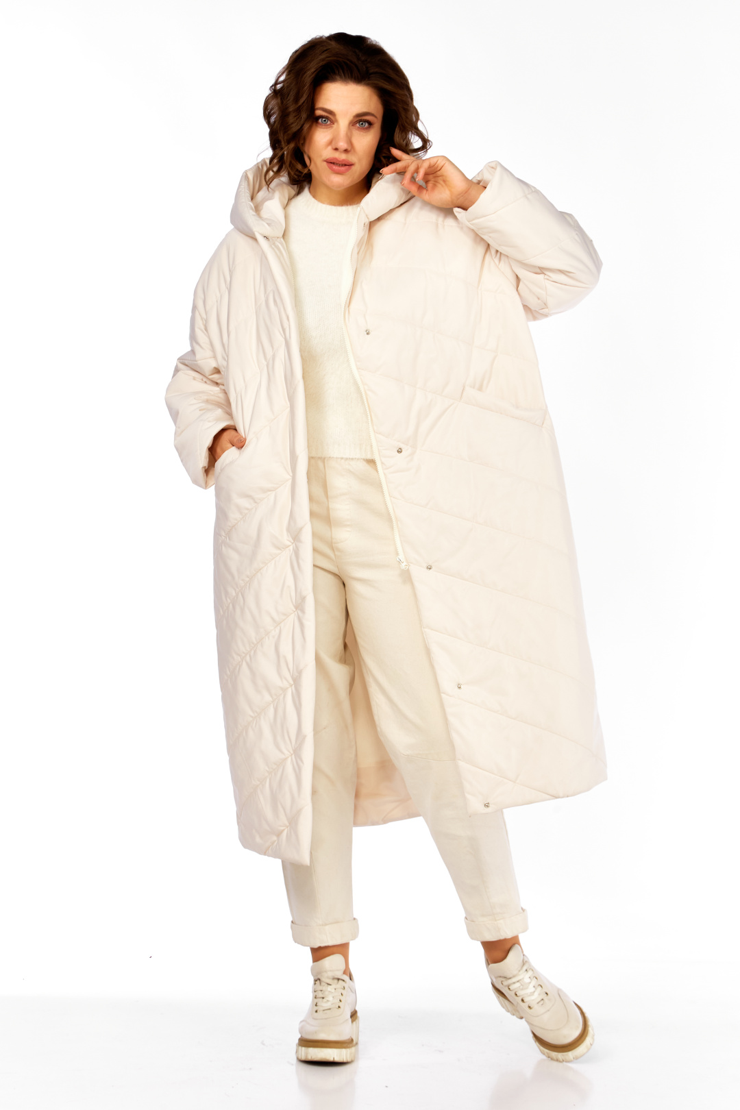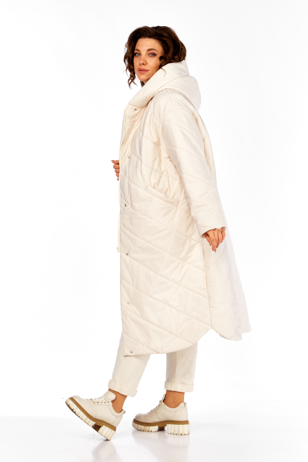 Пальто женское, прямого силуэта со смещенной застежкой на молнию (внутренняя) и кнопки. Линия плеча спущенная, рукав втачной одношовный. По переду карманы с личточкой. По спинке средний шов. Капюшон с центральной частью и отделочной деталью по отлету. В качестве отделки используется фурнитура и детали. Утеплитель- синтепон 150 гр. Длина по спинке 113см. Длина рукава 54 см.