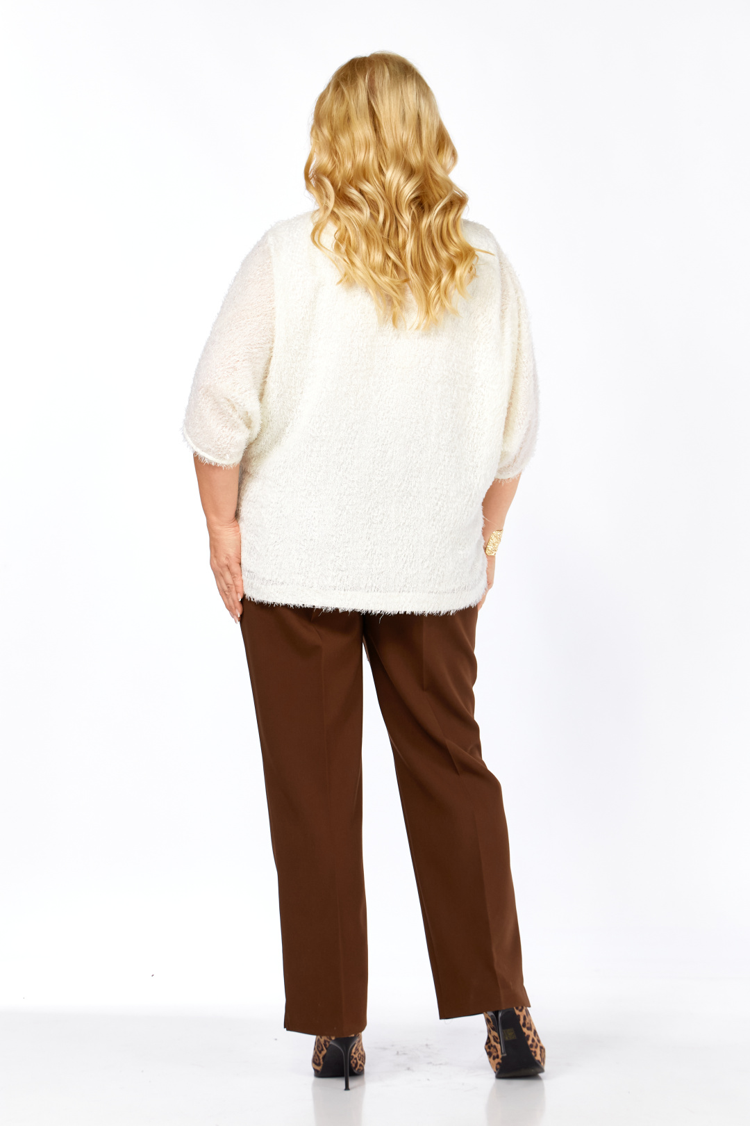 Комплект 2-ух предметный, состоит из блузки и брюк. Уникальная блуза, сочетает в себе изысканный дизайн и комфорт. Прекрасно подойдет для праздничных мероприятий. Блуза полуприлегающего кроя. Горловина аккуратной округлой формы. Эффектные рукава с фантазийным решением — усиливают модный акцент и придают дополнительный шарм. Декоративным элементом является съемная дизайнерская брошь. Брюки слегка зауженные к низу. Пояс притачной, частично на резинке. Застежка спереди на тесьму-молнию, петлю-пуговицу.