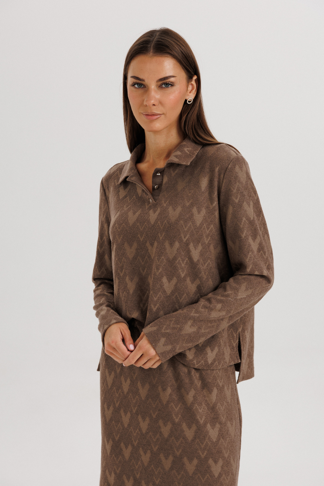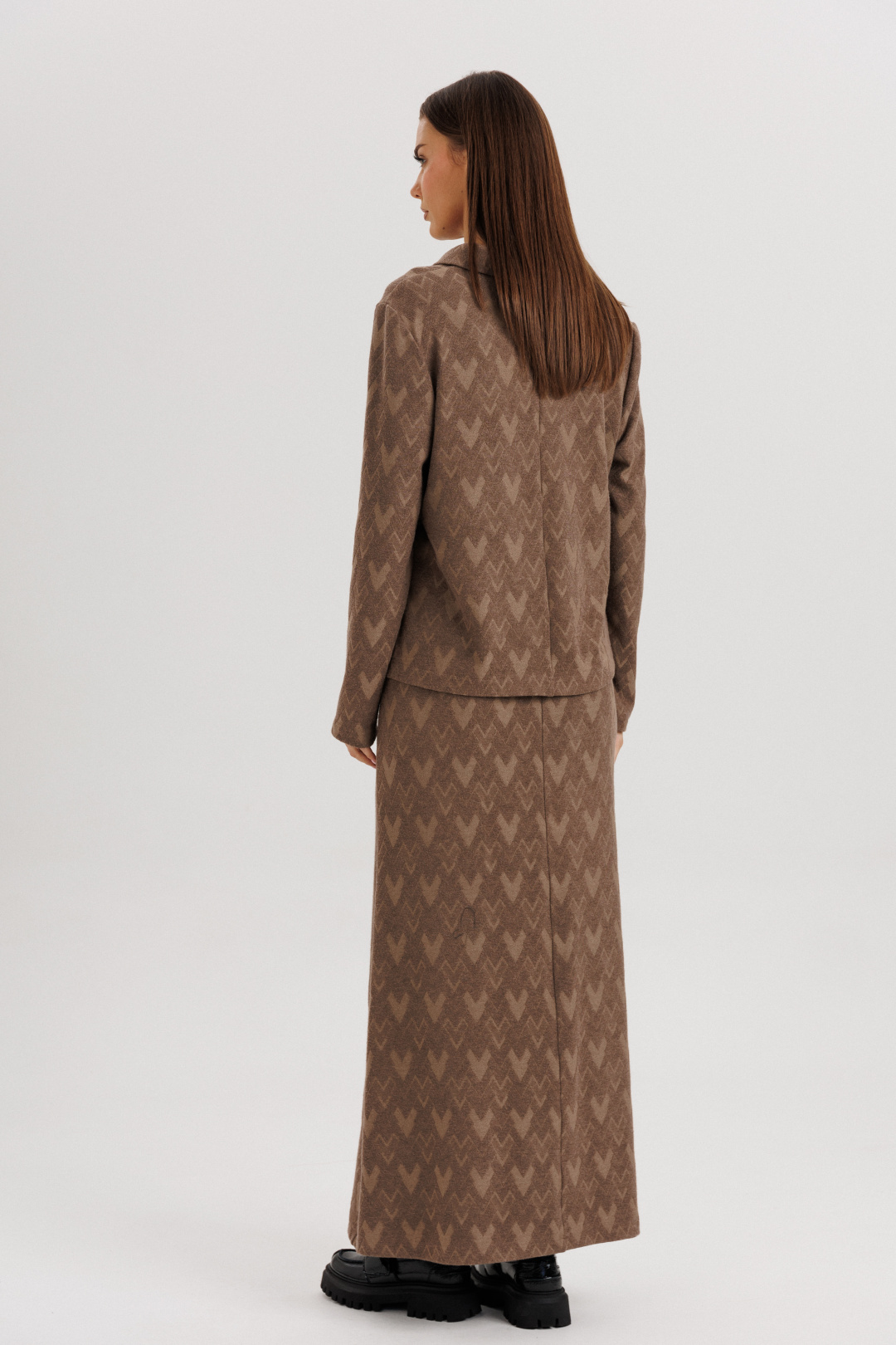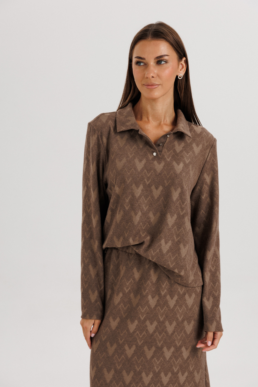 Принт — тонкий геометрический узор в тон ткани, который придаёт образу глубину и динамику.