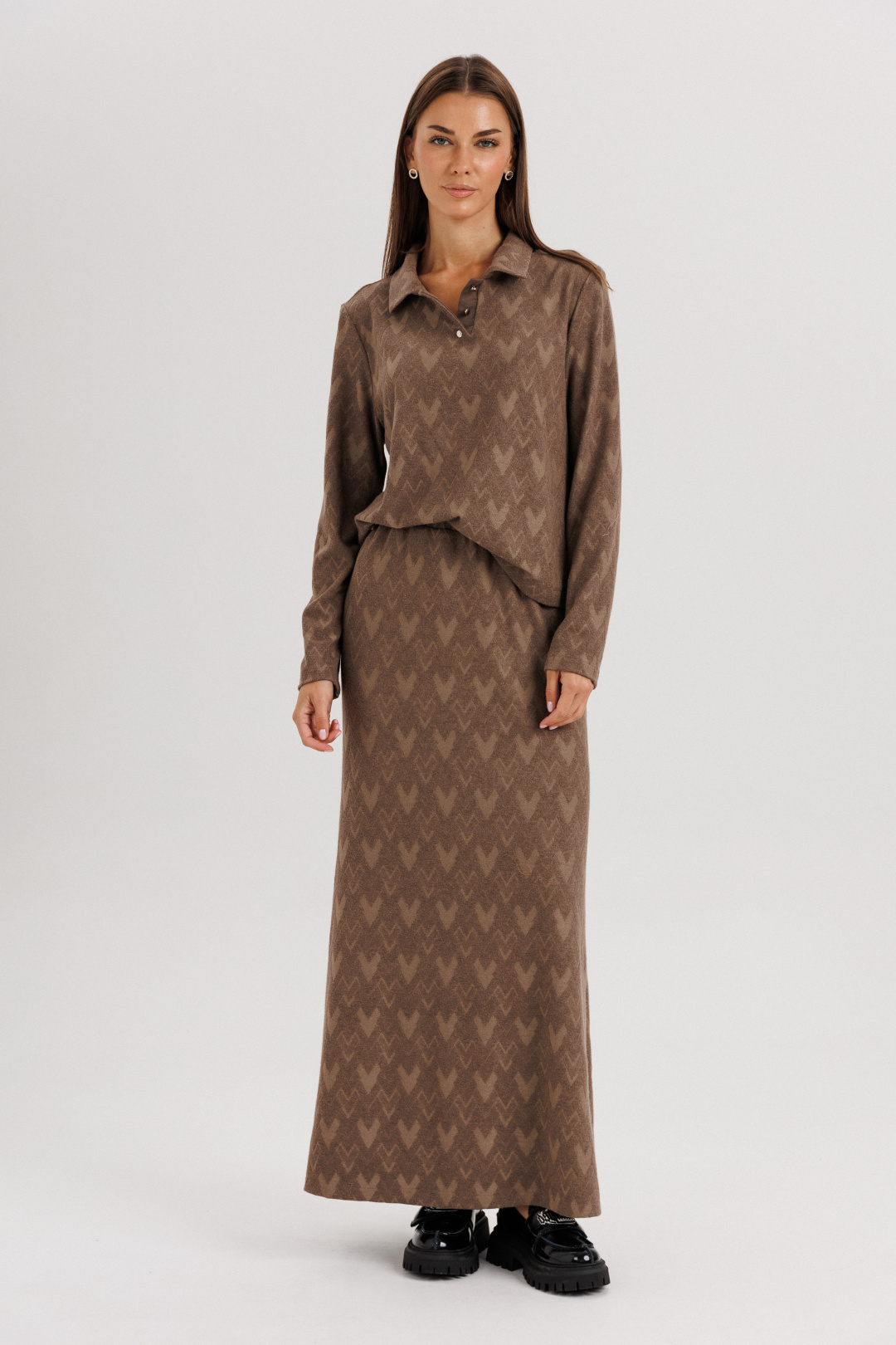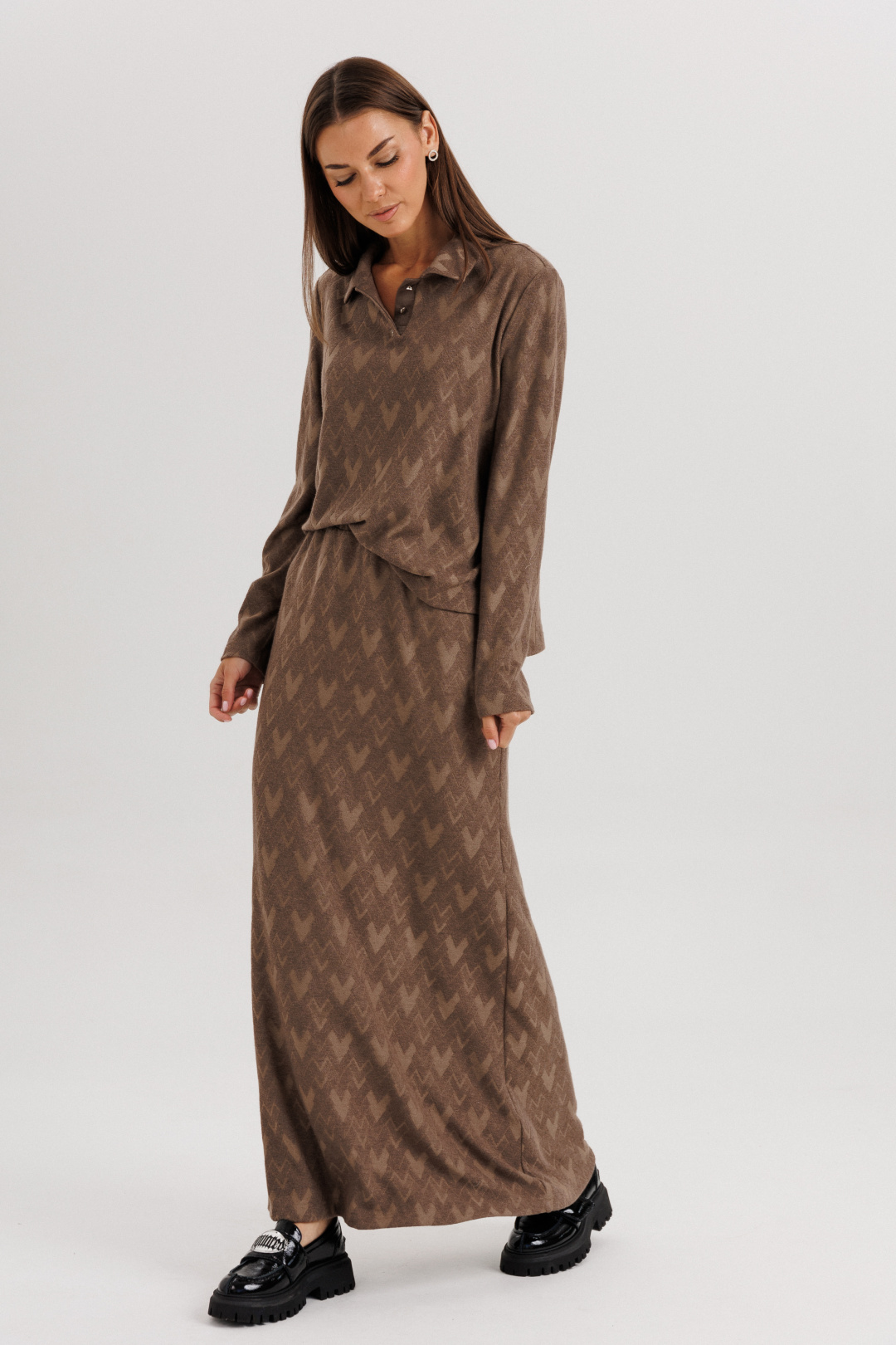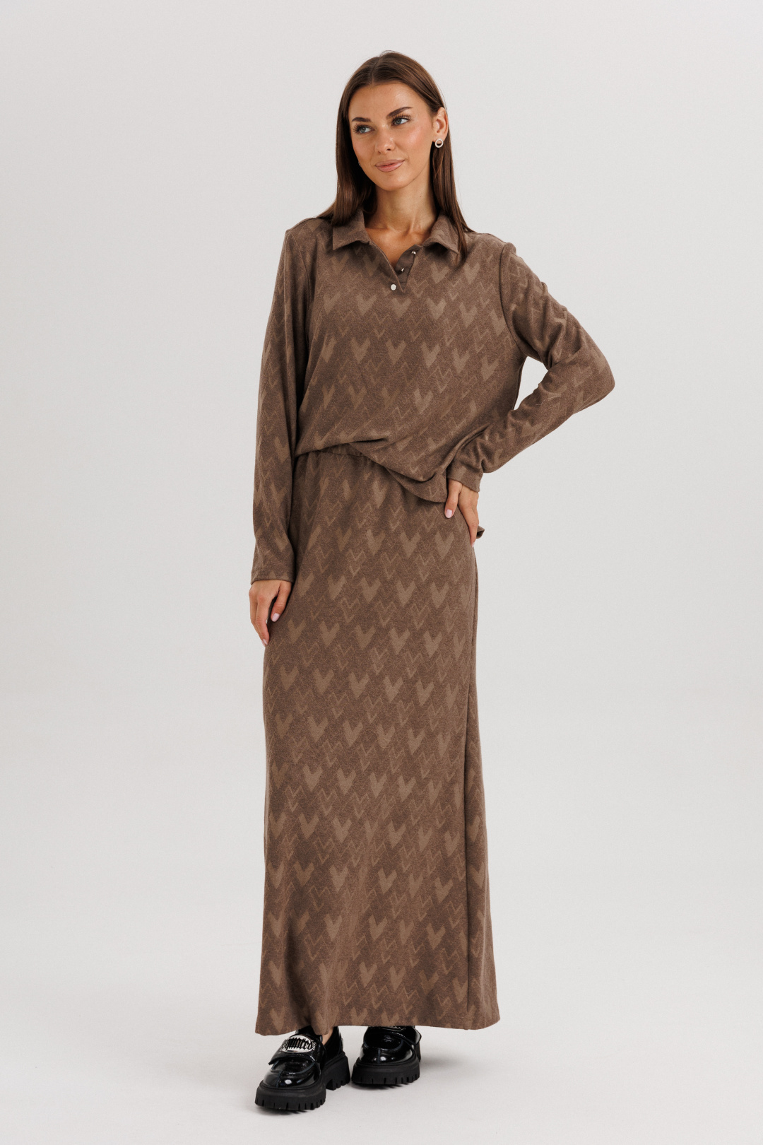 Это модный сет из мягкого трикотажа, включающий в себя джемпер-поло и юбку-«рыбку».