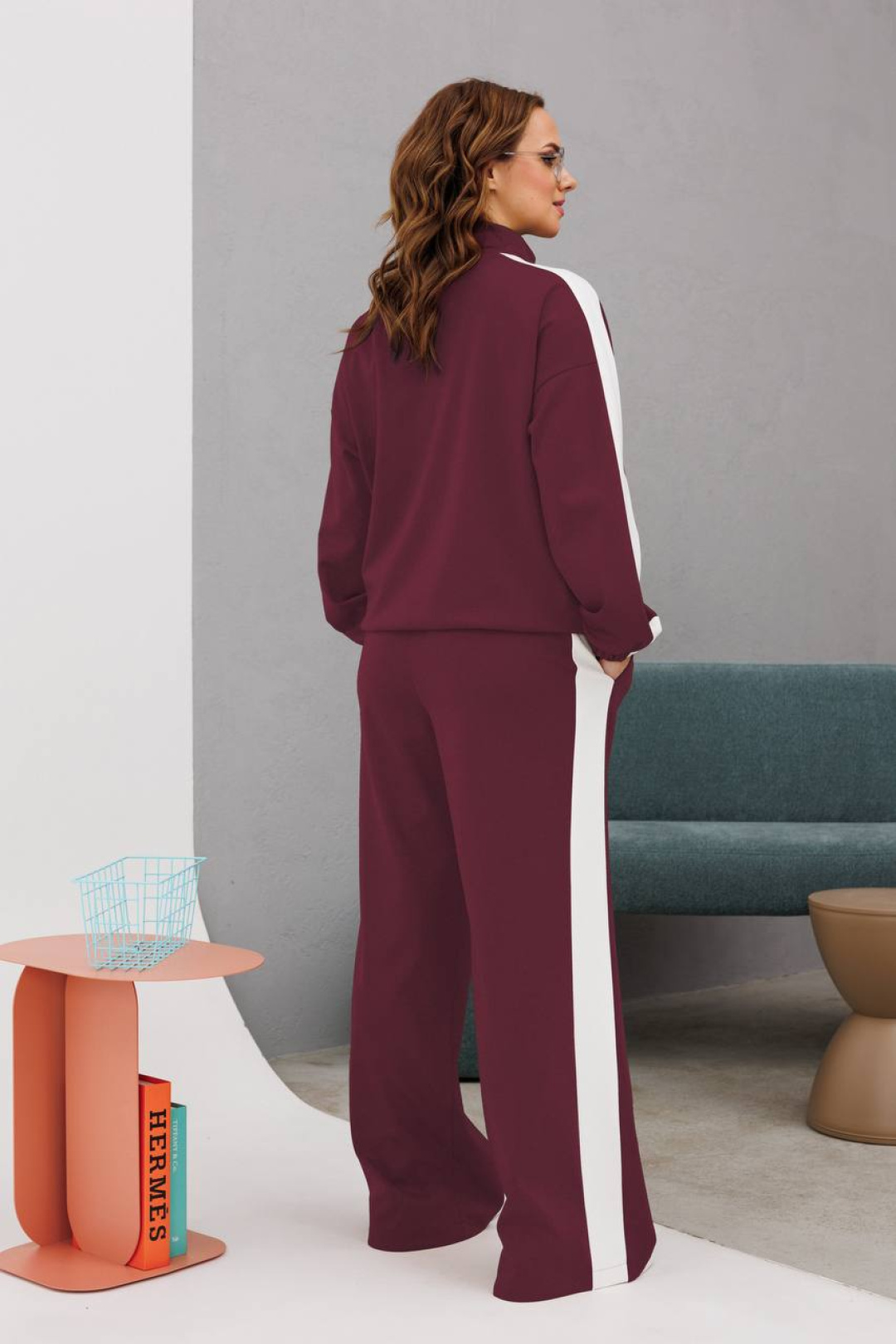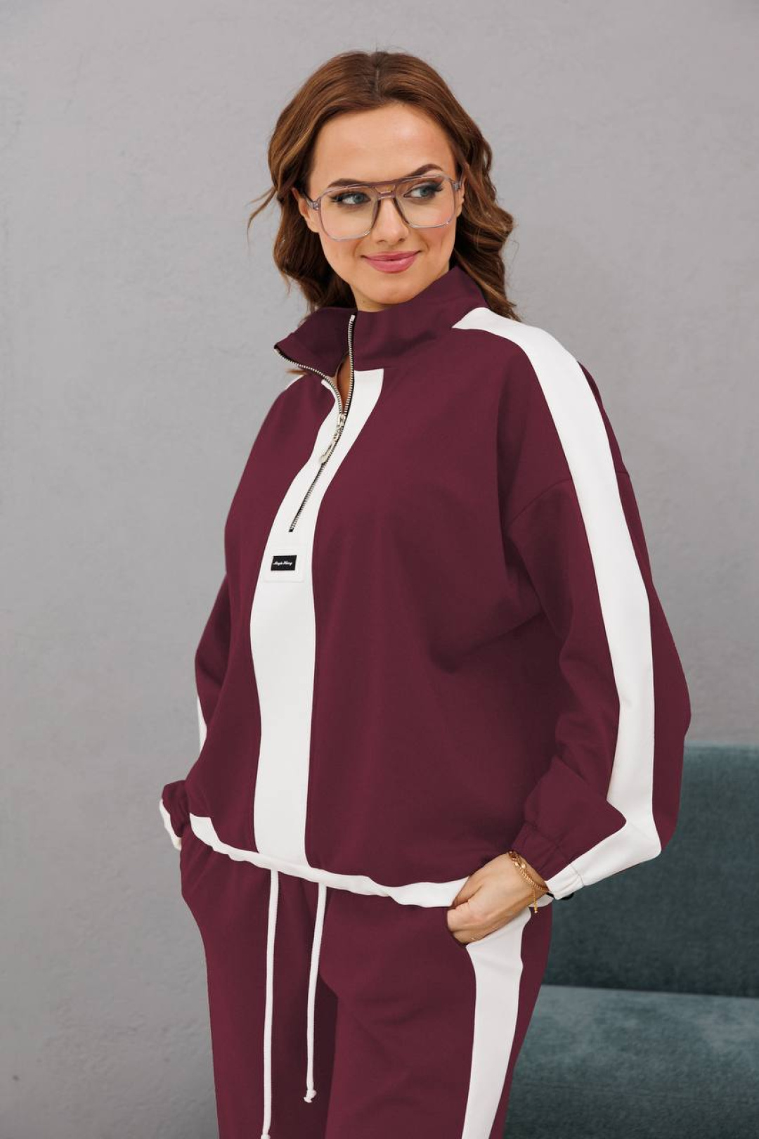 Джемпер свободного силуэта, вырез горловины со стойкой и застежкой на тесьму-молнию. Рукав спущенный, длинный. Декором являются лампасы из отделочной ткани. По лицу изделия кулиса из резинки.