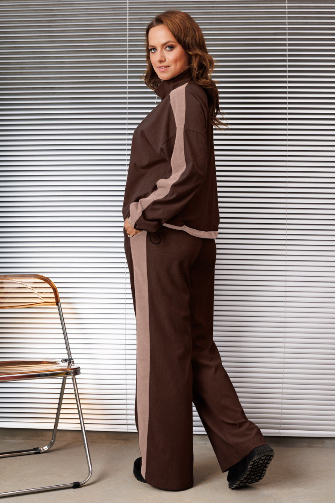 Джемпер свободного силуэта, вырез горловины со стойкой и застежкой на тесьму-молнию. Рукав спущенный, длинный. Декором являются лампасы из отделочной ткани. По лицу изделия кулиса из резинки.