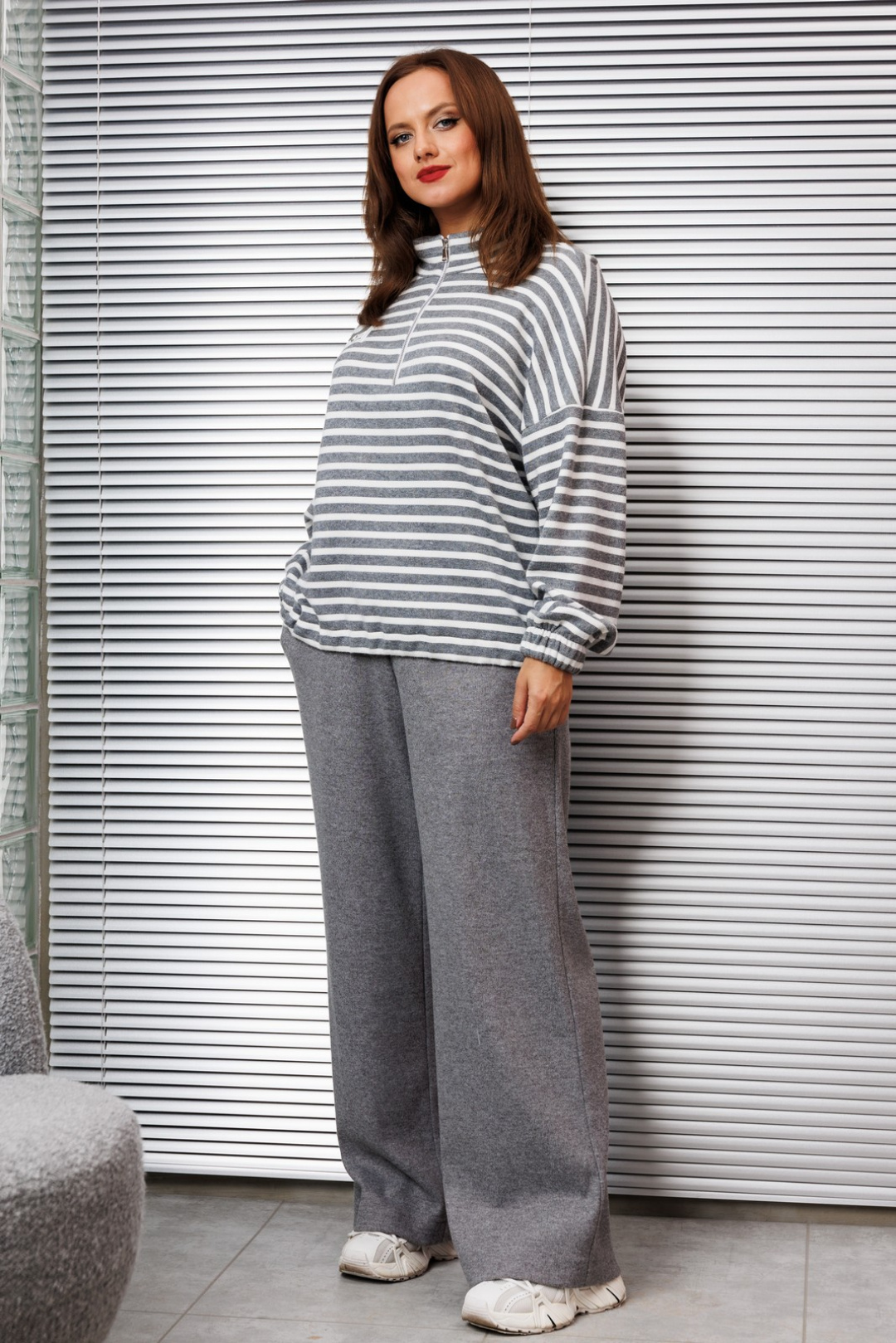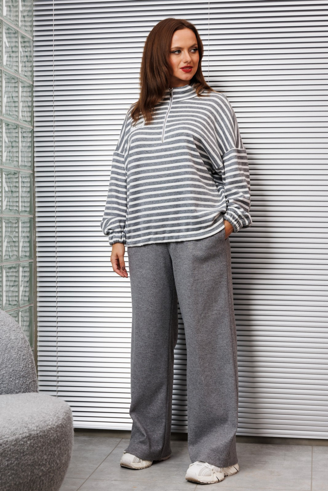 Комплект женский состоящий из джемпера и брюк. Джемпер свободного силуэта, вырез горловины со стойкой и застежкой на тесьму-молнию. Молния служит удобной застежкой, позволяя регулировать глубину выреза. Рукав спущенный, длинный. Декором являются нашивка на груди.