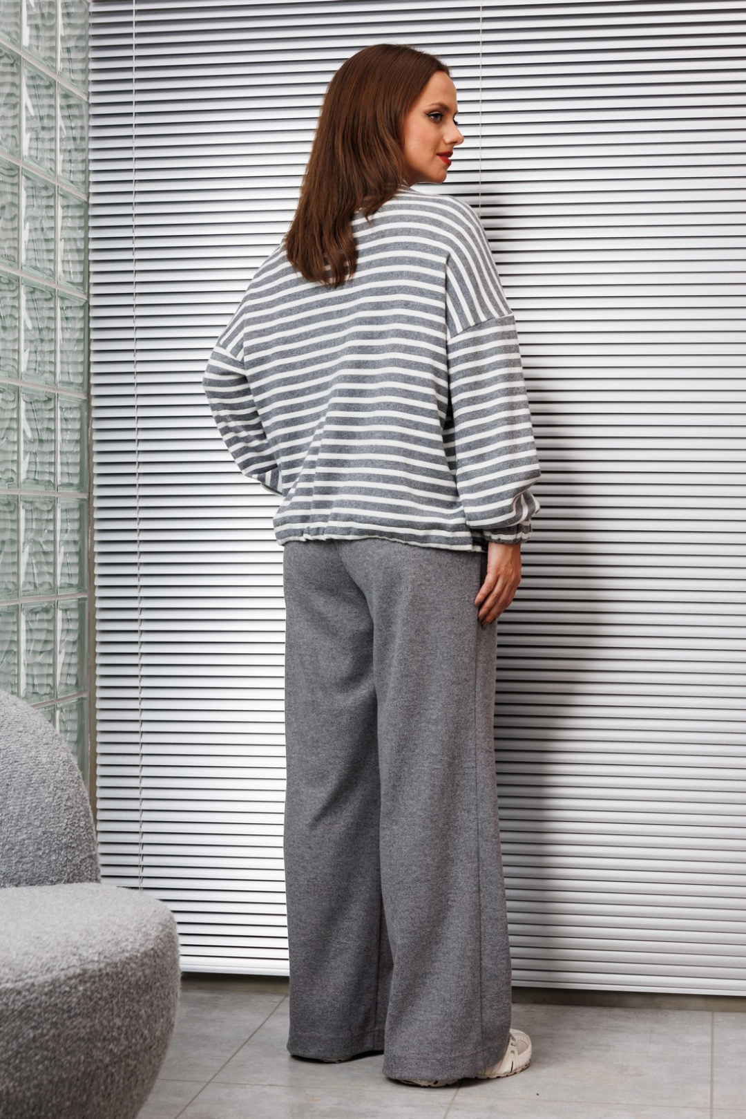 Брюки однотонные, свободного силуэта, по талии на резинке, в боковых швах карманы. Брюки без застежки из мягкой трикотажной ткани.