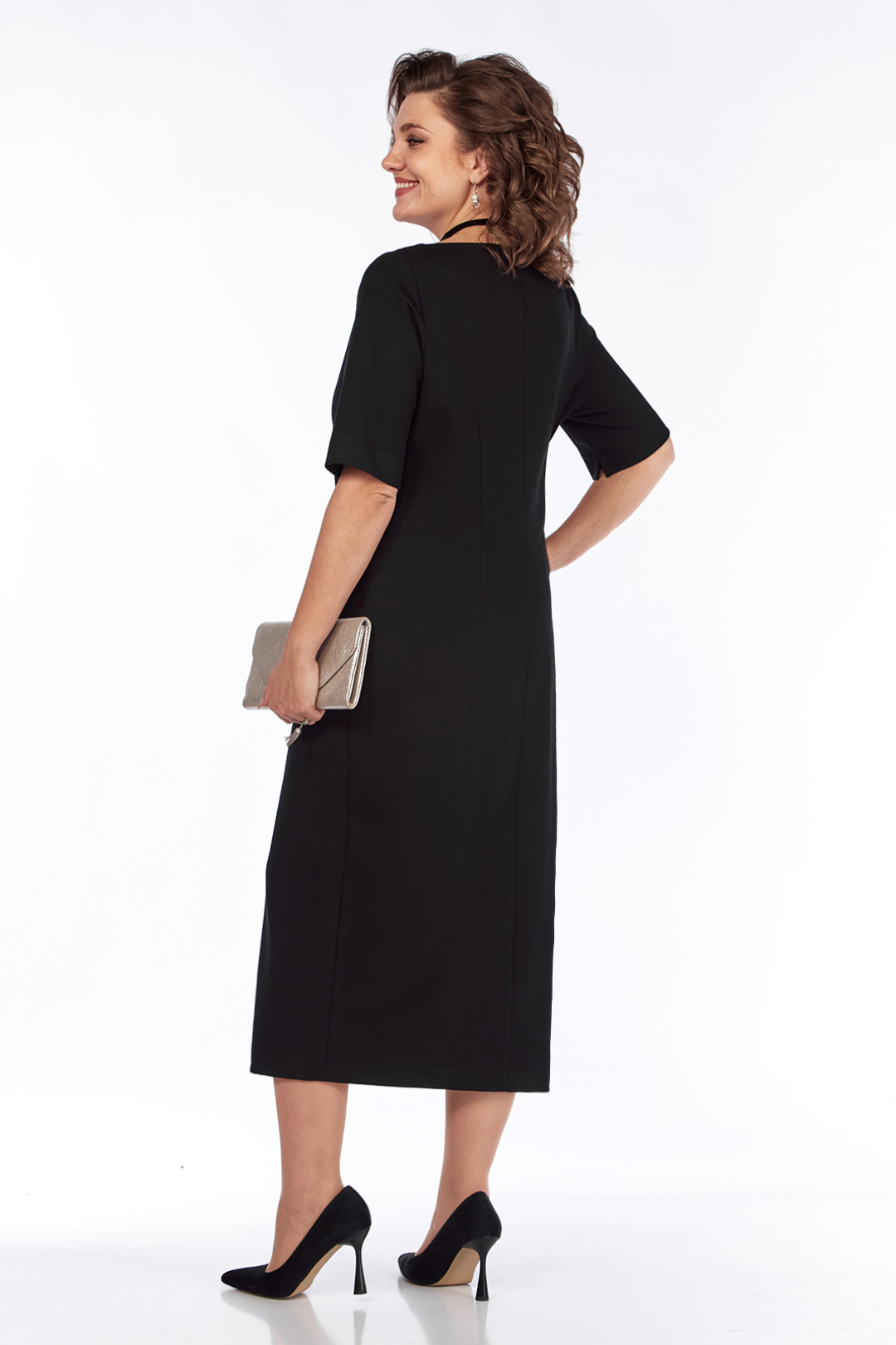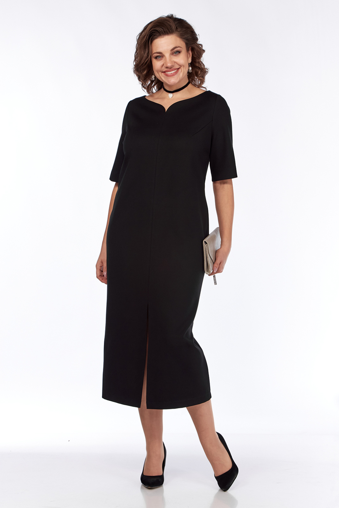 Платье женское, нарядное, полуприлегающего силуэта выполнено из фактурного трикотажного полотна премиум-класса. Горловина фигурной формы. Перед с нагрудными вытачками и средним швом в котором обработан разрез. Спинка со средним швом. Рукава втачные, одношовные с небольшим разрезом по шву.