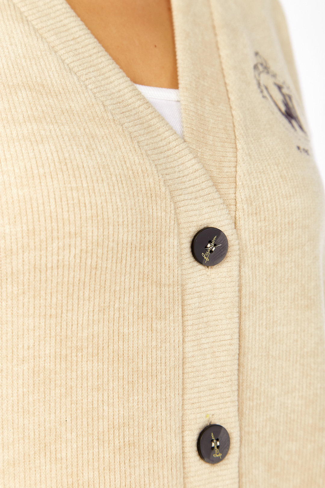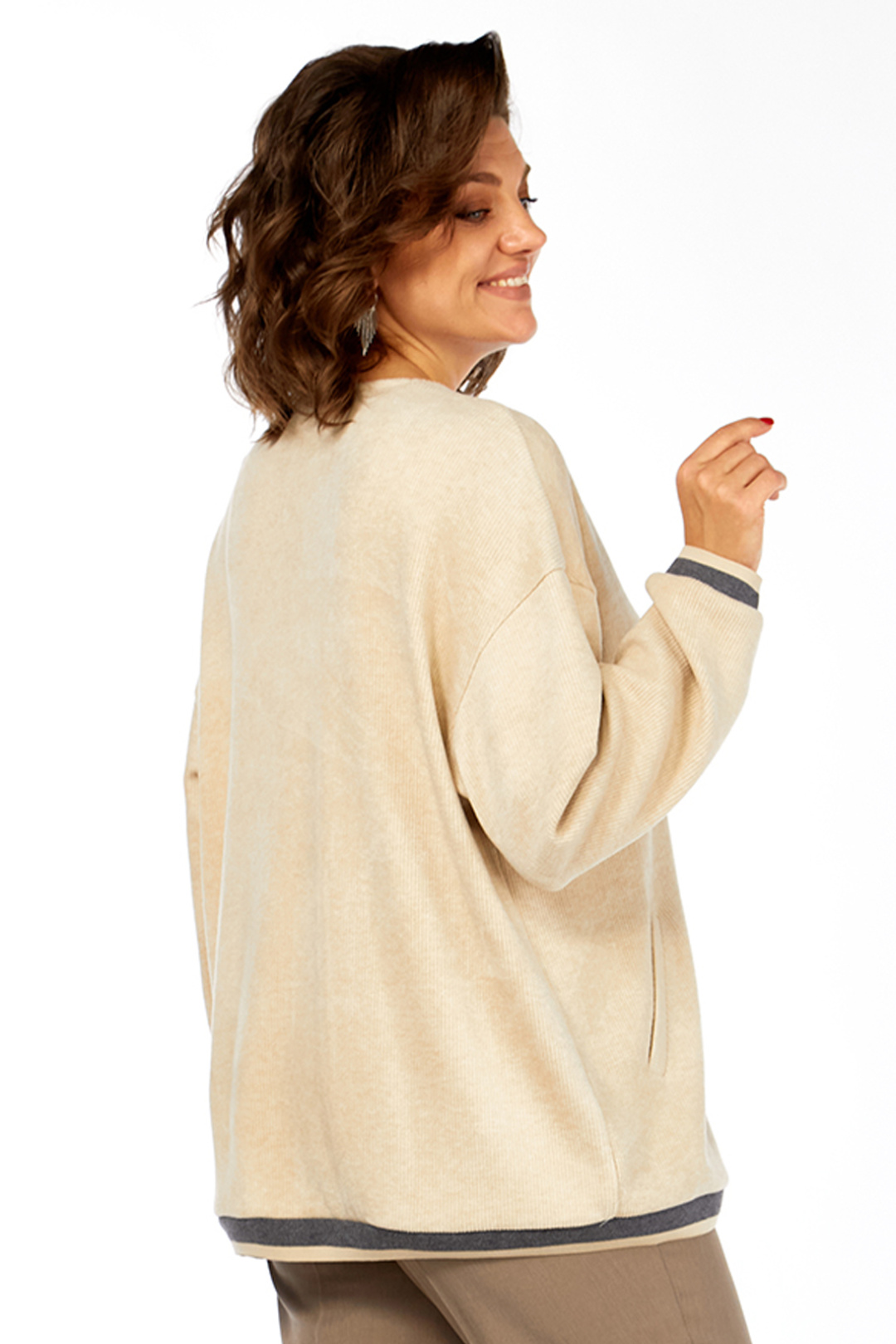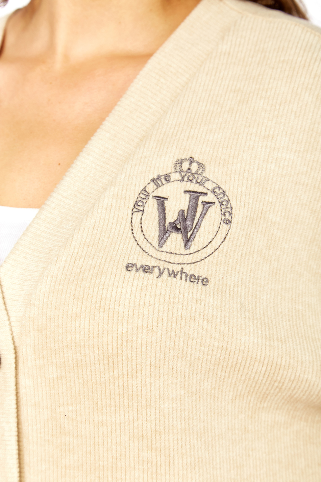 Кардиган женский, изготовлен из трикотажного полотна. Горловина  V-образной формы, застежка отрезная планка на петли и пуговицы. Карманы с листочками. По низу изделия и низу рукавов-декоративные довязы. Спинка цельнокроенная. Рукава спущенные длинные. Отделочный элемент — вышивка на детали переда.