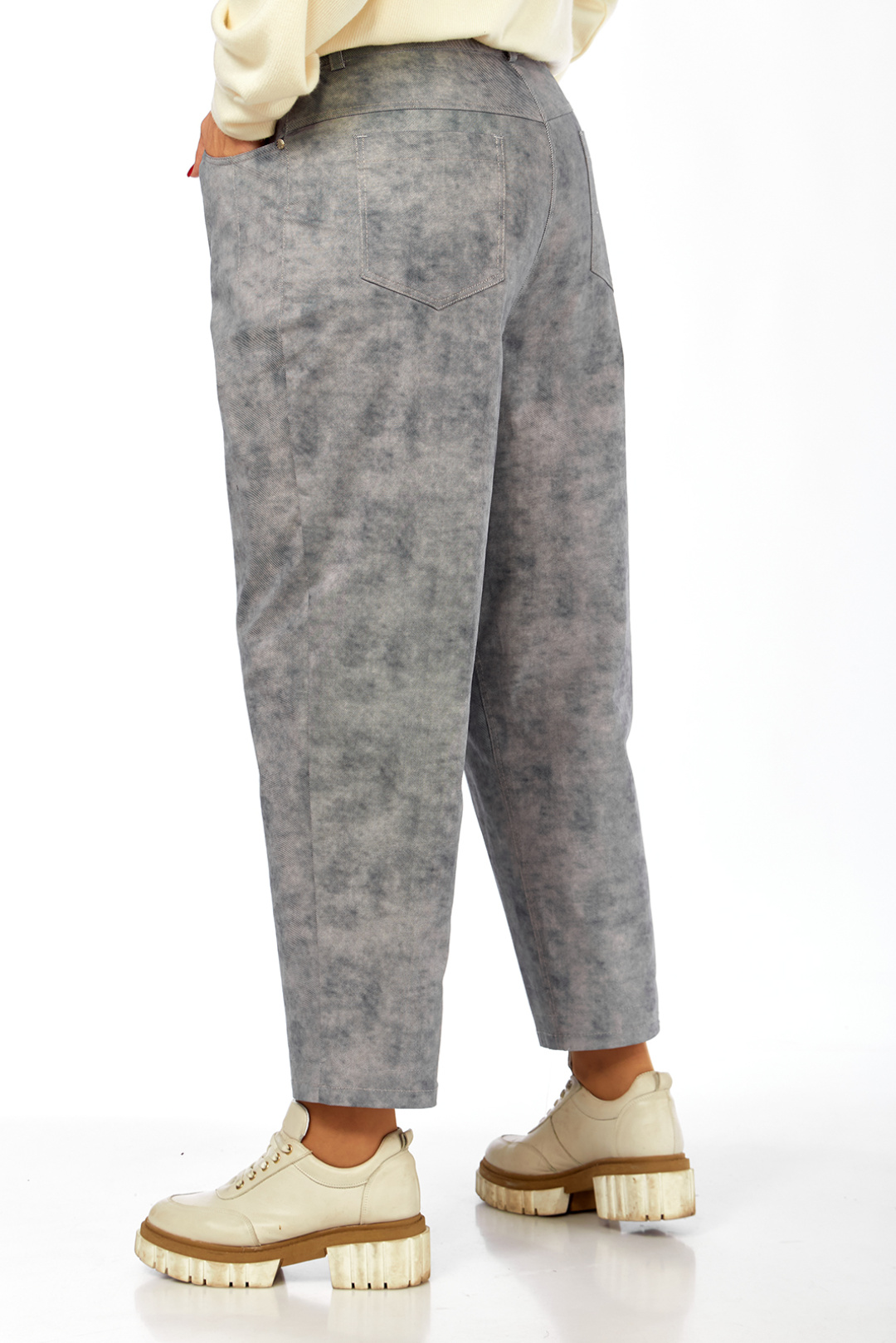Брюки женские, изготовлены из хлопковой костюмной ткани под джинс. В брюках обработан пояс, застежка на тесьму-молнию и петлю-пуговицу. На задней части брюк кокетка и накладные карманы. На передней части боковые карманы.