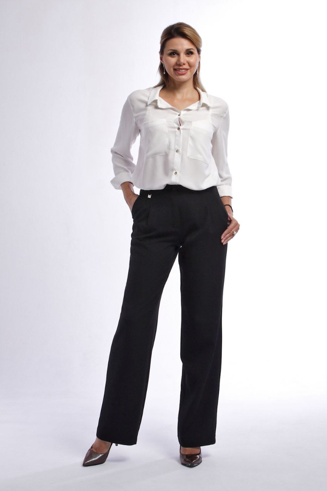 Брюки женские свободного кроя с высокой посадкой. Спереди по линии талии выполнены неглубокие складки. На передних частях выполнены карманы с отрезными бочками. Застежка петля, пуговица, молния. По спинке талиевые вытачки и прорезной карман-имитация с планками. Длина шагового шва 81 см. Ткань - текстиль с добавлением лайкры, хорошо тянется, малосминаемая, не деформируется после стирки.