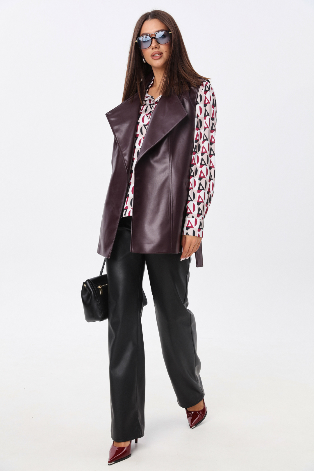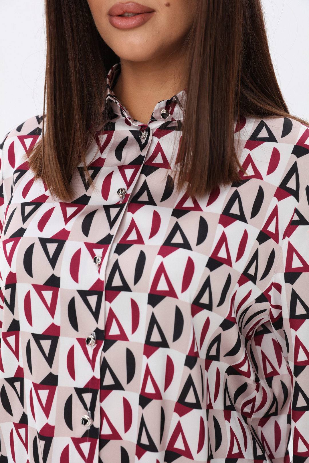 Блузка прямого силуэта с оригинальным принтом из лёгкой ткани с атласным мягким блеском. Воротник рубашечного типа, застежка на прорезные петли и пуговицы. В нижней части рукава заложены складки, манжета на двух пуговицах. Рост фотомодели 175 см. Размер у фотомодели – 44.