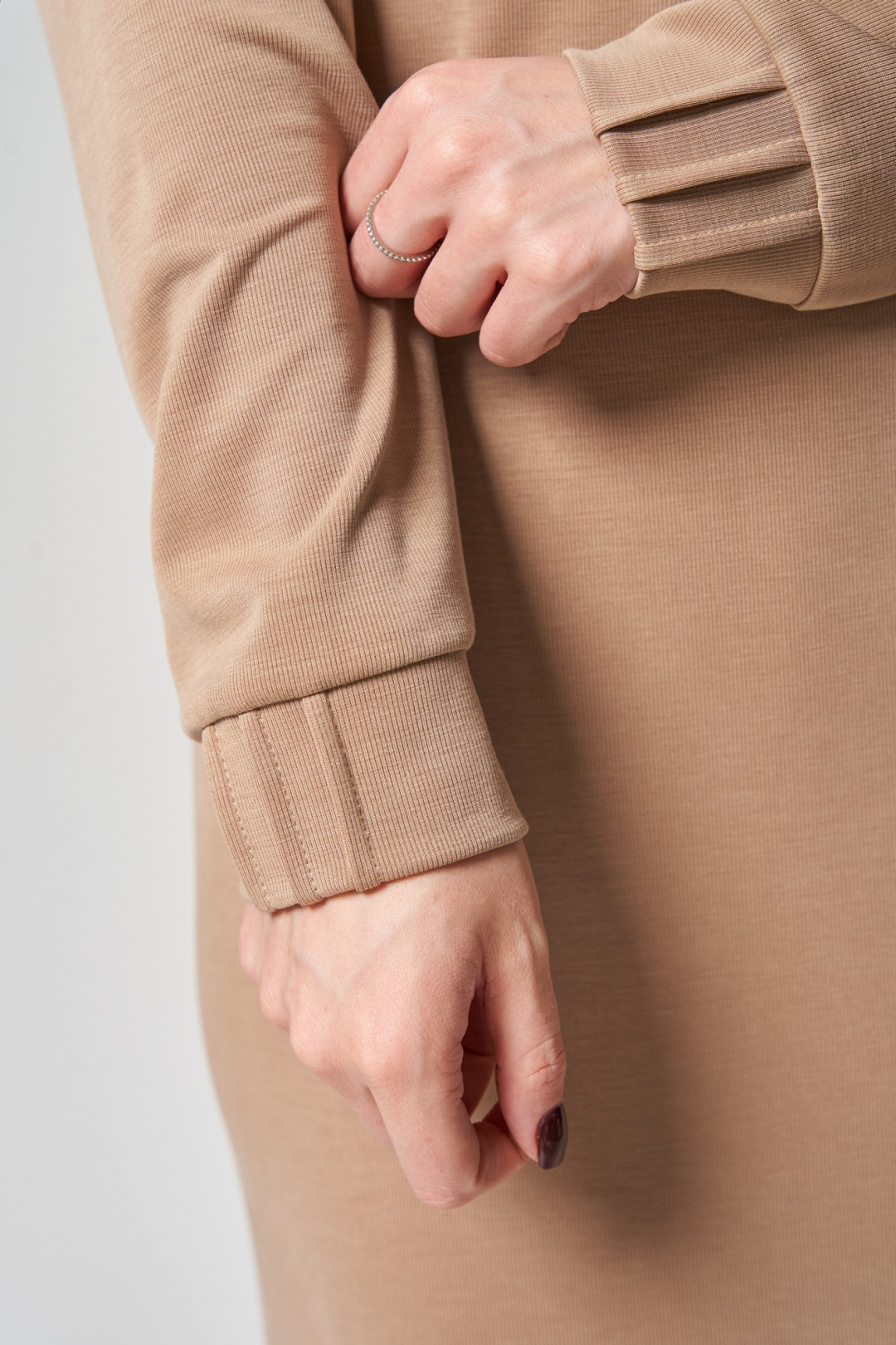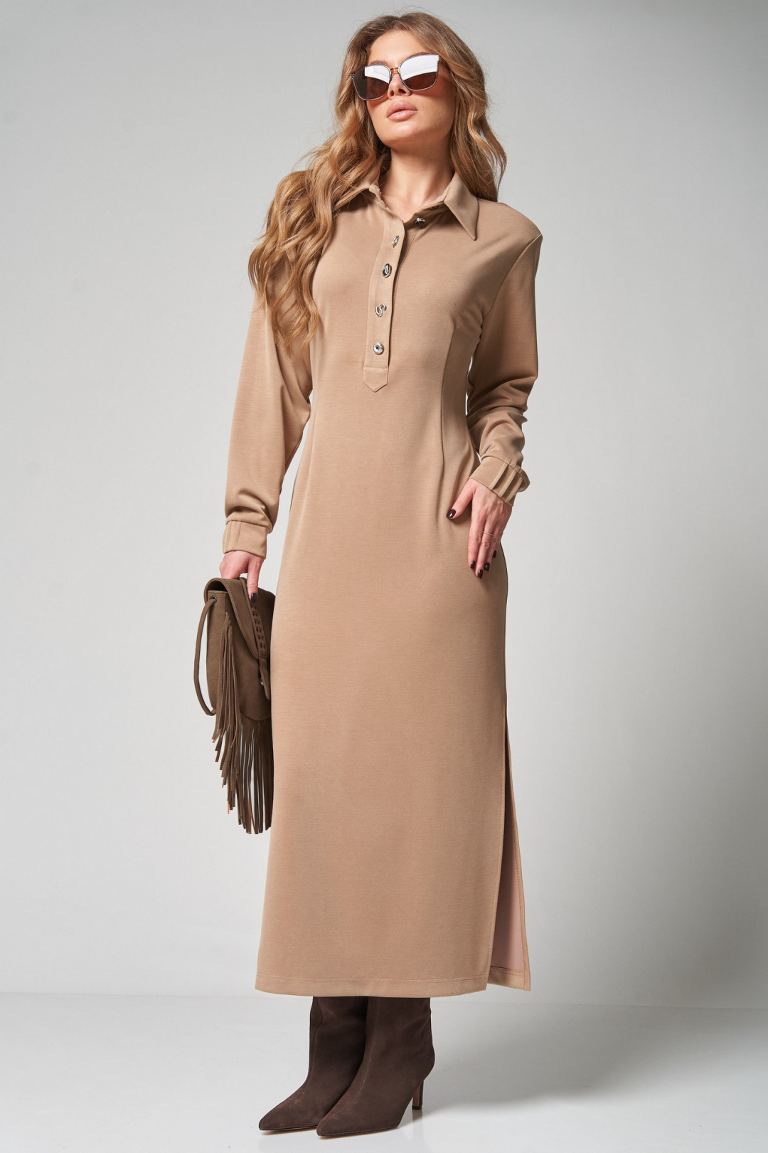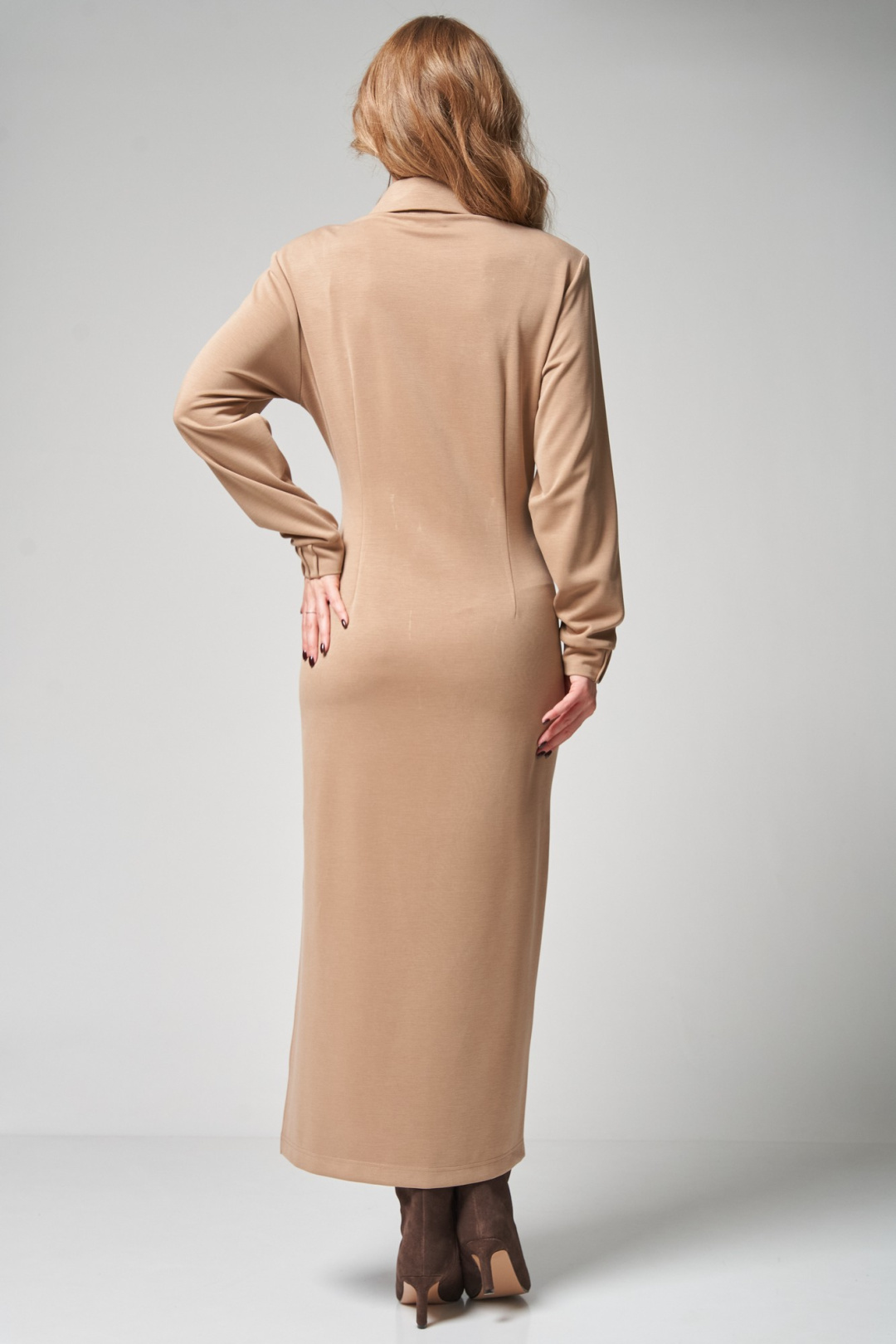 Вырез горловины округлой формы, воротник втачной с отрезной стойкой. Застежка на петли и пуговицы по планке и 1 петлю и пуговицу на стойке воротника. Перед платья с талиевыми вытачками, с втачными планками. Спинка платья с талиевыми вытачками. Рукава втачные одношовные длинные с притачными манжетами, на манжетах обработаны по 3 «защипа».