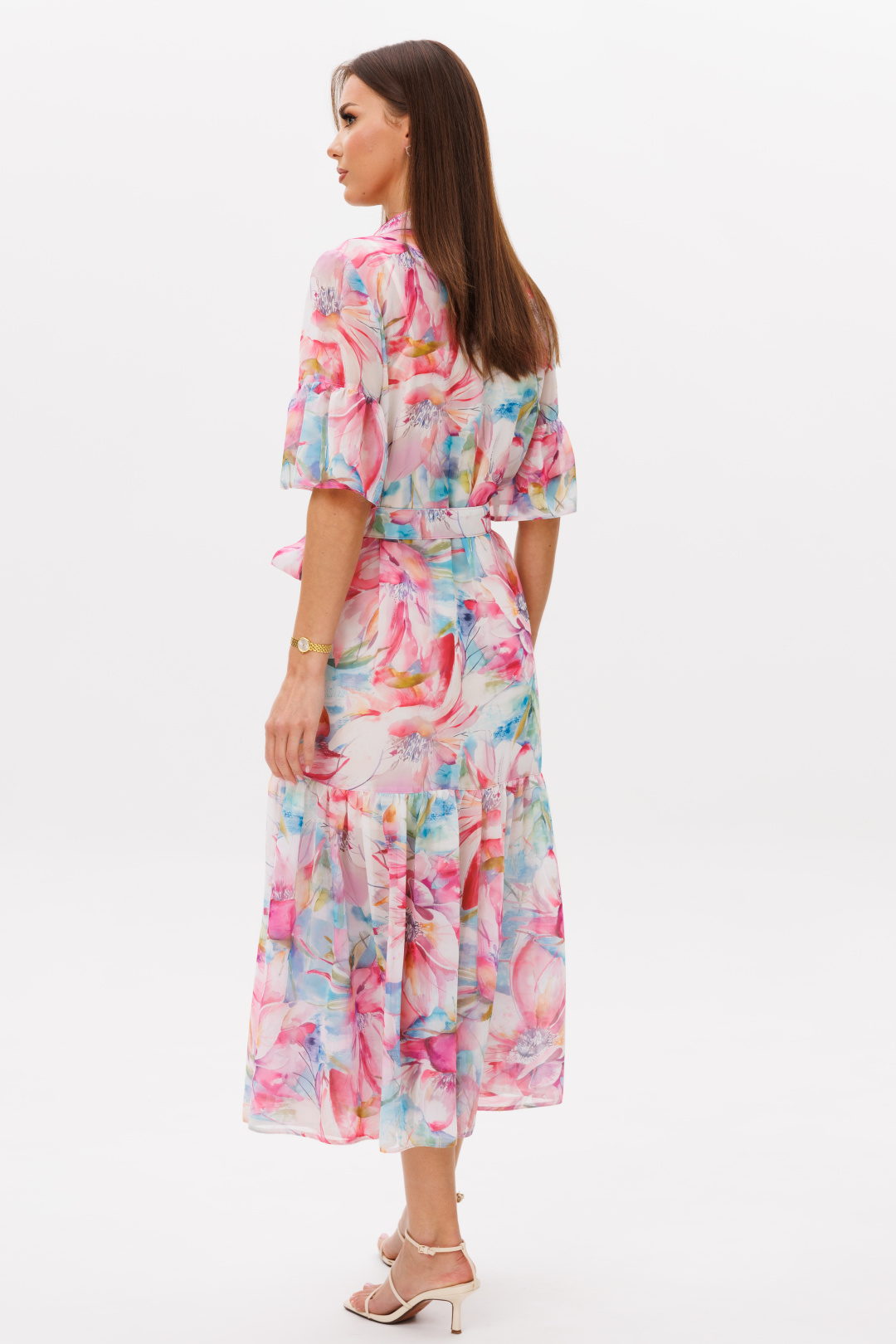 К основе платья притачена рюша со сборкой. Длина изделия платья по спинке 130 см, длина по спинке до притачной рюши 78 см.