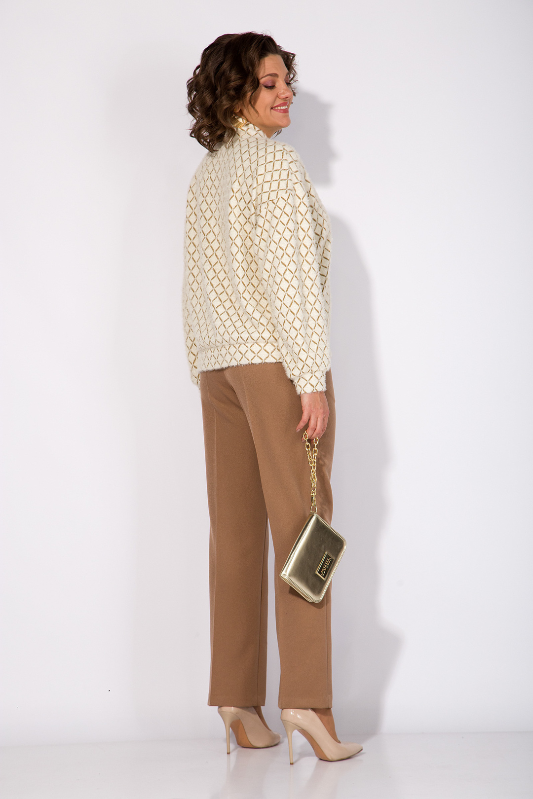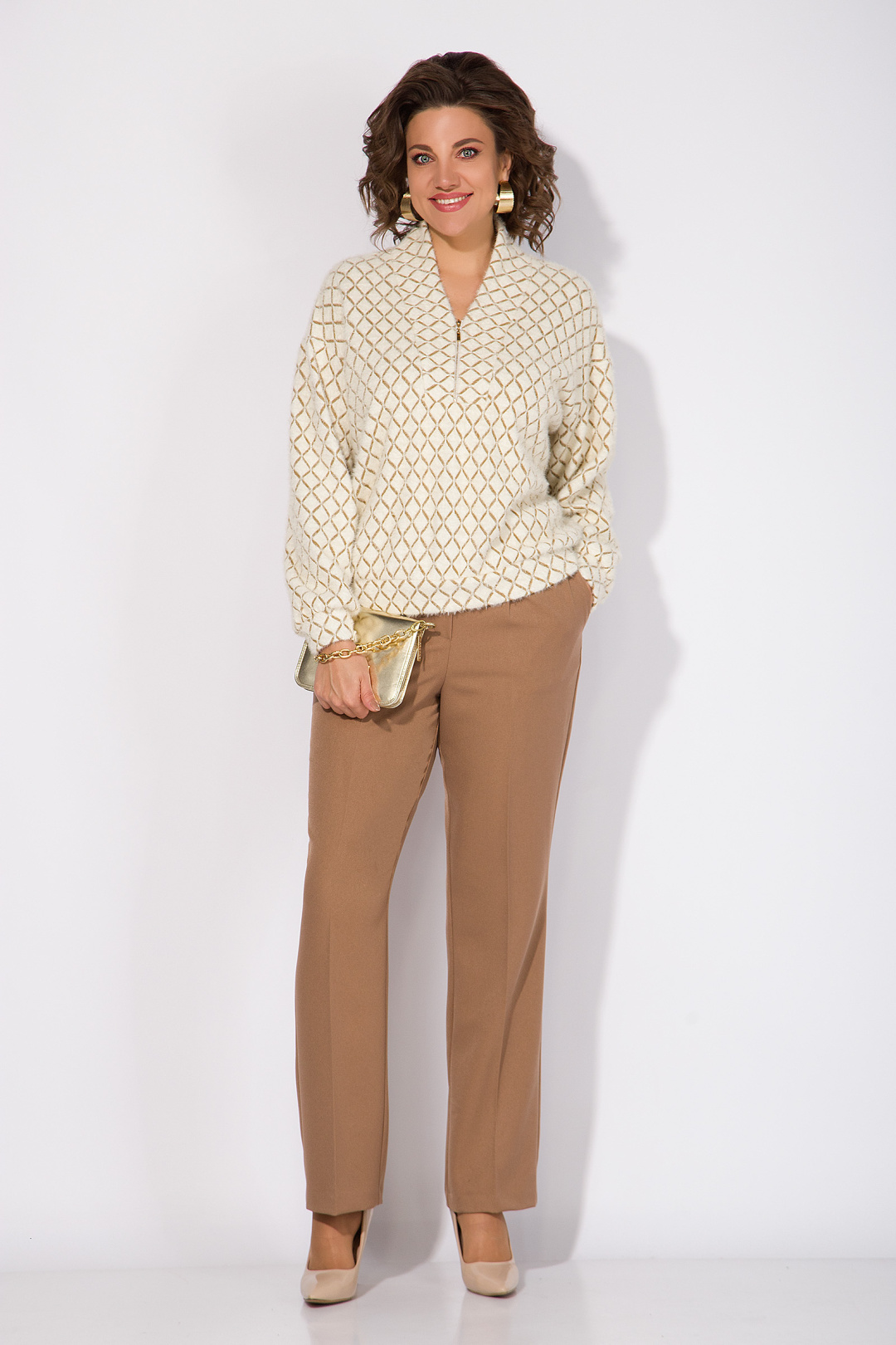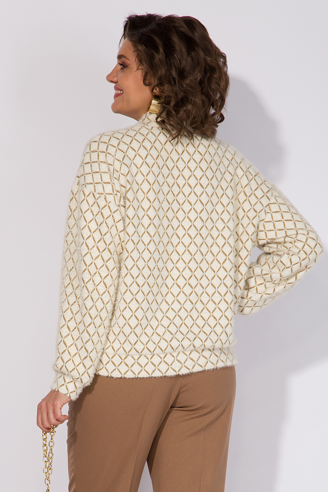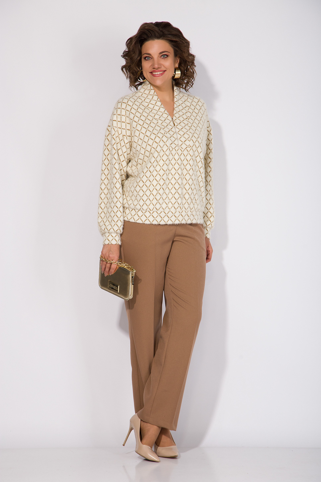 Мягкий и уютный джемпер в стиле «OLD MONEY» выполнен из трикотажа с эффектом ангоры с рисунком. Эффектная V-образна горловина, переходящая в мягкую стойку. Плечевой пояс спущенный, с рукавом полной длины. Низ изделия и низ рукава оформлен притачными манжетами из основной ткани. Спинка без особенностей.