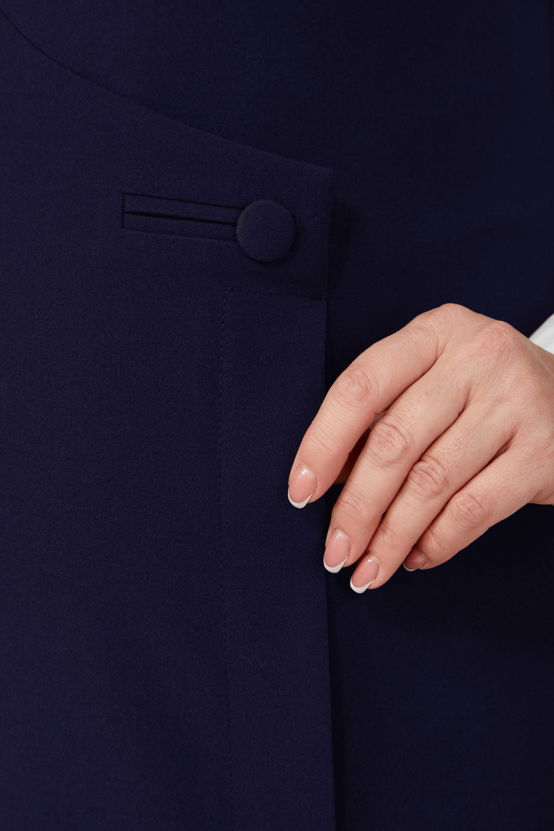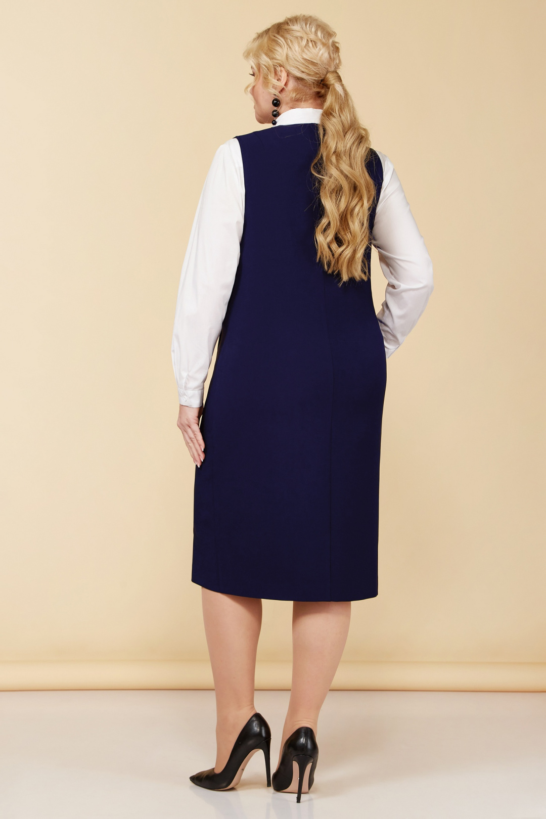 Изящный текстильный сарафан тёмно-синего цвета представляет собой идеальное сочетание универсальности и стиля. Модель с полуприлегающим силуэтом дополнена глубоким V-образным вырезом горловины, который акцентирует внимание на изысканности дизайна. Сарафан выполнен без подкладки, обеспечивая комфорт при носке. Особый шарм образу придают нагрудные вытачки из проймы и наличие шлицы по переду, а также плечевые вытачки и средний шов по спинке, делающие силуэт более структурированным. Эта модель идеальна для создания деловых и повседневных ансамблей.