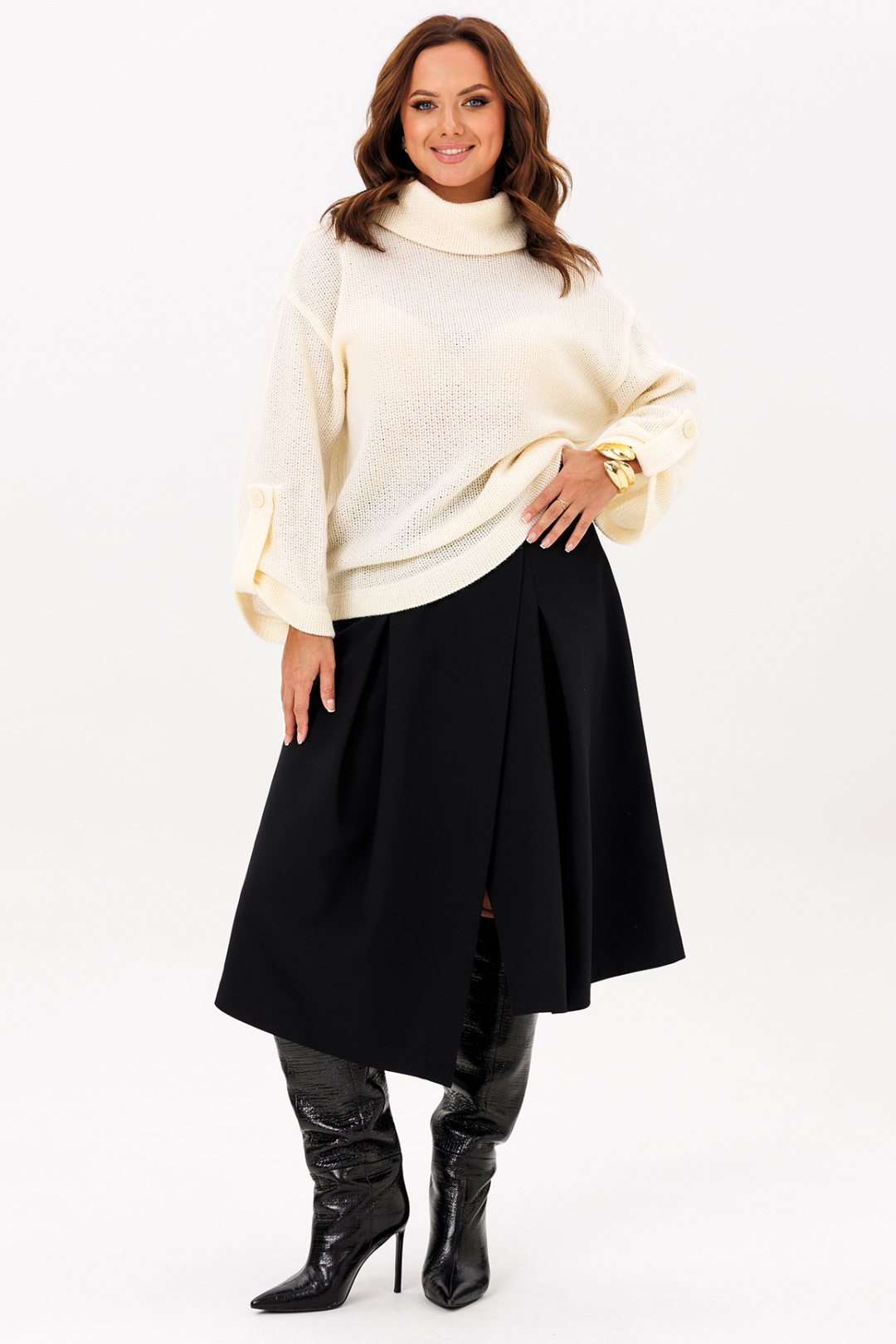 Элегантный джемпер бежевого цвета, выполненный из мягкого вязаного трикотажа, создаст уютный и стильный образ. Дизайн джемпера украшен воротником-хомутом, который добавляет изысканности. Линия плеча спущена, что придает изделию расслабленный силуэт. Длинные рукава с патами на пуговице подчеркивают продуманность деталей. Длина по спинке составляет 60 см, идеально подходящая для сочетания как с брюками, так и с юбками. Этот джемпер станет прекрасным дополнением к осенне-зимнему гардеробу.