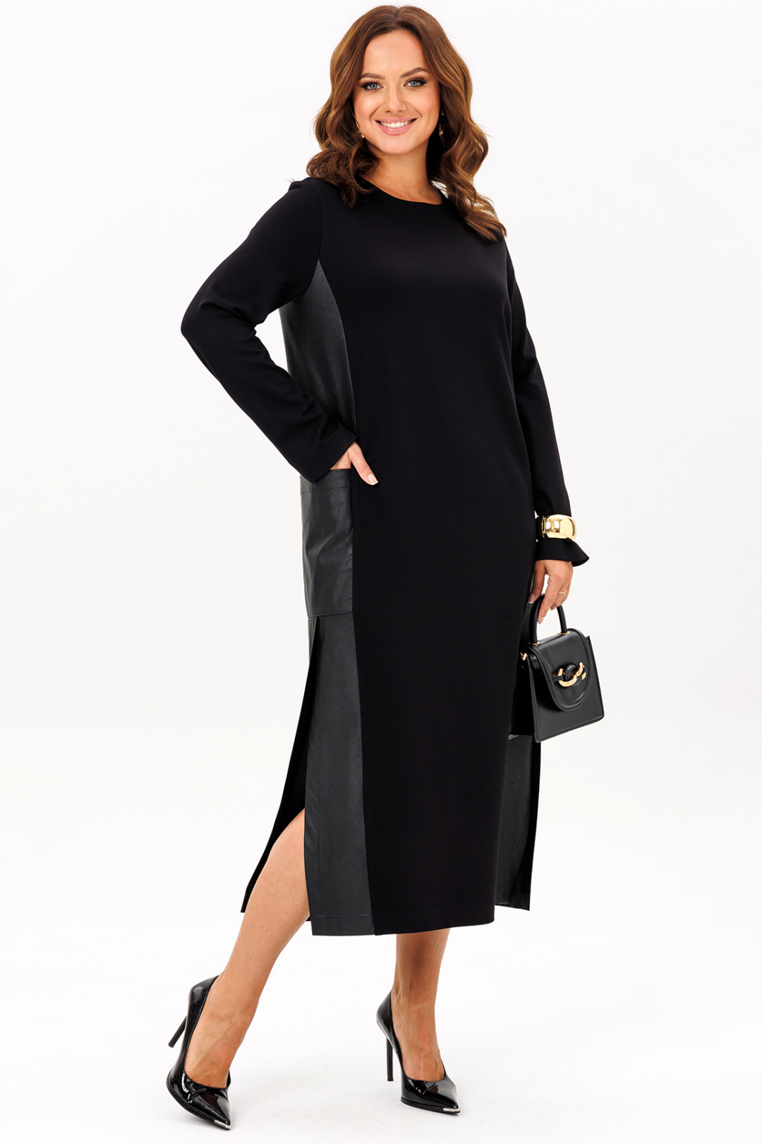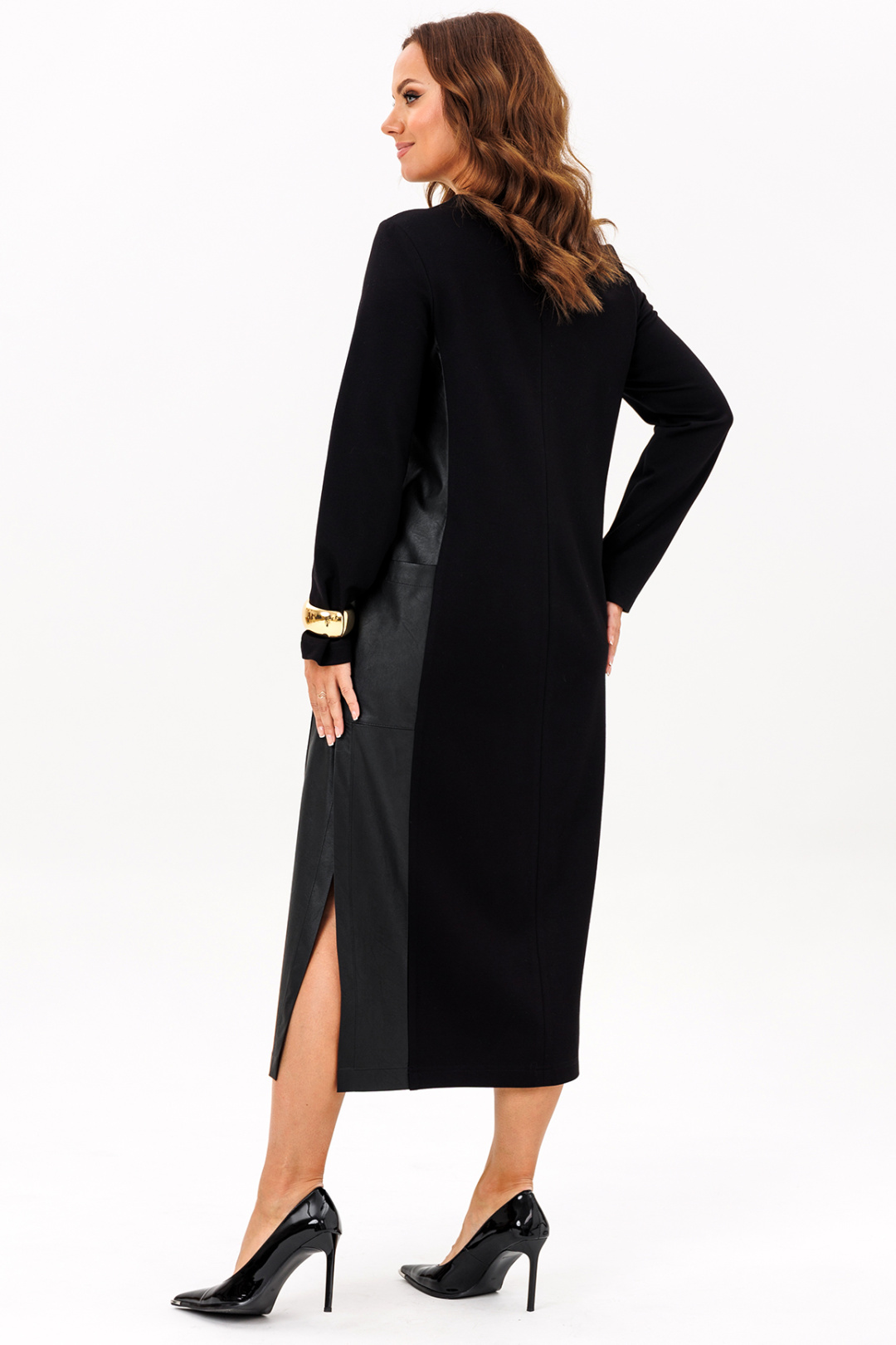 Платье выполнено из двух видов ткани: трикотажного полотна и эко кожи. Платье прямого силуэта. Горловина округлой формы обработана обтачкой. Рукав втачной. По переду и по спинке рельефы. По бокам накладные карманы, входящие в рельефные швы. Спинка со средним швом и потайной молнией.