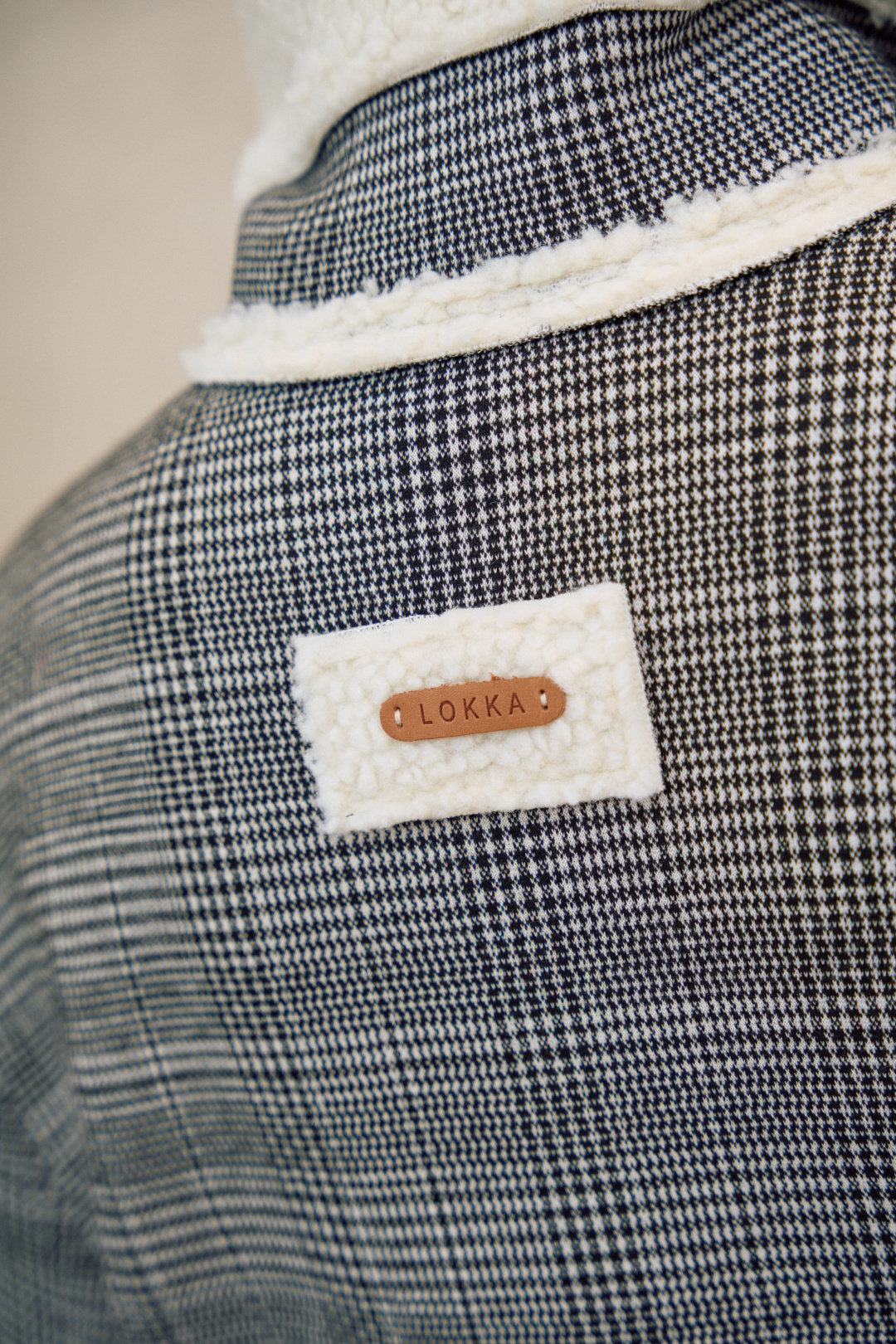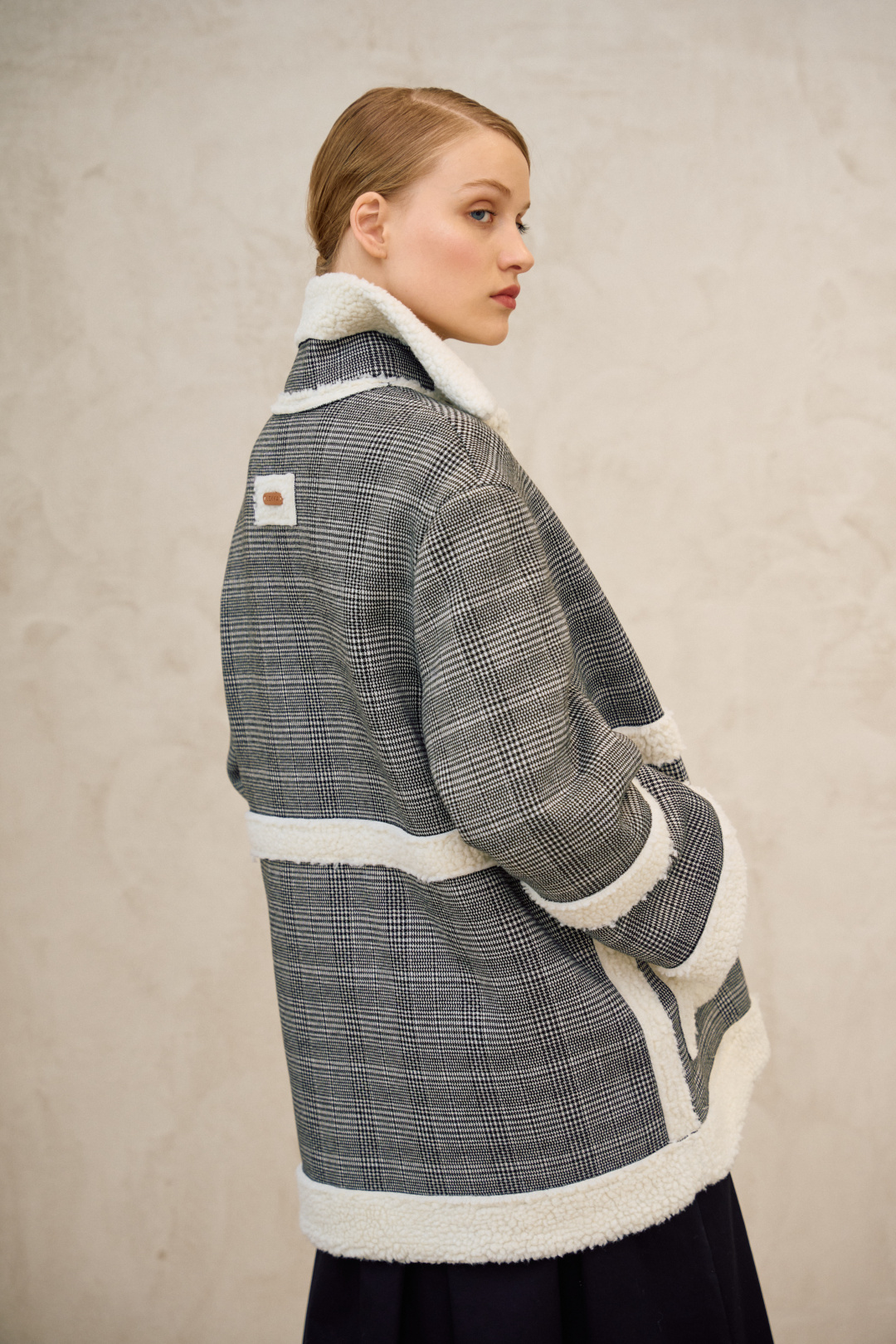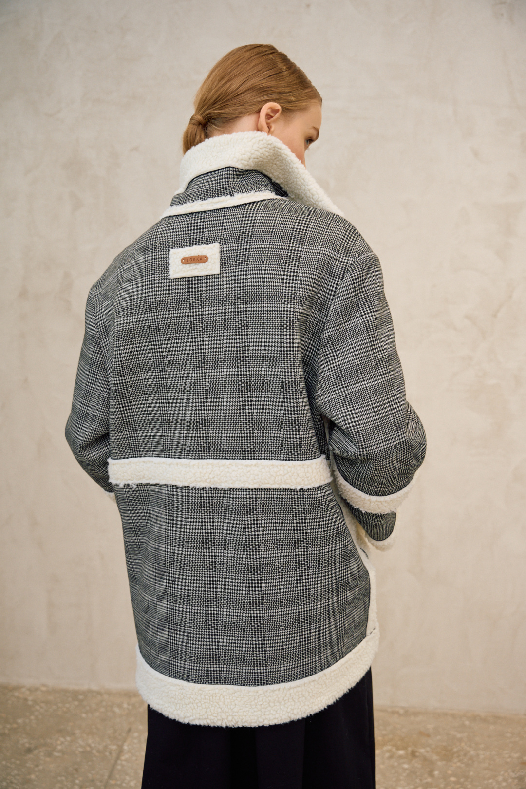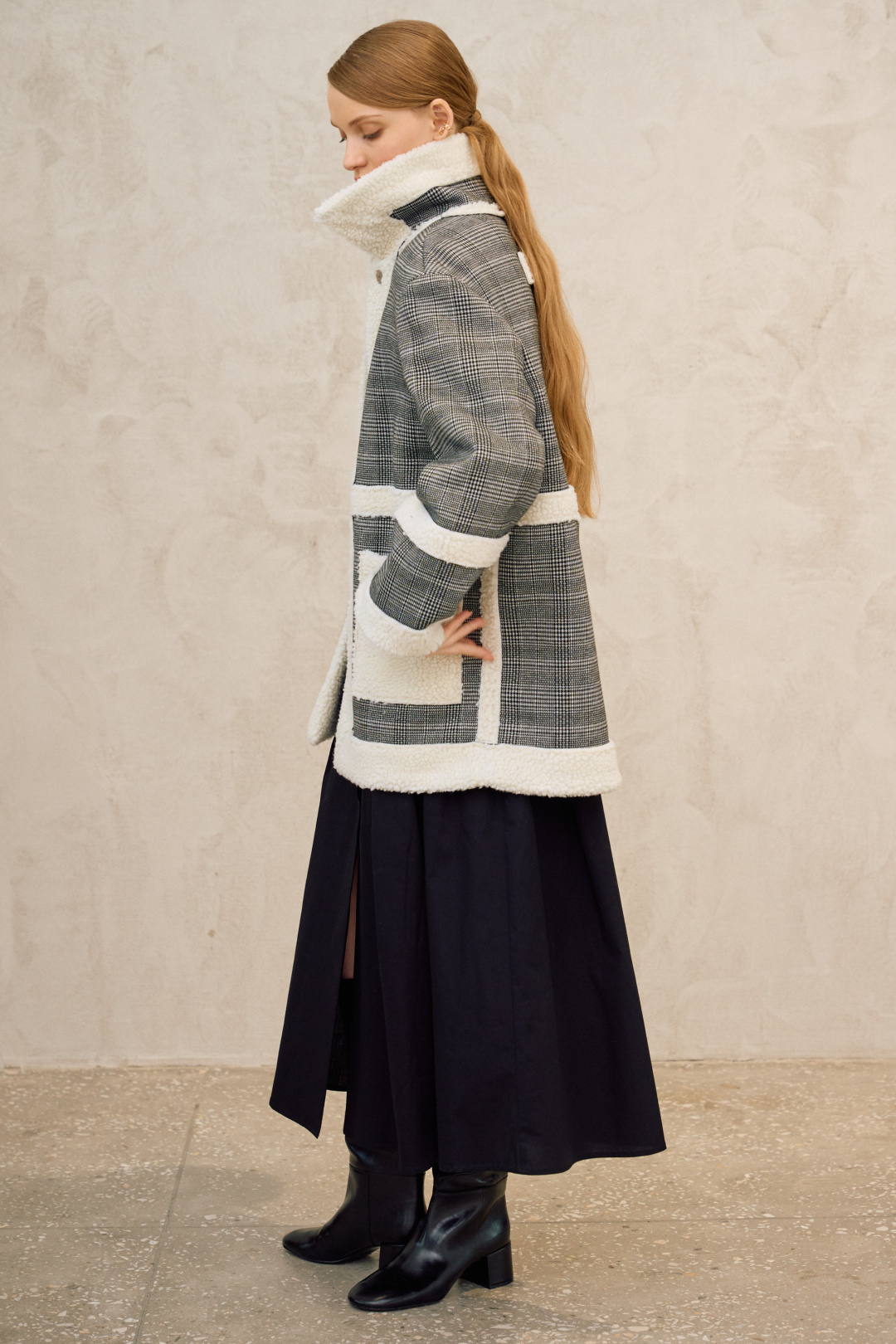 Полупальто свободного кроя. Линия плеча спущена, рукав длинный с отложной манжетой в области рукава подрез. Воротник рубашечного типа, отложной. Застежка центральная на потайные кнопки. Отделочная ткань по борту и низу изделия, по бокам накладные карманы.