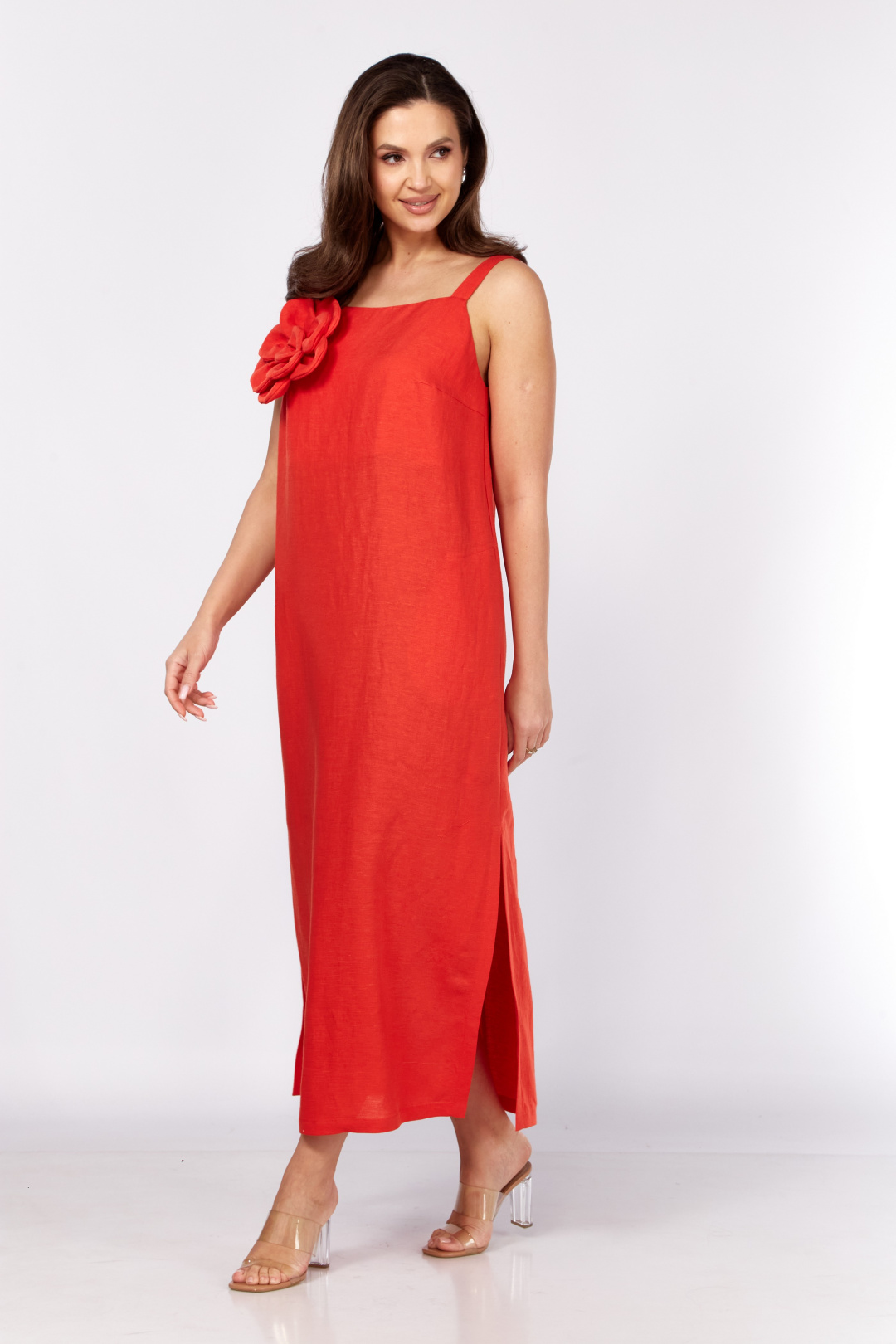 Платье - сарафан прямого силуэта,слегка расширенное к низу с карманами и разрезами в боковых швах. По спинке средний шов. По переду нагрудные вытачкии и съёмный декоративный цветок. Бретели легко регулировать .