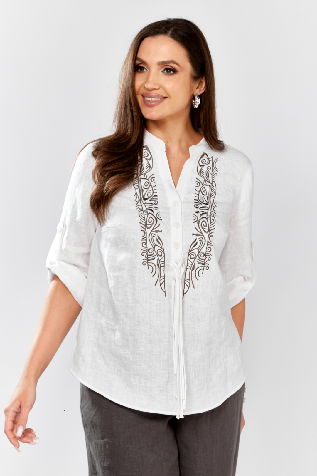 Блуза прямого силуэта.По спинке плечевые вытачки По переду нагрудные вытачки , по центру планка с застёжкой на петли и пуговицы.Вдоль планки одноцветная вышивка. Низ фигурный с разрезами в боковых швах.Воротник-стойка. Плечо слегка спущено. Рукав рубашечного покроя, 3/4 с застёжкой на пату и пуговицу