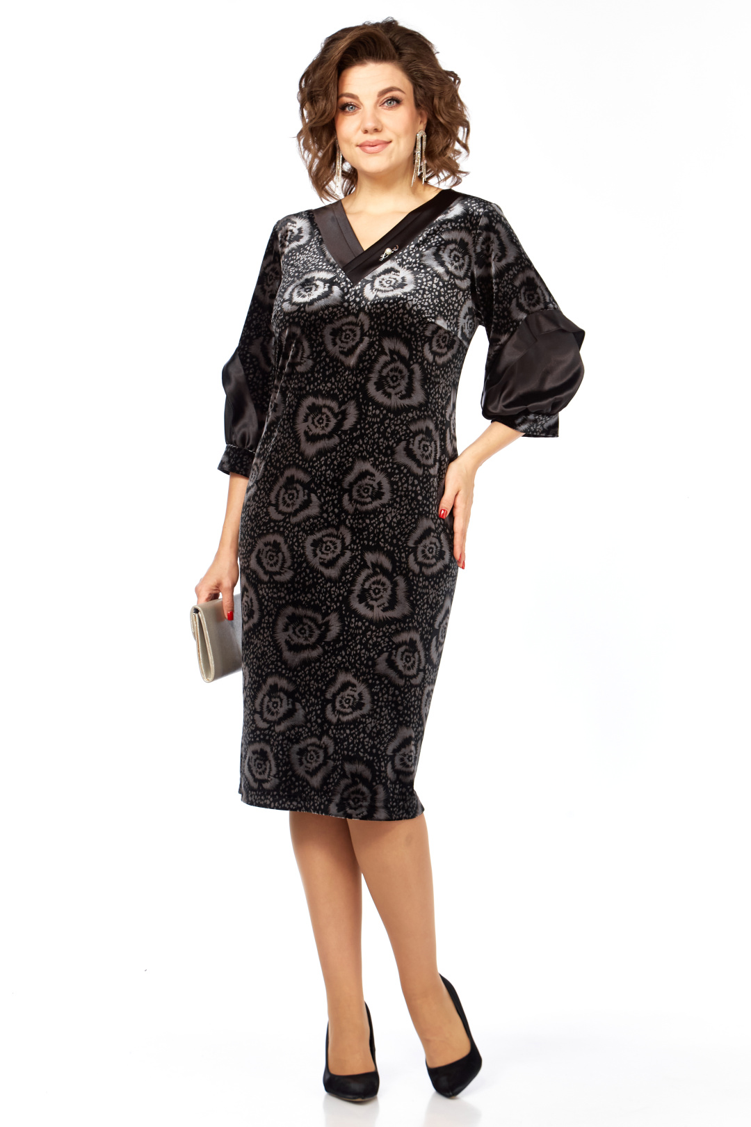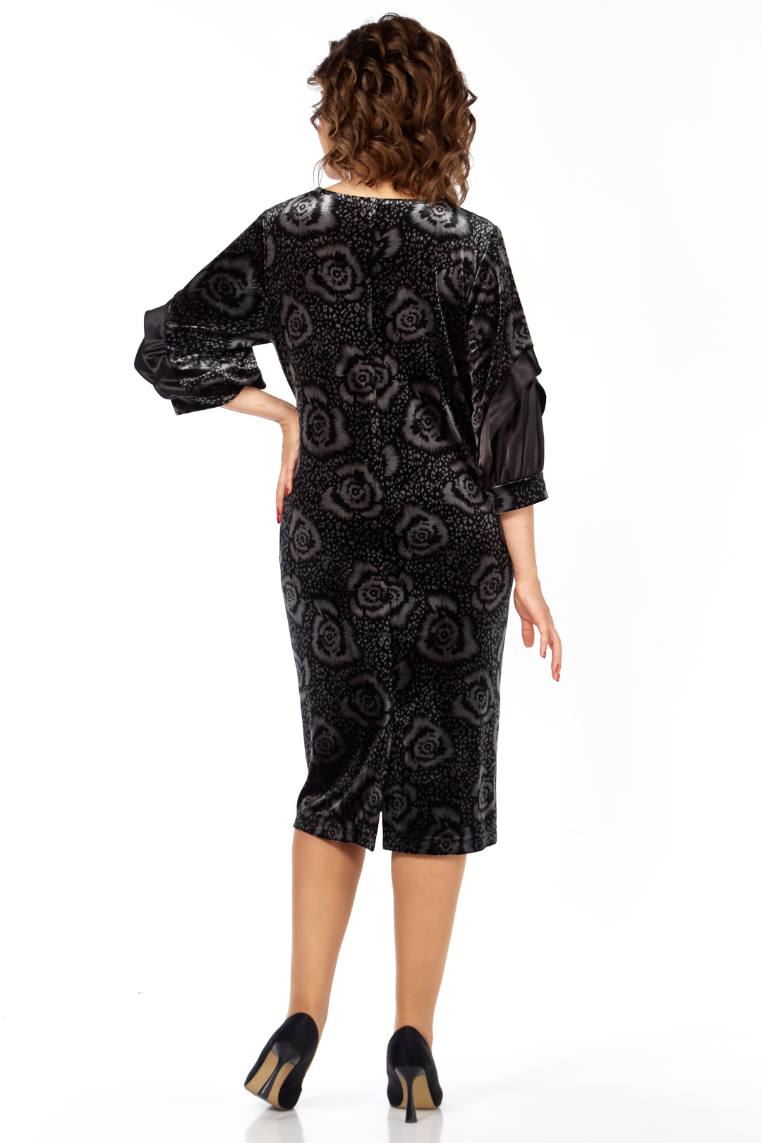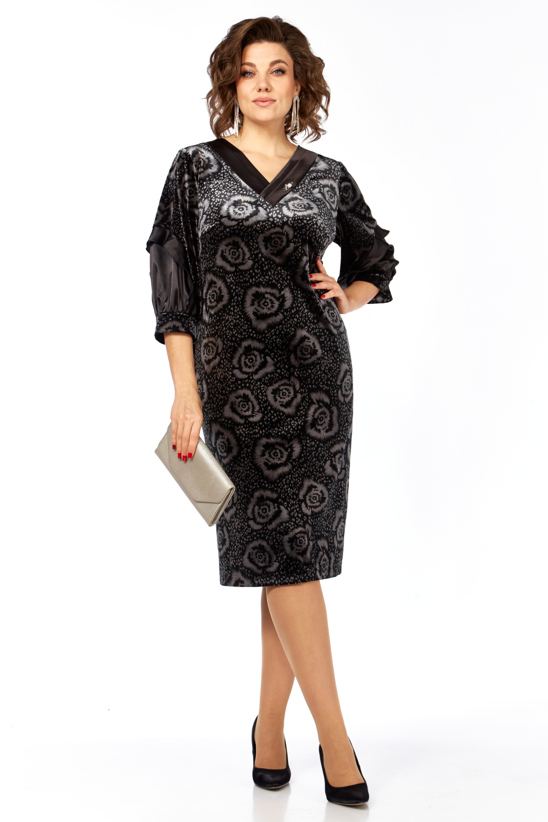 Платье женское прямого силуэта, из бархатного полотна с отделкой из однотона. Перед платья с нагрудными вытачками из боковых швов, V-образным вырезом горловины, обработанным декоративными планками из отделочной ткани, на планки нашит декоративный элемент. Спинка со средним швом и шлицей на движение в нем. Рукав втачной одношовный, на манжете, с отрезной деталью по низу и декоративной рюшей. Длина 105 см, длина рукава 45 см, ширина рукава на уровне глубины проймы 52-22,5 см,54-23,5 см, 56-24,5 см, 58-25 см. Реальные замеры платья 52 ог-108 см, от-110 см, об-116 см, 54 ог-112 см, от-114 см, об-120 см, 56 ог-116 см, от-118 см, об-124 см, 58 ог-120 см, от-122 см, об-128 см.