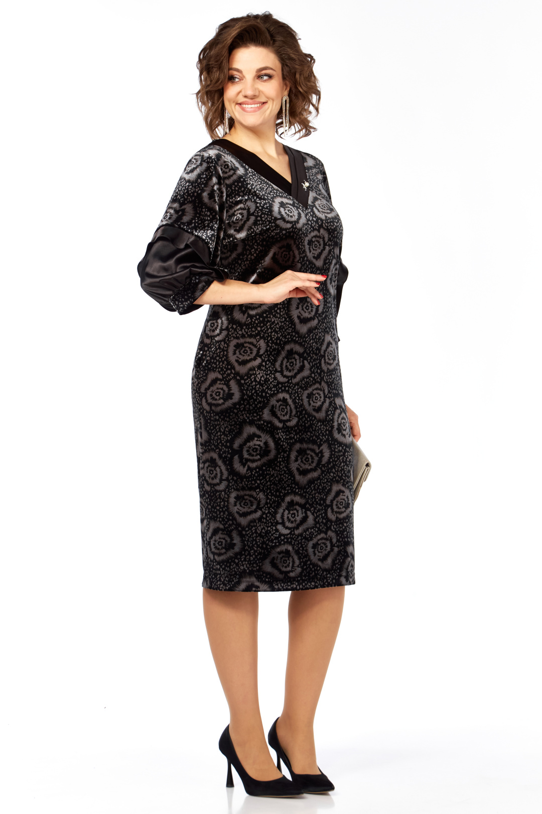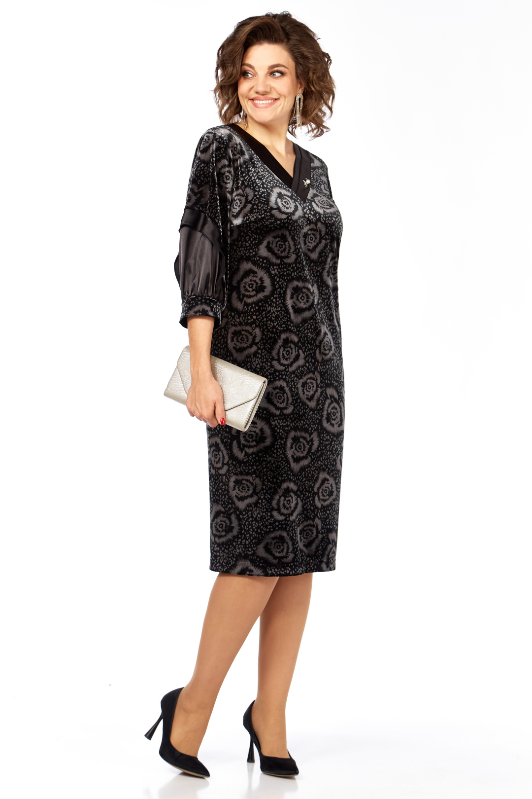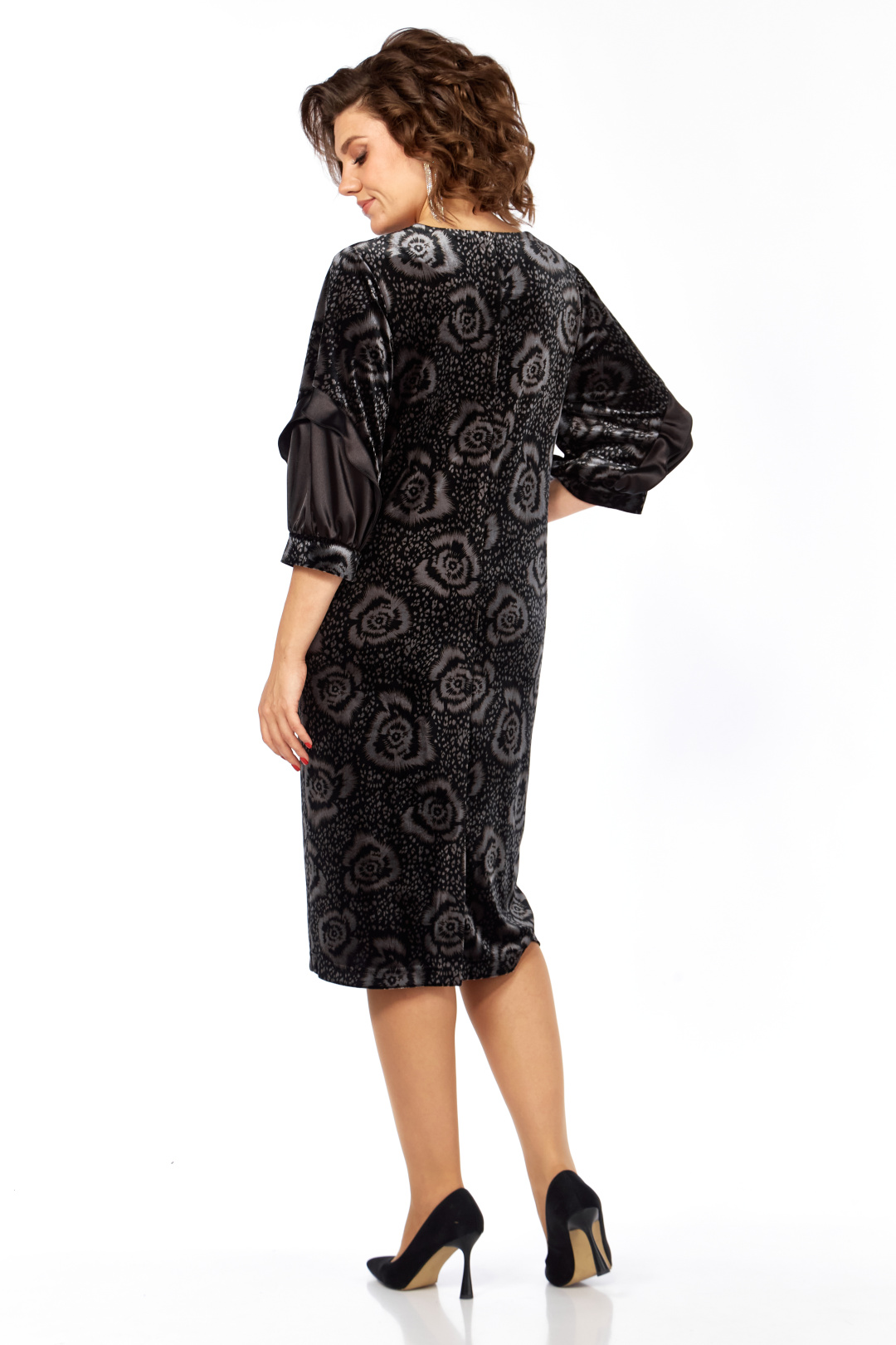 Платье женское прямого силуэта, из бархатного полотна с отделкой из однотона. Перед платья с нагрудными вытачками из боковых швов, V-образным вырезом горловины, обработанным декоративными планками из отделочной ткани, на планки нашит декоративный элемент. Спинка со средним швом и шлицей на движение в нем. Рукав втачной одношовный, на манжете, с отрезной деталью по низу и декоративной рюшей. Длина 105 см, длина рукава 45 см, ширина рукава на уровне глубины проймы 52-22,5 см,54-23,5 см, 56-24,5 см, 58-25 см. Реальные замеры платья 52 ог-108 см, от-110 см, об-116 см, 54 ог-112 см, от-114 см, об-120 см, 56 ог-116 см, от-118 см, об-124 см, 58 ог-120 см, от-122 см, об-128 см.