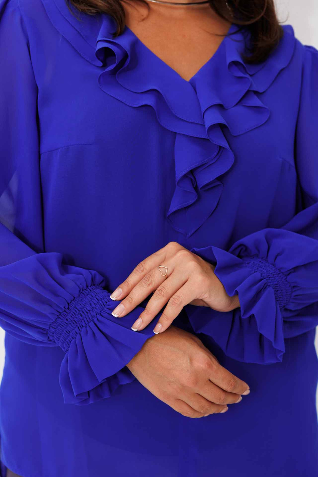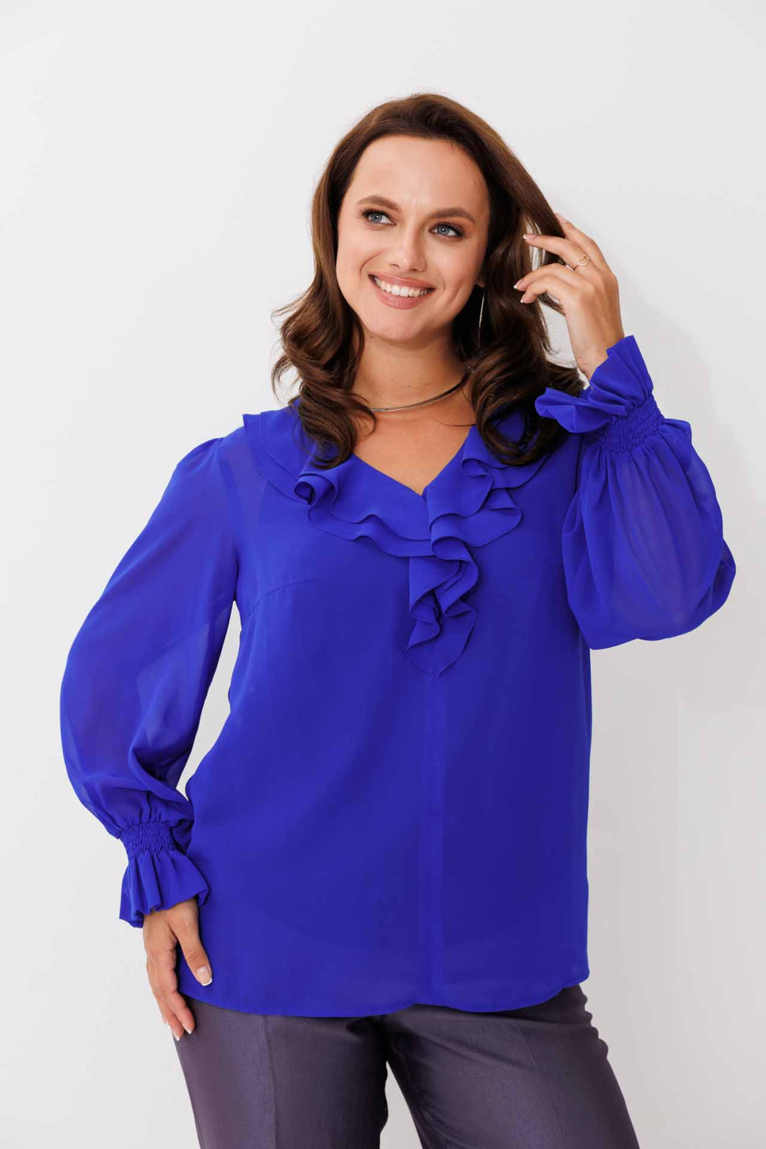 Блуза женская, выполненная в насыщенном синем цвете, придаст вашему образу изысканности и стиля. Заметной деталью является V-образный вырез, украшенный двойным воланом, который добавляет блузе женственности и нежности. Рукава втачные, с элегантными сборками по окату, расширяющиеся к низу, делают силуэт воздушным и легким. Низ рукава завершается манжетой на пуговице, придавая аккуратный вид всему изделию. В комплект также входит топ из 100% хлопка на регулируемых бретелях, который обеспечивает комфорт и удобство при носке. Эта блуза идеально подходит для создания как повседневных, так и более официальных ансамблей.