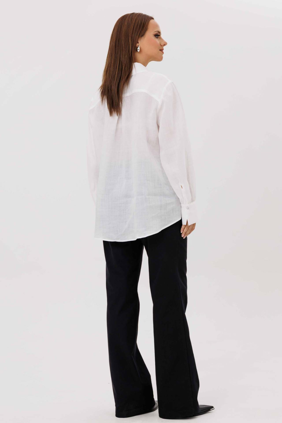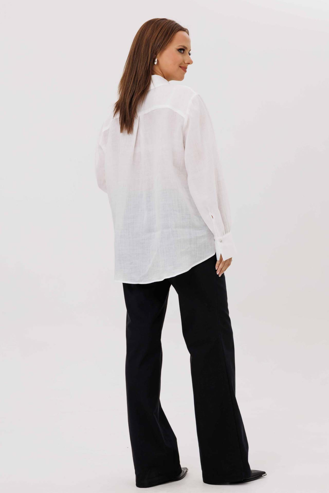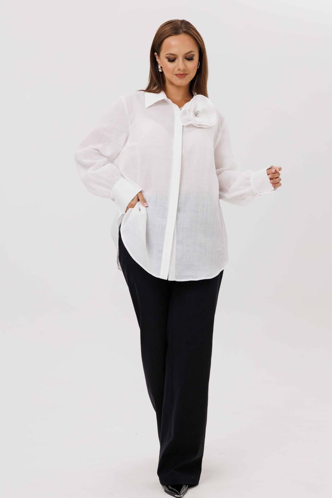 Элегантная женская блуза белого цвета идеально подойдет как для офиса, так и для торжественного мероприятия. Модель прямого силуэта выполнена из приятного на ощупь материала, обеспечивающего комфортное ношение на протяжении всего дня. Блуза оснащена потайной застежкой на пуговицы, что придает изделию аккуратный внешний вид. Особенностью модели является рубашечный воротник с отрезной стойкой. Нагрудные вытачки на передней части и отрезная кокетка на спинке хорошо сидят по фигуре. Рукава блузы длинные, одношовные, завершаются аккуратной манжетой. Изысканный акцент добавляет съемный декоративный цветок на пуговице, который можно носить по желанию, в зависимости от настроения или случая. Низ изделия фигурный, дополнительно подчеркивающий стилистическую завершенность образа. Эта блуза — прекрасный выбор для женщин, которые предпочитают классику с элементами оригинальности.