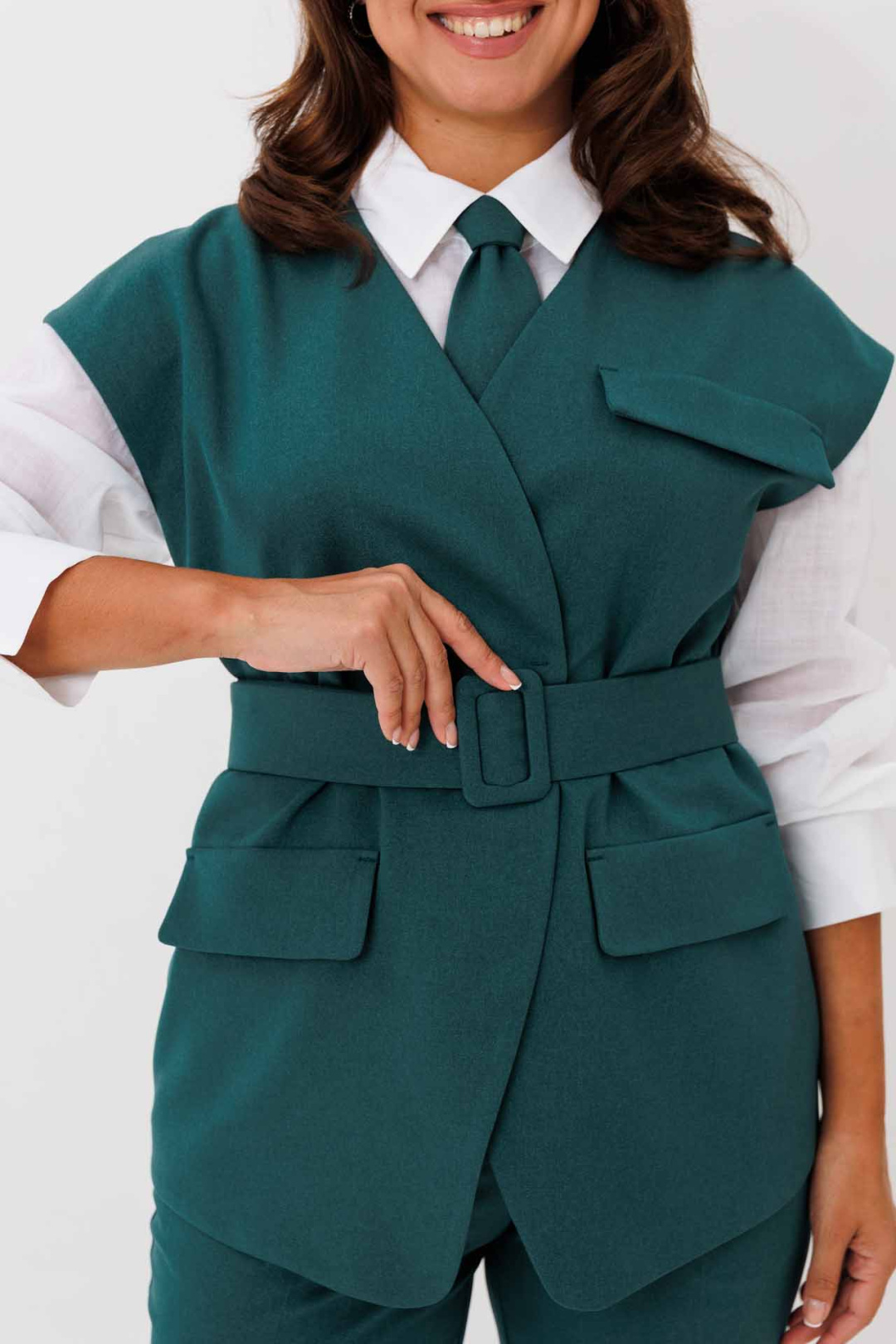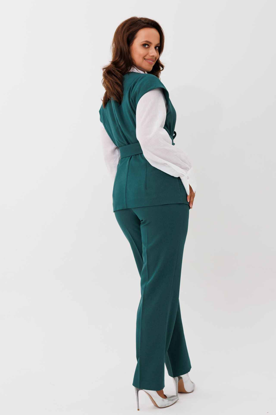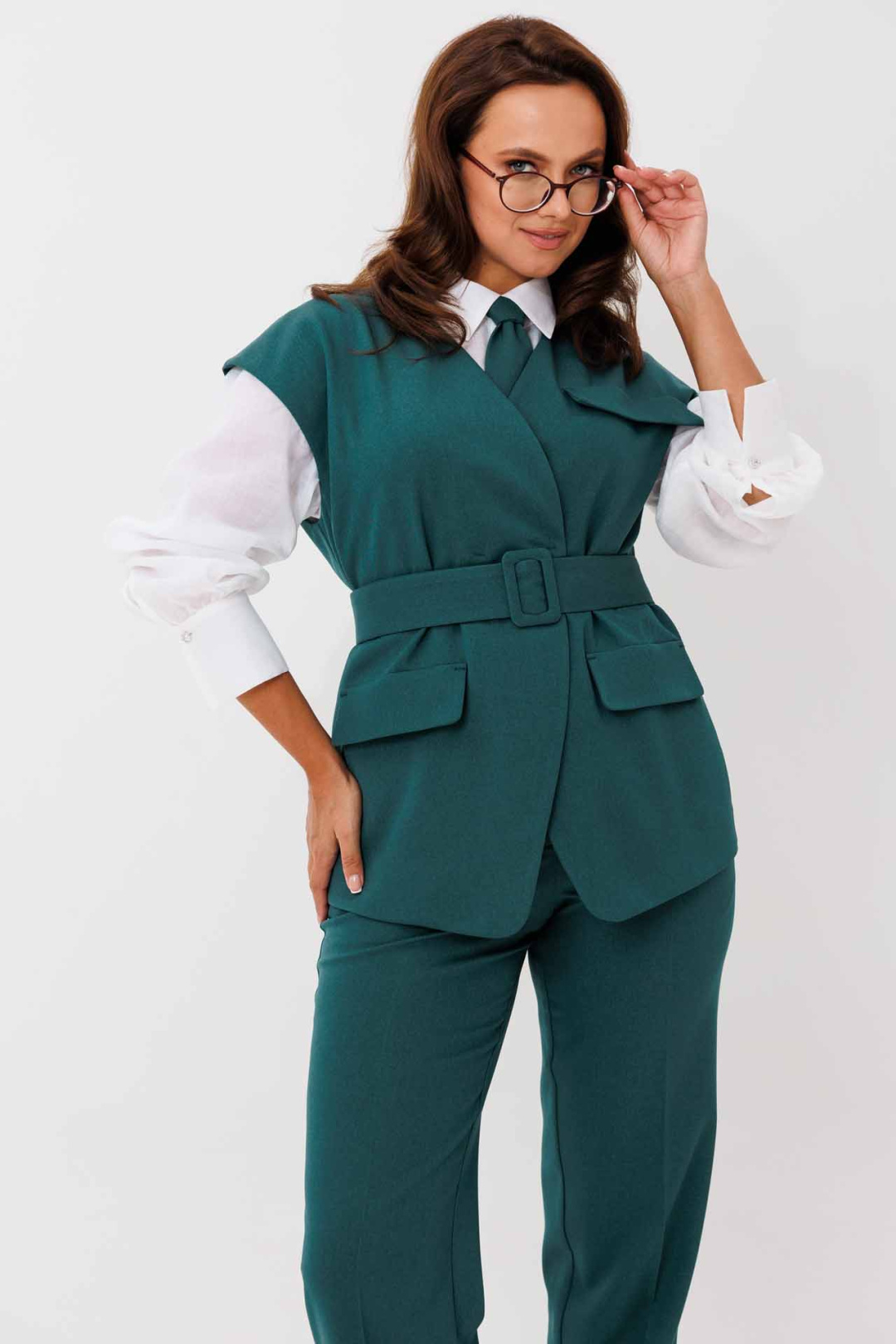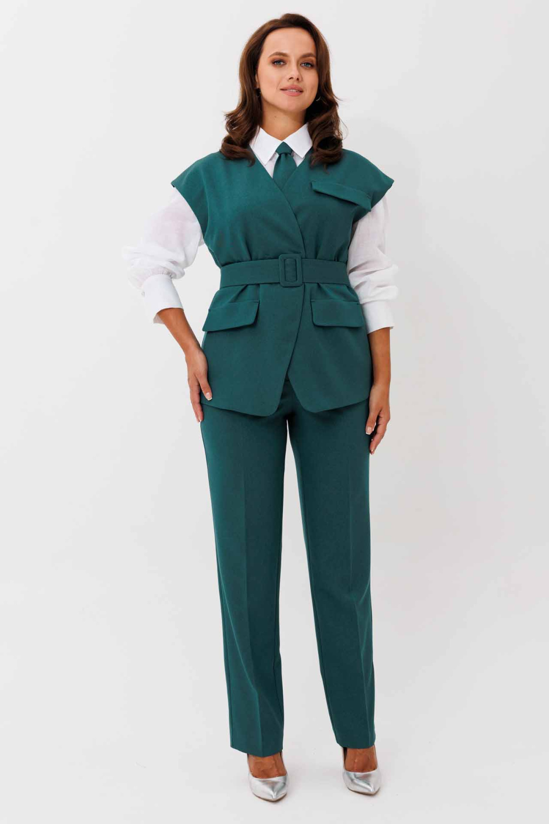 Комплект женский, состоящий из жилета, блузы, брюк и галстука. Жилет полуприлегающего силуэта, без подкладки. Плечо спущенное.Вырез V - образный, с воротником стойкой. По переду иммитация карманов с клапаном. Центральная застежка на пришивные кнопки. Спинка со средним швом и вытачками. Блуза женская, прямого силуэта с потайной застежкой. Перед с нагрудными вытачками. Спинка с отрезной кокеткой. Воротник рубашечного типа, с отрезной стойкой. Рукав тачной, одношовный, с манжетой по низу. Низ фигурный. Галстук на резинке. Брюки прямого силуэта, слегка зауженные к низу. Пояс частично на резинке (по бокам), с шлевками для ремня. Застежка на гульфик с молнией и пуговицей. По бокам карманы с косым входом. Материал костюма костюмный, средней плотности, с гладкой фактурой. Без подкладки. Дополняет модель широкий пояс.