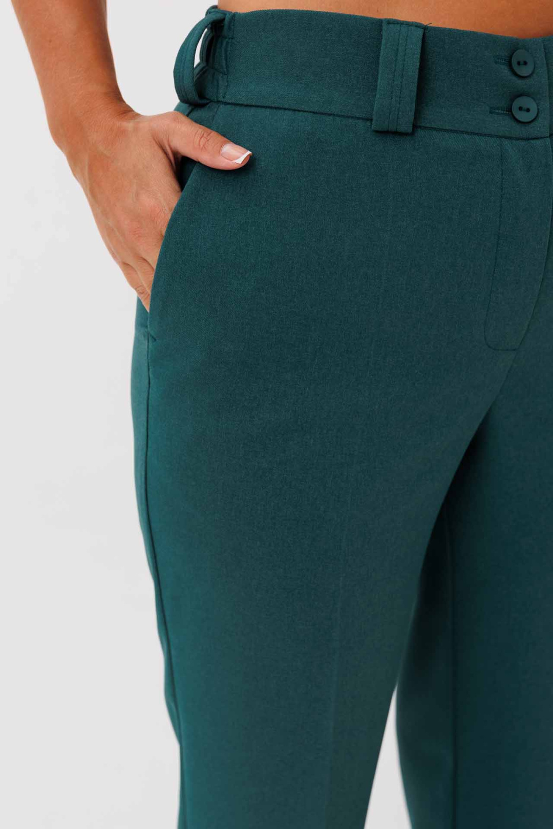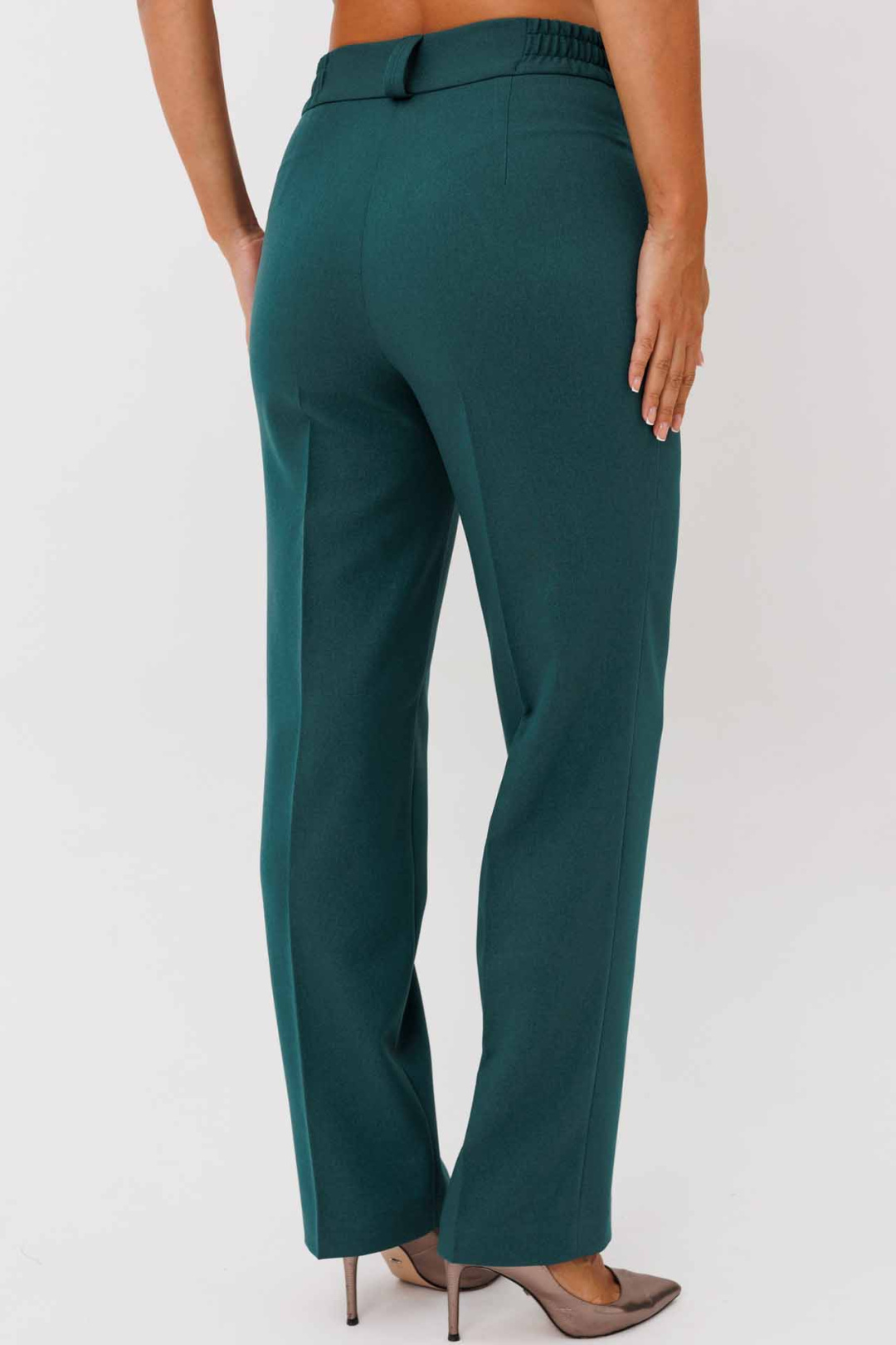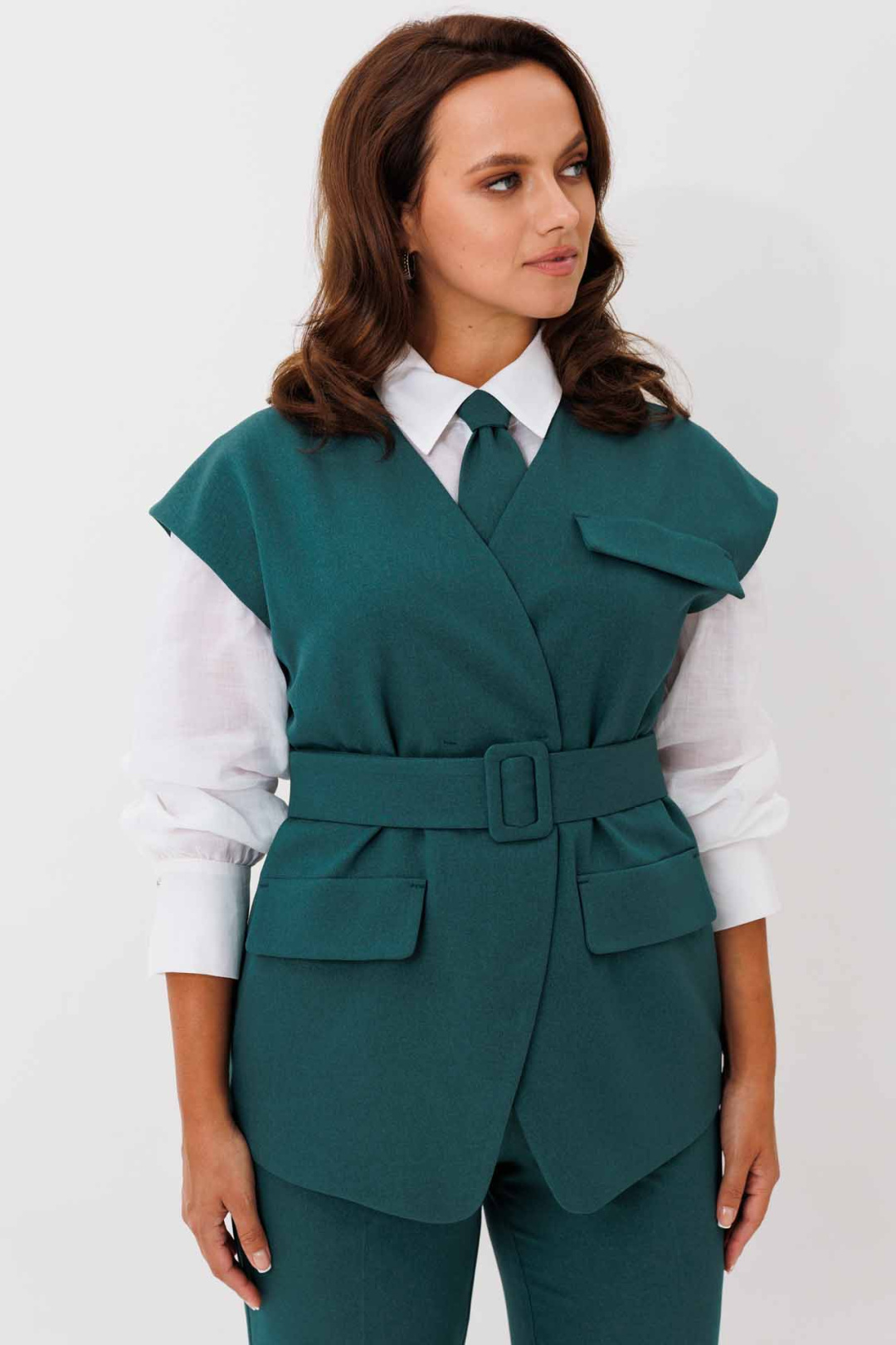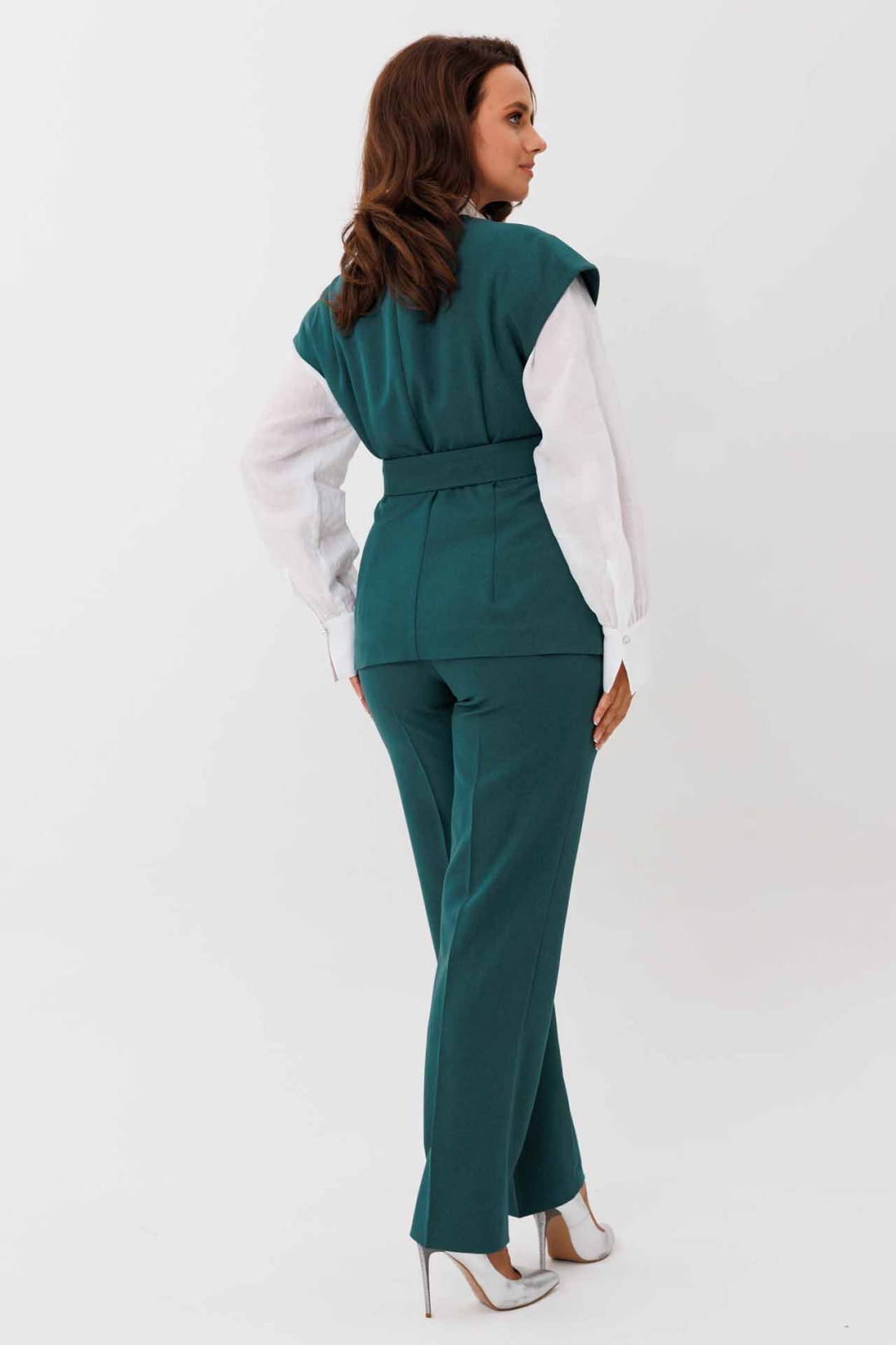 Комплект женский, состоящий из жилета, блузы, брюк и галстука. Жилет полуприлегающего силуэта, без подкладки. Плечо спущенное.Вырез V - образный, с воротником стойкой. По переду иммитация карманов с клапаном. Центральная застежка на пришивные кнопки. Спинка со средним швом и вытачками. Блуза женская, прямого силуэта с потайной застежкой. Перед с нагрудными вытачками. Спинка с отрезной кокеткой. Воротник рубашечного типа, с отрезной стойкой. Рукав тачной, одношовный, с манжетой по низу. Низ фигурный. Галстук на резинке. Брюки прямого силуэта, слегка зауженные к низу. Пояс частично на резинке (по бокам), с шлевками для ремня. Застежка на гульфик с молнией и пуговицей. По бокам карманы с косым входом. Материал костюма костюмный, средней плотности, с гладкой фактурой. Без подкладки. Дополняет модель широкий пояс.