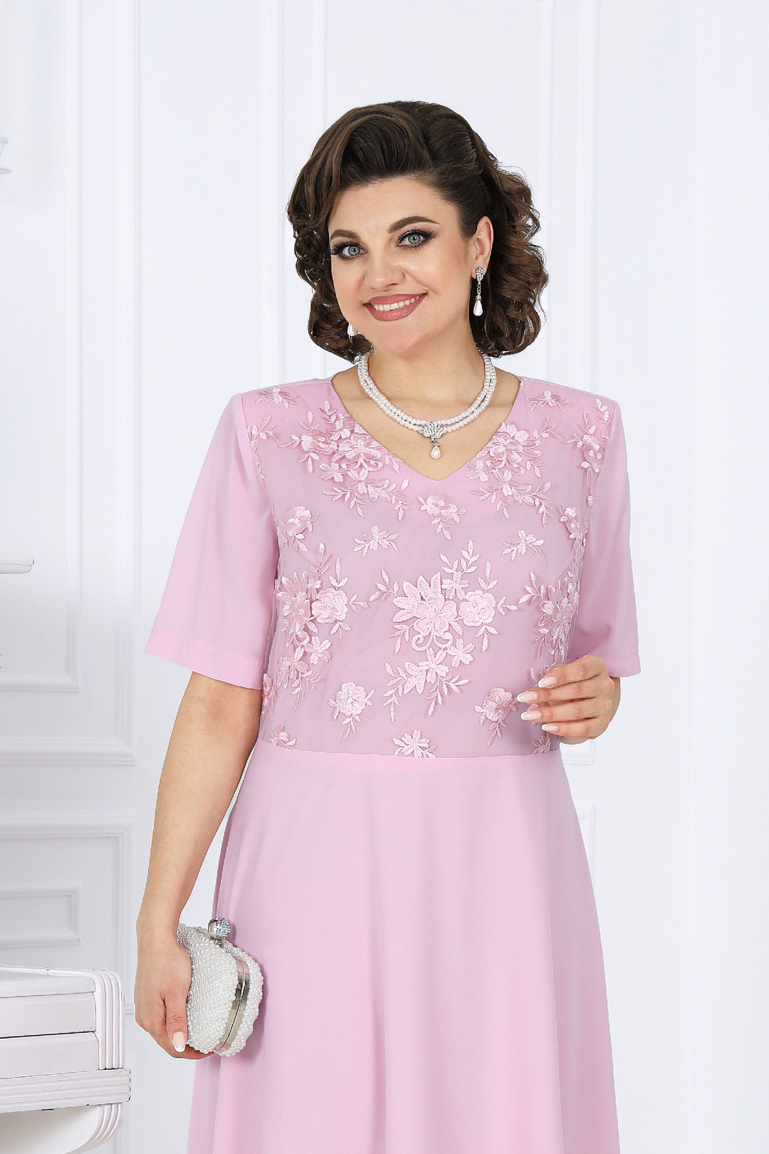 Платье приталенного силуэта, расклешенное к низу, выполнено из плательного стрейч-шифона и гипюра в цвет основной ткани. Модель с плечевыми накладками. Платье отрезное по линии талии: юбка на трикотажной подкладке; спинка лифа с талиевыми вытачками, перед – с нагрудными вытачками, направленными от пройм. Перед лифа двухслойный: нижний выполнен из шифона, верхний из гипюра. В среднем шве спинки обработана застежка на потайную тесьму-«молнию» (50 см). Горловина округлой формы по спинке и V-образная спереди. Рукав втачной, короткий, выполнен из шифона. Длина платья – 140 см, длина рукава – 28 см.
