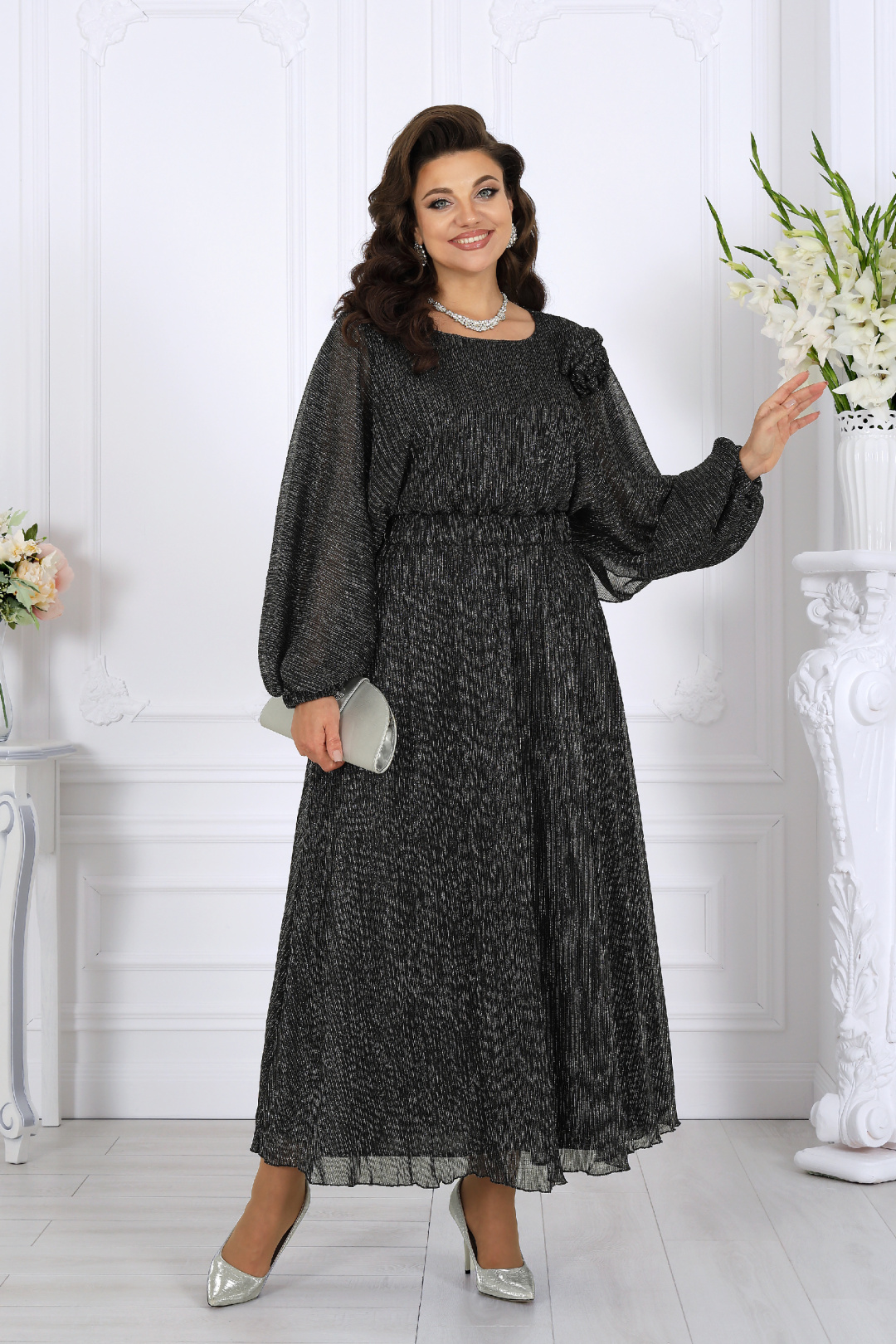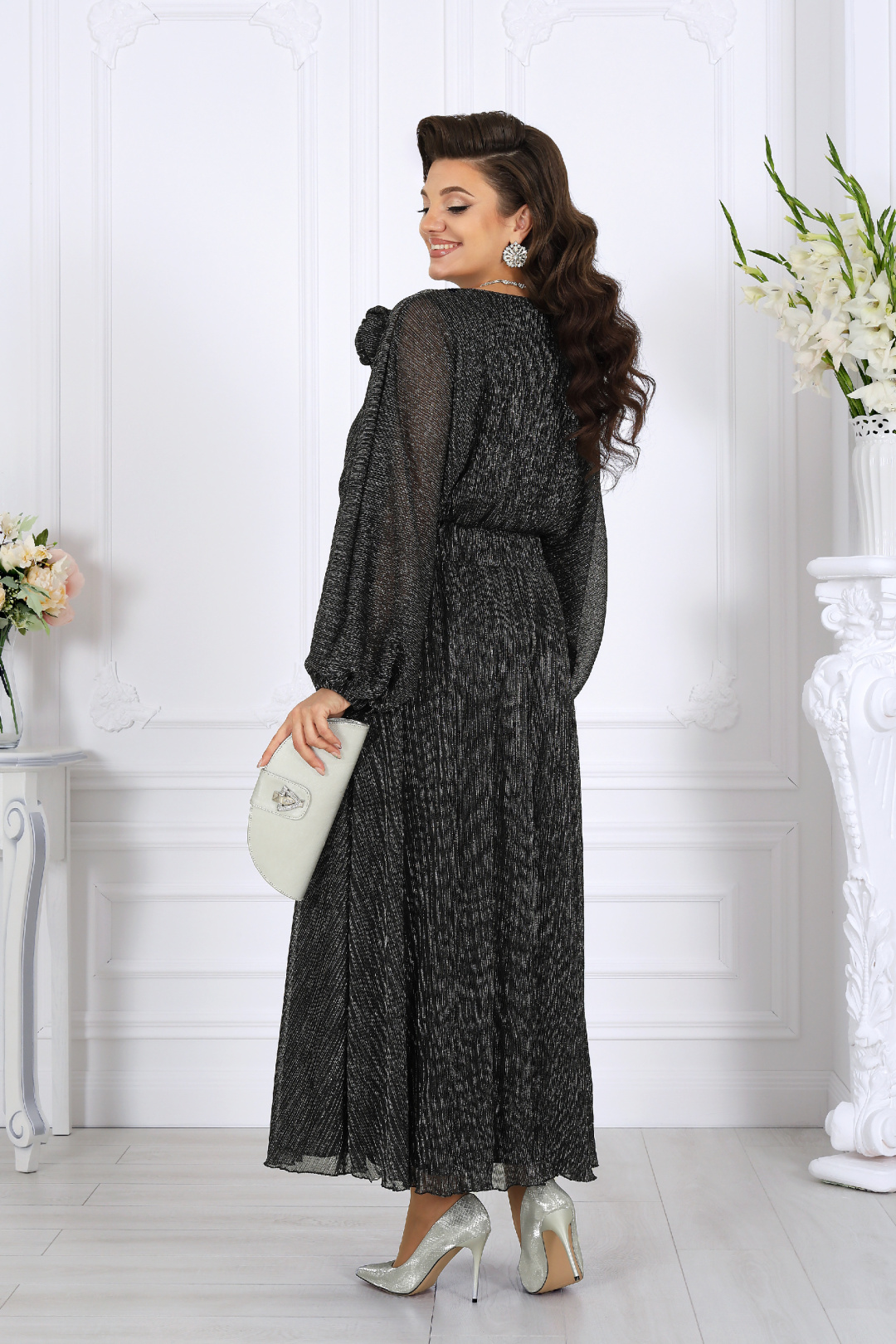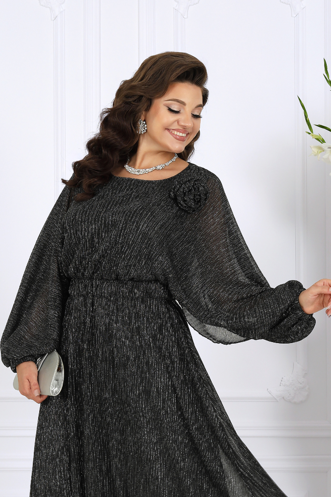 Элегантное вечернее платье в пол, созданное из воздушной сетки-гофре с нитью люрекс, — истинное воплощение праздничного блеска и женственности. Легкое мерцание ткани при каждом движении создает ощущение роскоши, а струящаяся юбка в пол формирует безупречный силуэт. Лиф со свободной посадкой деликатно драпируется, подчеркивая утонченность образа, а эластичная вставка на талии обеспечивает комфорт и идеальную посадку для фигур разных типов, включая большие размеры. Особый акцент — летящие рукава с разрезами и мягкой сборкой на манжетах, которые добавляют легкости и выразительности. Платье дополнено изысканной съемной декоративной деталью в виде «цветка», выполненного из основного полотна, что подчеркивает дизайнерский характер модели. Универсальное по стилю, оно идеально для самых значимых событий: свадеб, юбилеев, торжественных приемов или праздничных вечеров. Платье женское, приталенного силуэта, выполнено из сетки-гофре с нитью «люрекс». Модель на трикотажной подкладке, без застежки и плечевых накладок. Платье отрезное по линии талии, со свободным лифом и расширенной к низу юбкой. Для лучшего прилегания в области талии в отрезном поясе предусмотрена эластичная лента, вставленная по всей длине. Лиф цельнокроеный с рукавами, без боковых швов -- с разрезами от талии до манжет. Для регулирования длины рукава внутрь манжеты протянута эластичная лента. Горловина округлая, окантована узкой косой бейкой из основного материала. Платье дополнено съемным «цветком» з основного полотна. Длина платья (от горловины спинки) – 139 см, длина платья (от талии спинки) – 97 см; длина рукава (от горловины до манжеты) – 70 см (50-52 р-р), 71 см (54-58 р-р).