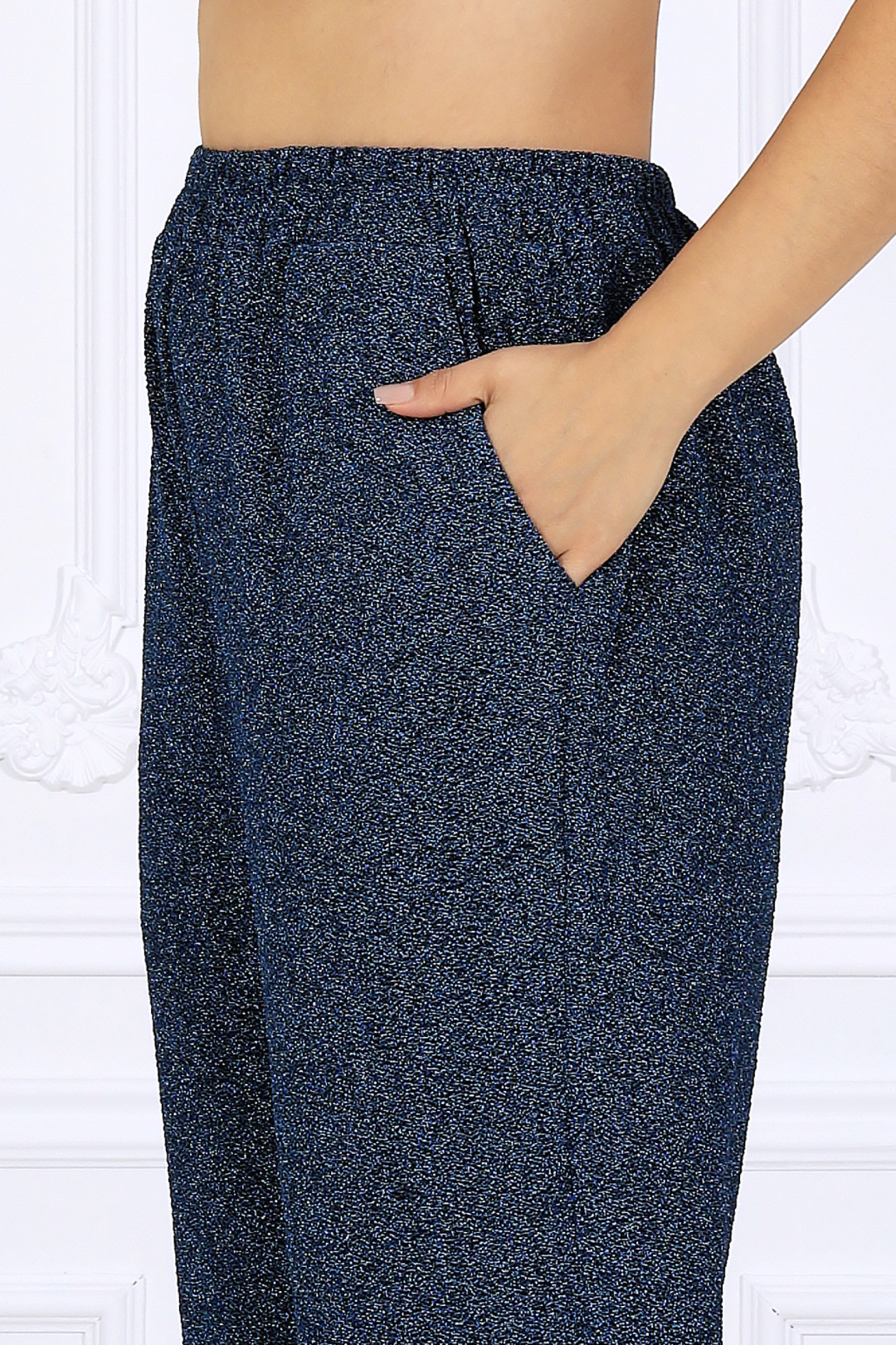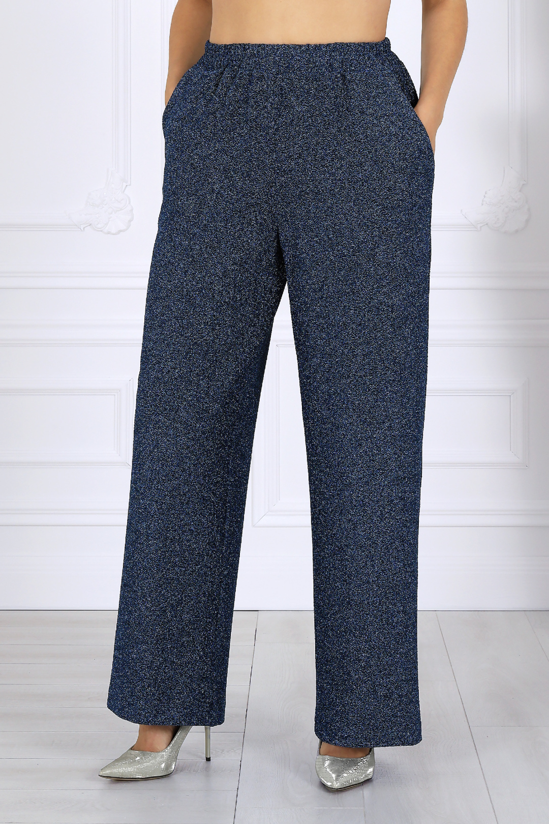 Это не просто наряд — это ваша уверенность, статус и блеск, который будет сопровождать каждый ваш шаг. В этом костюме каждая деталь продумана так, чтобы создавать ощущение безупречного стиля и лёгкой роскоши. Мягкое мерцание люрекса делает образ выразительным и дорогим, а утончённый крой подчёркивает женственность и гармонию силуэта. Блузка с асимметричной деталью по линии талии — это модный акцент, который визуально формирует стройный силуэт и придаёт образу дизайнерскую изысканность. Нежная линия декольте в обрамлении округлой горловины элегантно подчёркивает женственность. Брюки прямого силуэта с комфортной посадкой — символ утончённой простоты и свободы. Эластичный пояс обеспечивает удобство, а мерцающая фактура ткани делает их достойным элементом вечернего гардероба. Такой костюм создан для особых случаев: новогодних вечеров, корпоратива, праздничного ужина или выхода в свет, но при этом он настолько универсален, что легко впишется и в деловой стиль. Комплект брючный 2-х предметный, состоящий из блузки и брюк. Блузка полуприлегающего силуэта, выполнена из трикотажного полотна с фактурной лицевой стороной «люрекс». Модель без подкладки, с плечевыми накладками. Спинка с талиевыми вытачками и средним швом. По линии талии в левой части переда – горизонтальный подрез с односторонними складками и отлетной деталью в шве. По линии талии в правой части переда обработан цельнокроеный пояс, край которого крепится в левом боковом шве. Горловина округлая, углубленная спереди. Рукав длинный, втачной. Длина блузки – 62 см. Длина рукава – 57 см. Брюки длинные, с посадкой на талии, выполнены из трикотажного полотна с фактурной лицевой стороной «люрекс». Модель без стрелок, без застежки. Спереди обработаны наклонные боковые карманы. Для лучшего прилегания по линии талии в притачном поясе предусмотрена эластичная лента, вставленная по всей длине. Длина брюк по боковому (с поясом) – 106 см (50-52 р-р), 107 см (54-58 р-р).
